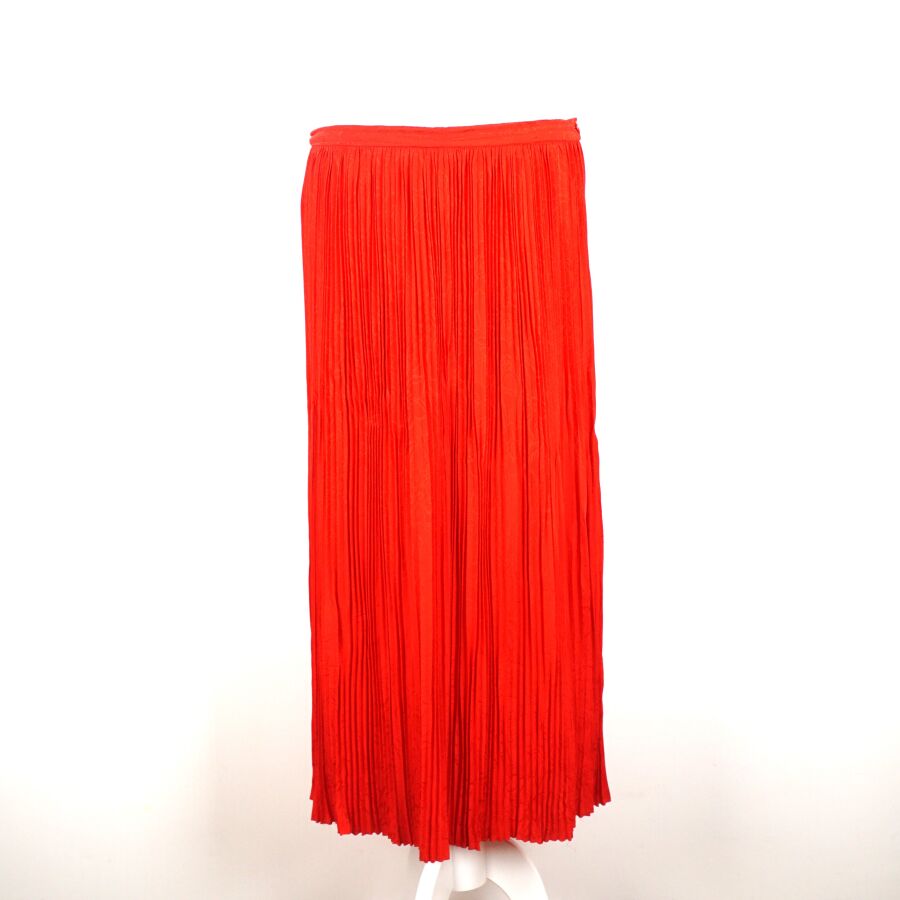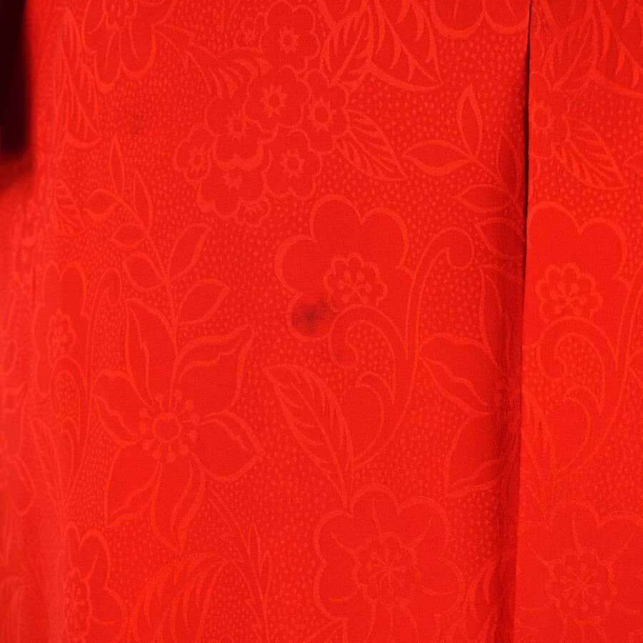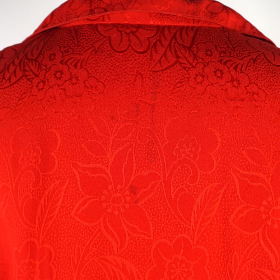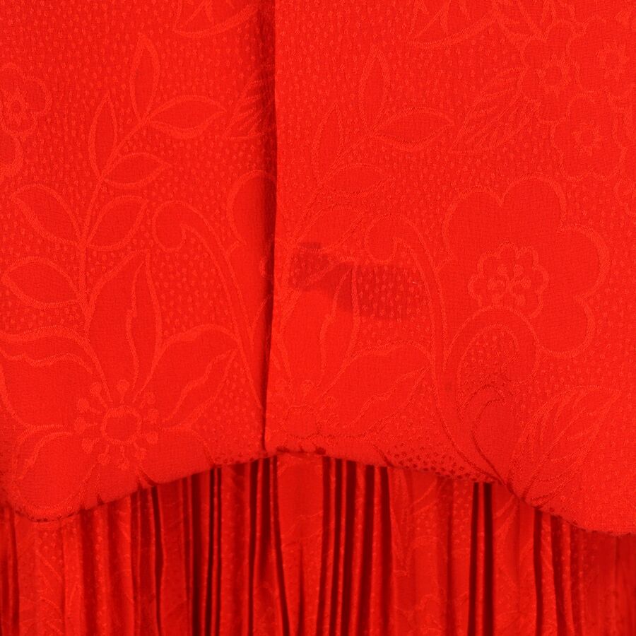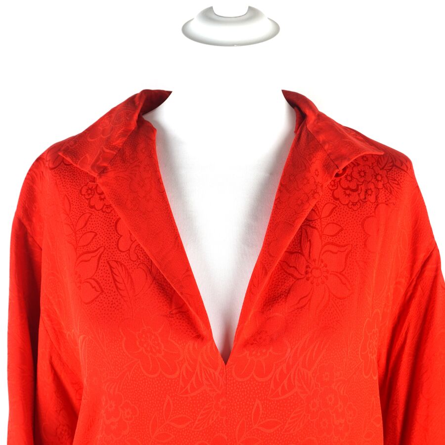 CHRISTIAN DIOR - BOUTIQUE : Ensemble en soie rouge comprenant un haut type tunique, col en V dit tailleur, manche 3/4, fendu en partie basse, et sa jupe plissée, fermeture à la taille par un bouton, un crochet et une fermeture zippée, étiquettes intérieures, taille supposée M, L. Tunique : 84.5 cm. L. Jupe : 82 cm. Larg. Jupe : 43 cm (quelques taches, fils tirés).