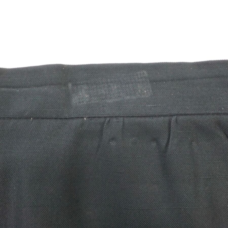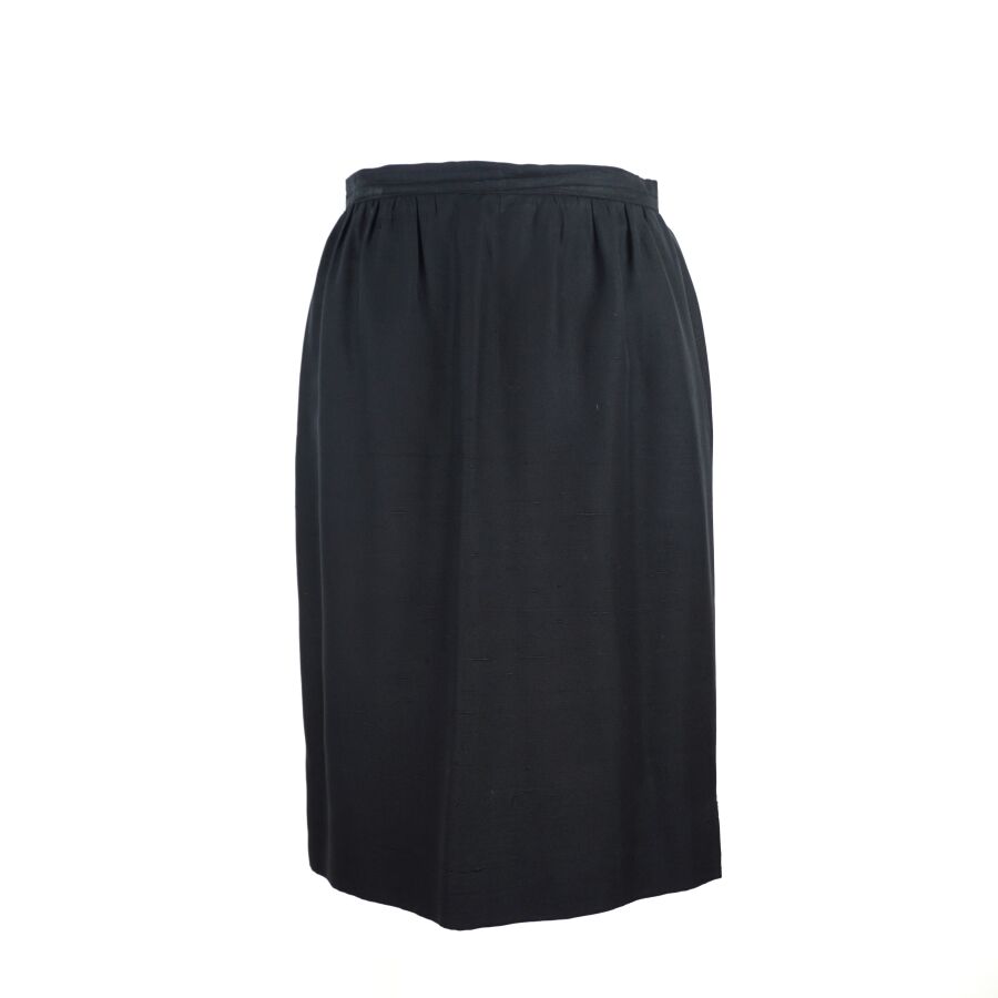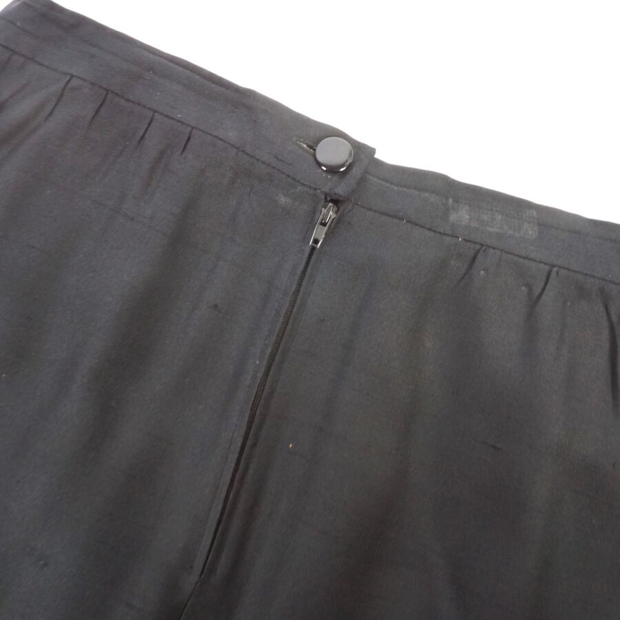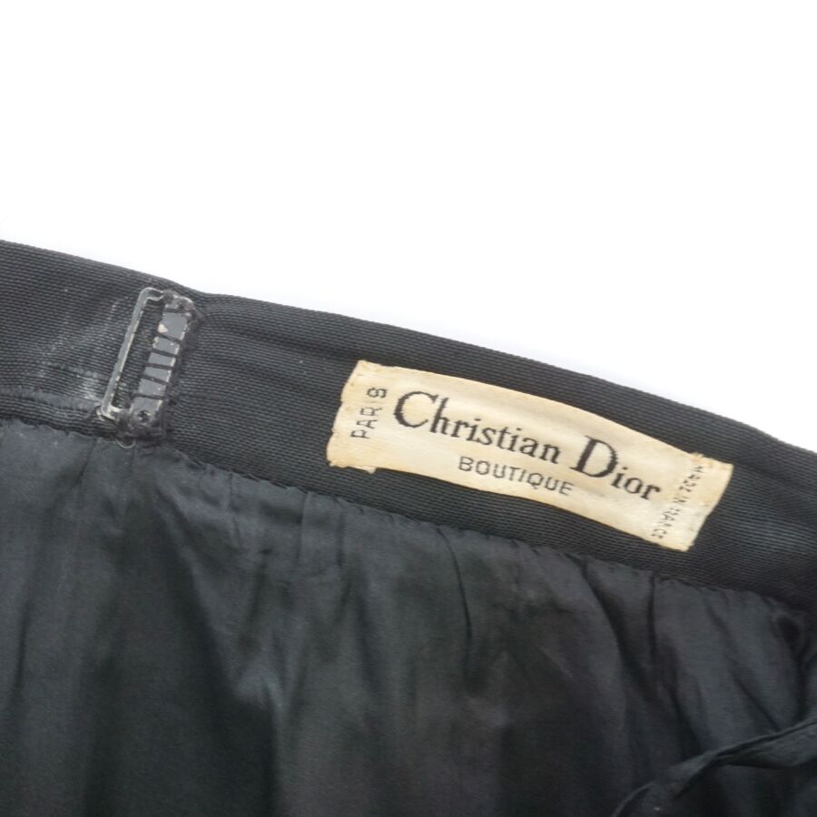 CHRISTIAN DIOR - BOUTIQUE : Jupe droite en soie de couleur noire, fermeture à la taille par un bouton, un crochet et une fermeture zippée, étiquette intérieure, deux poches latérales, L. 59.5 cm. Larg. Taille : 34.5 cm (fils tirés, traces et accroc).