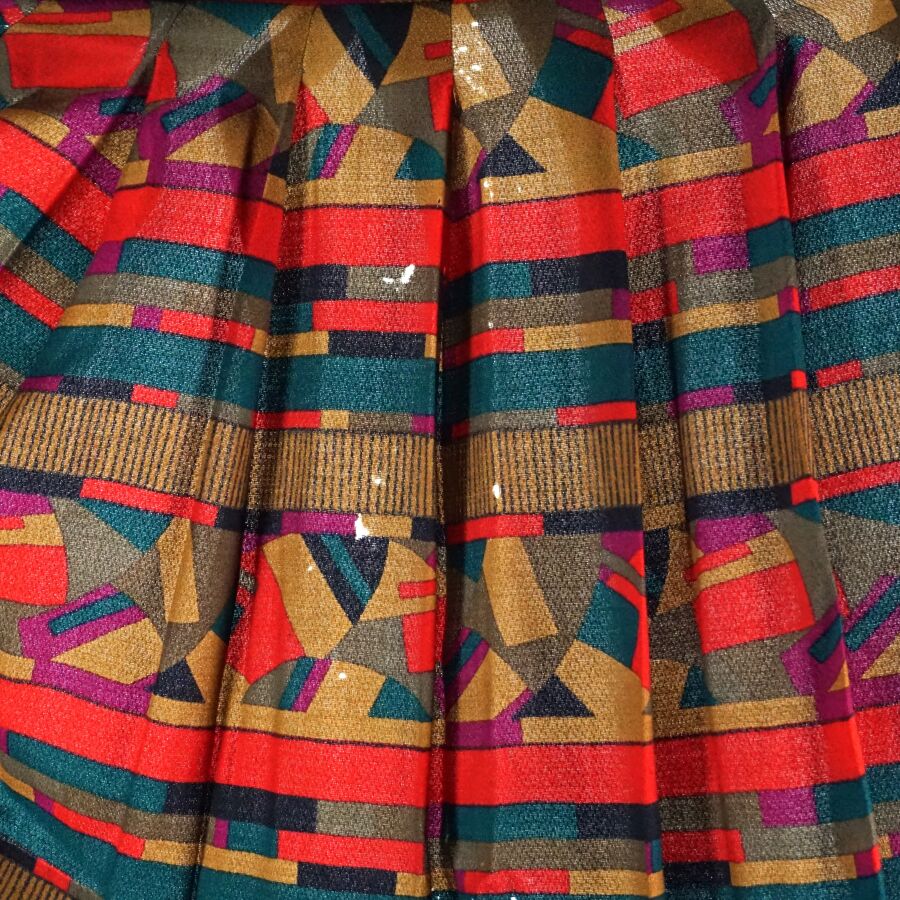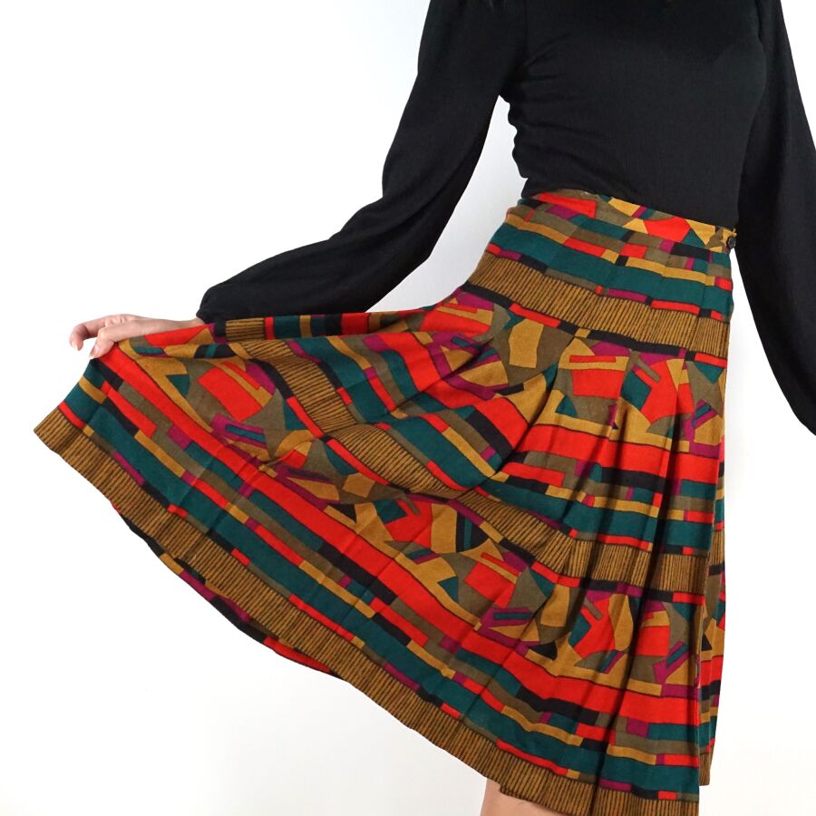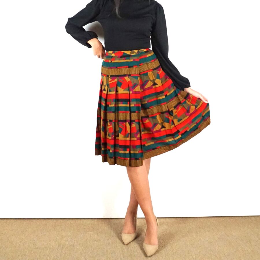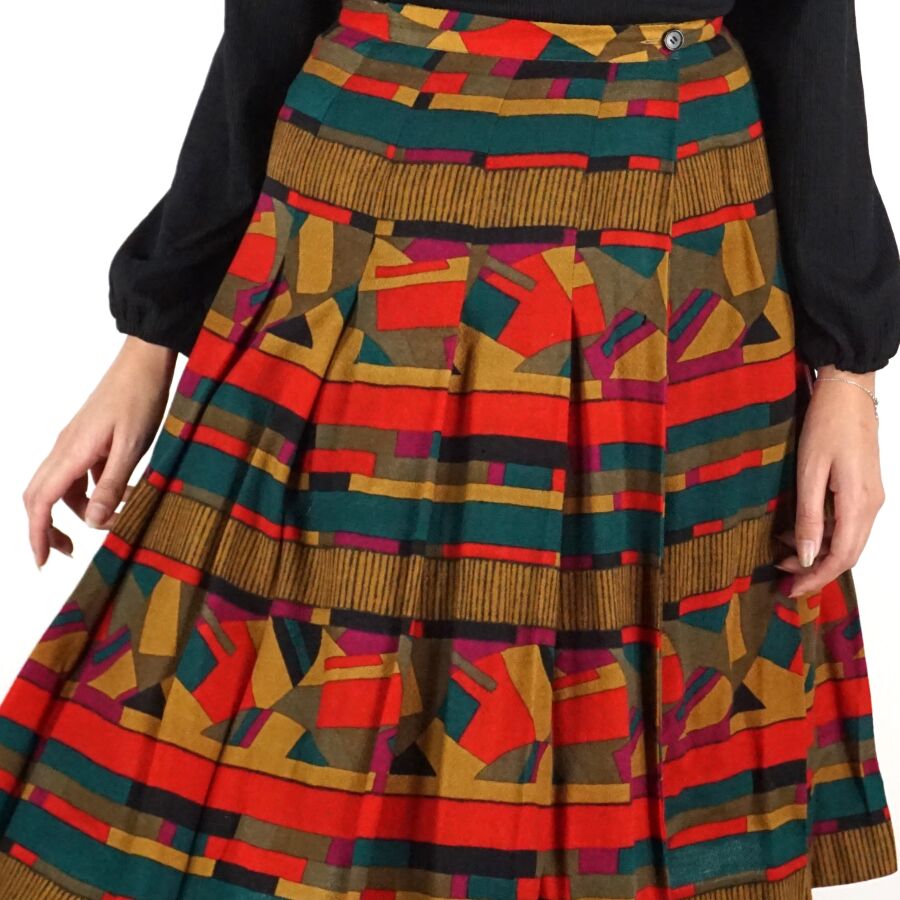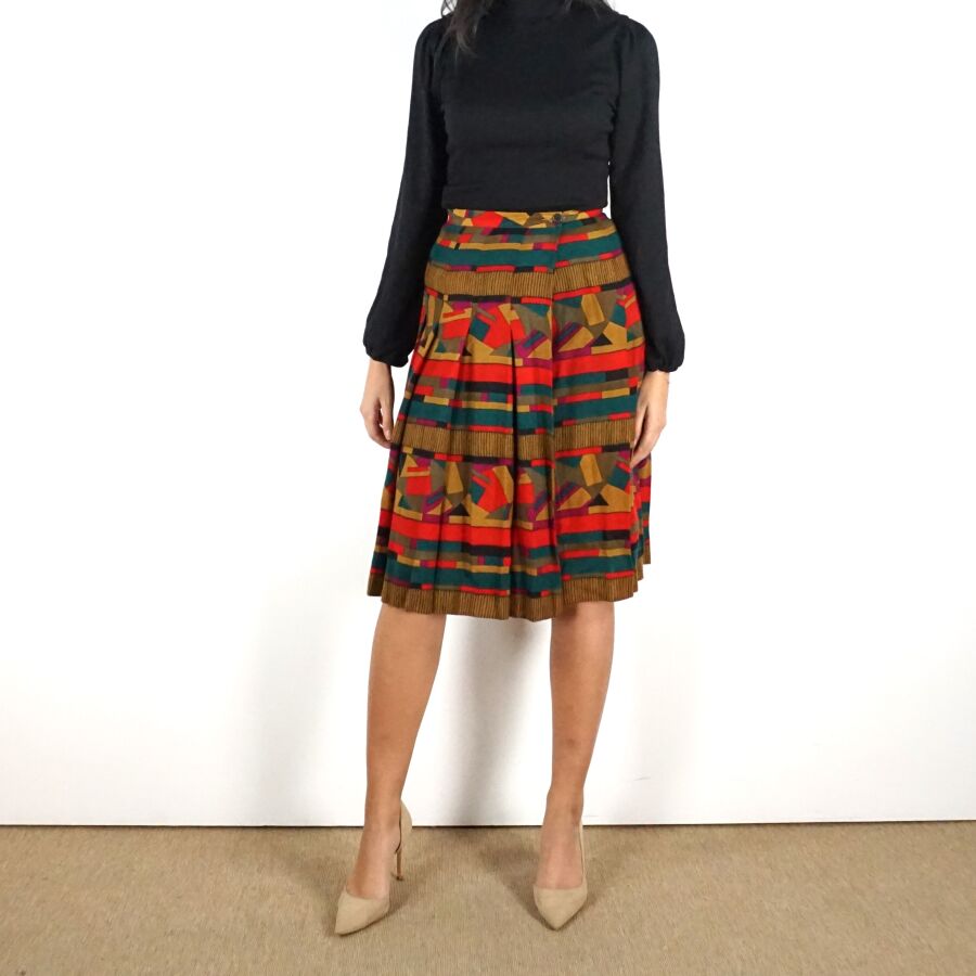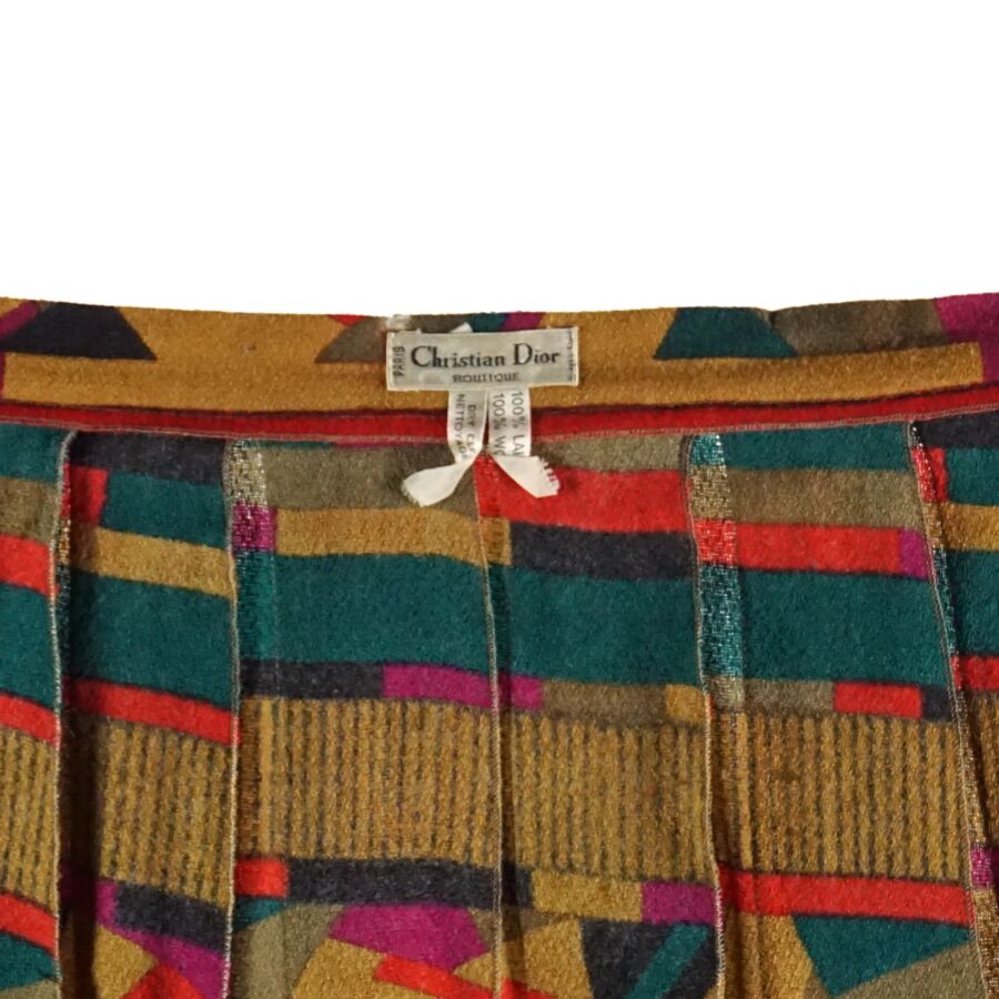 CHRISTIAN DIOR - BOUTIQUE : Jupe évasée en laine polychrome à décor géométrique, fermeture à la taille par un bouton et un crochet métallique, étiquette intérieure, taille supposée S/M, L. Totale : 68.5 cm. Larg. Taille : 34 cm environ (quelques trous et traces).