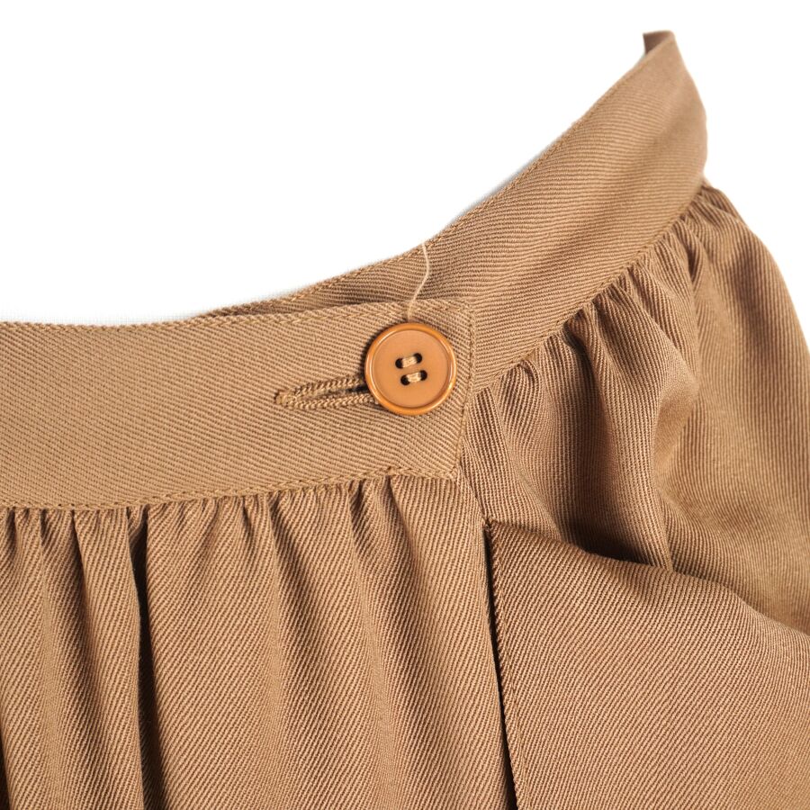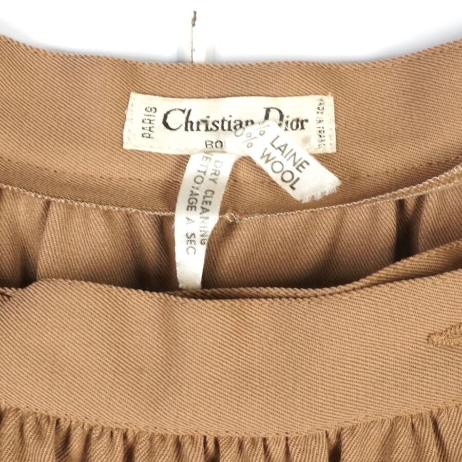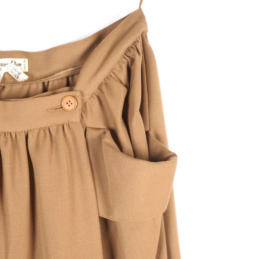 CHRISTIAN DIOR - BOUTIQUE : Jupe portefeuille en laine marron, fermeture à la taille par deux boutons, deux poches latérales, étiquette intérieure, L. 68 cm. Larg. Taille : 35.5/36 cm (petits trous, fils tirés).