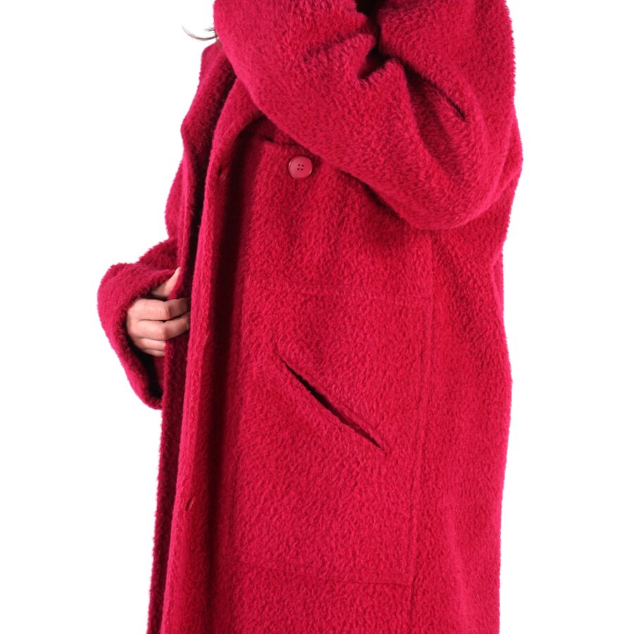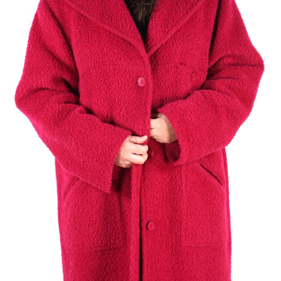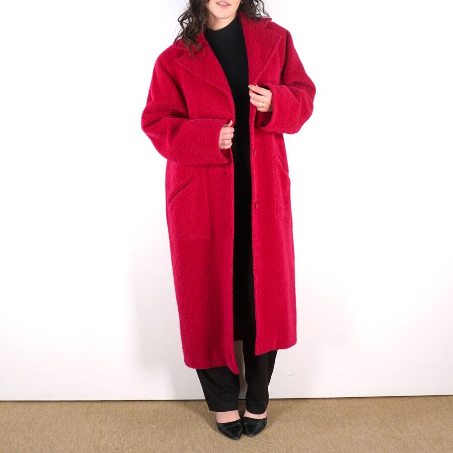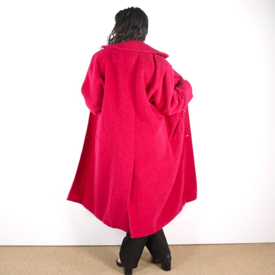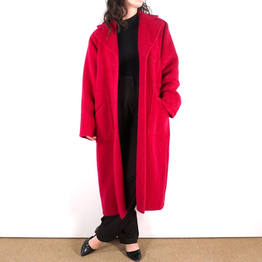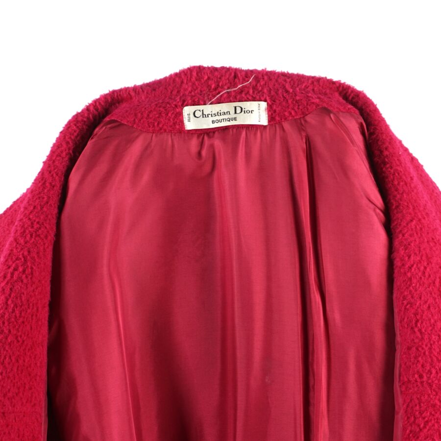 CHRISTIAN DIOR - BOUTIQUE : Manteau en laine et alpaga rose fuchsia, col tailleur, fermeture à l'avant par trois boutons, deux poches latérales basses et une poche haut à fermeture par un bouton, doublure intérieure en soie, avec son étiquette, taille M/L supposée, présentée avec un cintre "Dior Monsieur", L. Totale : 125 cm (quelques usures).