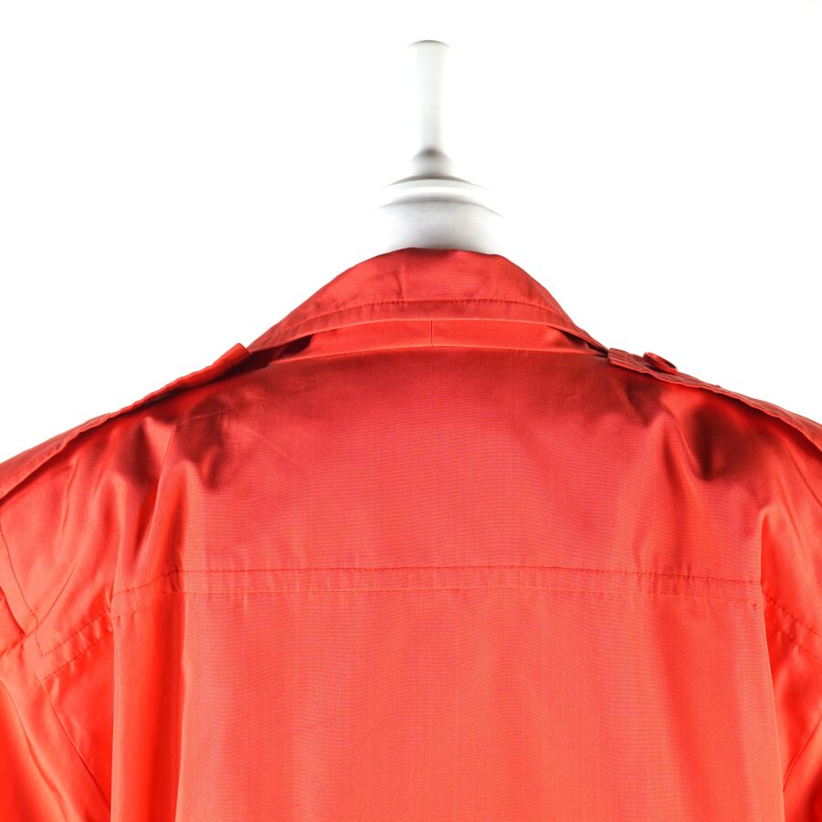 CHRISTIAN DIOR - BOUTIQUE : Manteau imperméable de couleur rose-corail, col tailleur, fermeture à l'avant par trous boutons, quatre poches extérieures, doublure en soie rose, avec sa ceinture, avec épaulettes, étiquette intérieure, L. Totale : 91.5 cm (taches).