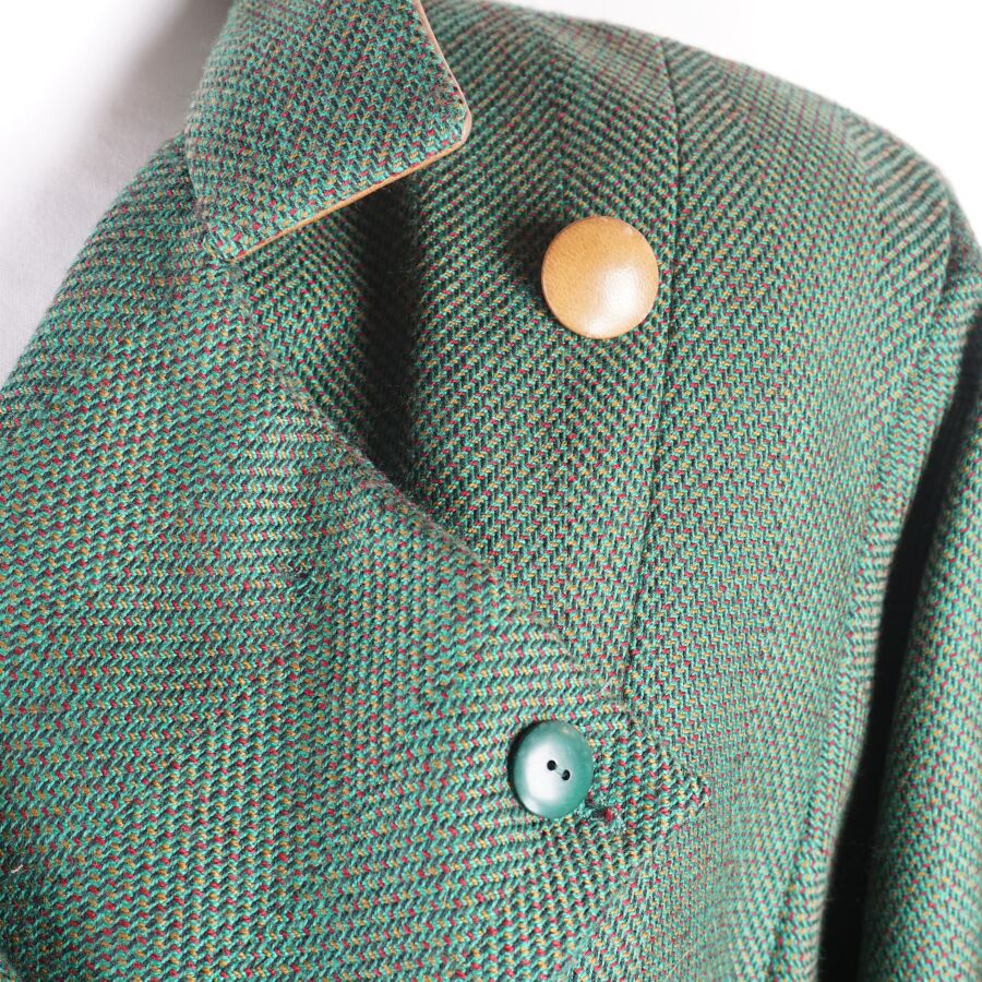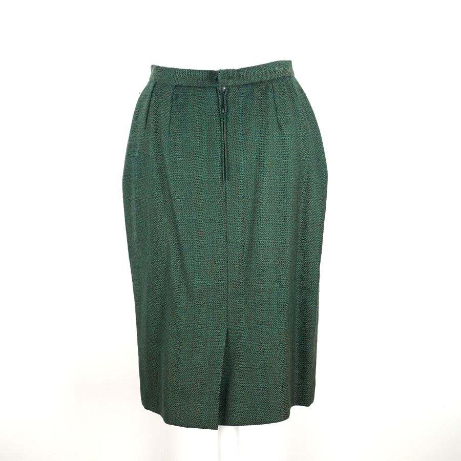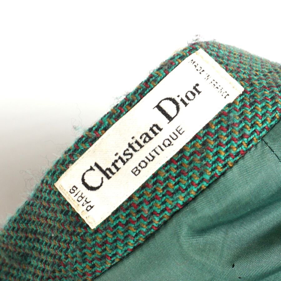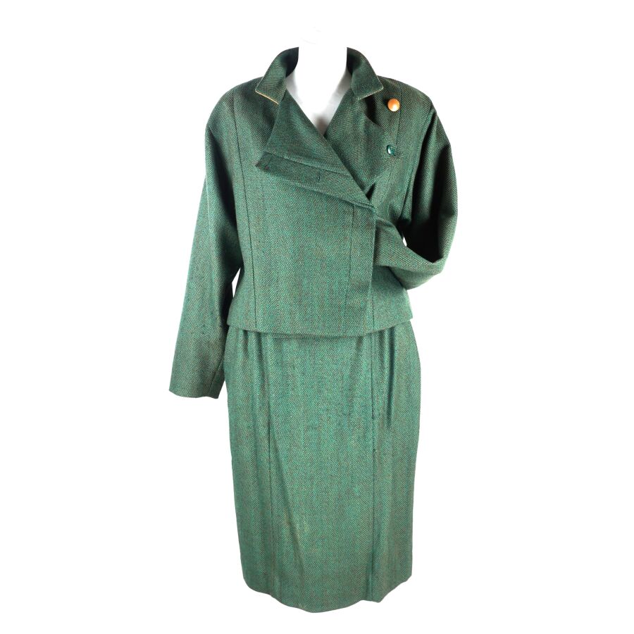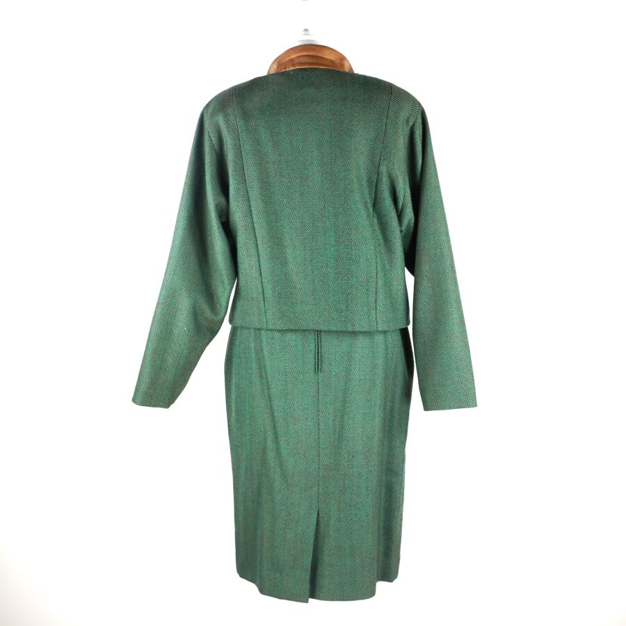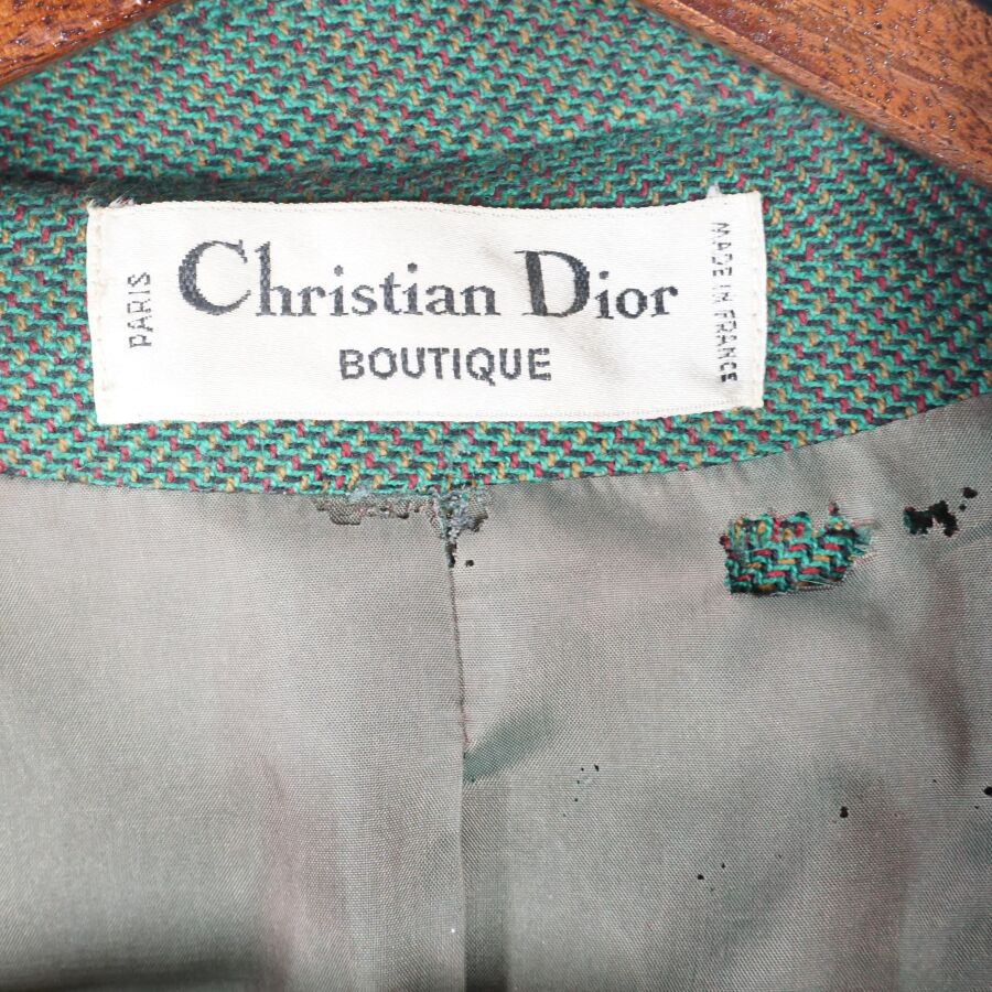 CHRISTIAN DIOR - BOUTIQUE : Tailleur en laine peignée teintée vert et empiècement en cuir marron, comprenant une veste, col tailleur, fermeture par deux boutons verts, doublure en soie, étiquette intérieure, avec sa jupe droite, fermeture à l'arrière par un bouton et une fermeture zippée, étiquette intérieure, taille supposée S/M, L. Veste : 52 cm. L. Jupe : 68 cm. Larg. Jupe : 33.5 cm environ (trous et usures à la doublure, quelques usures).