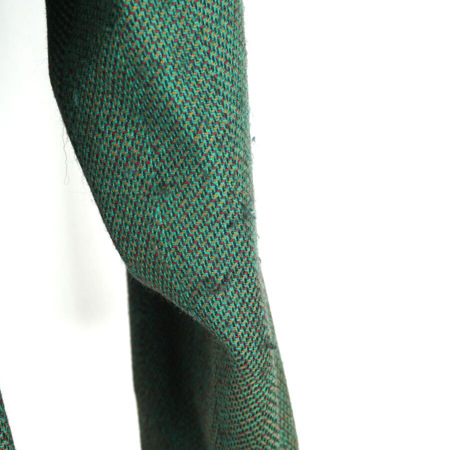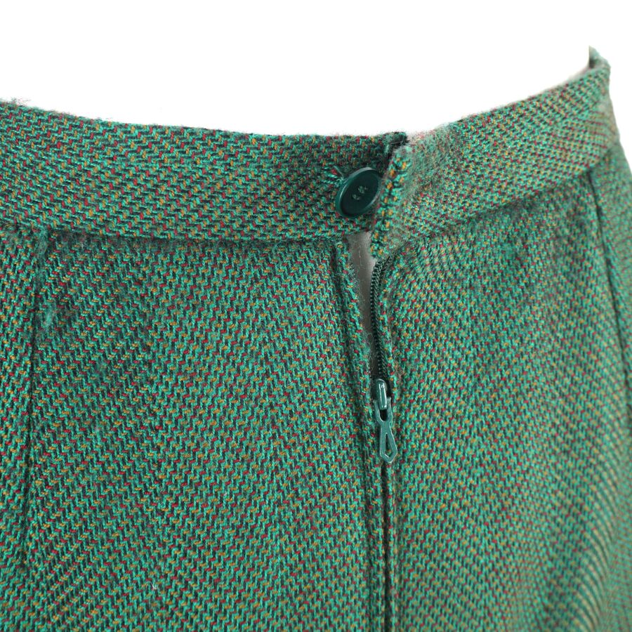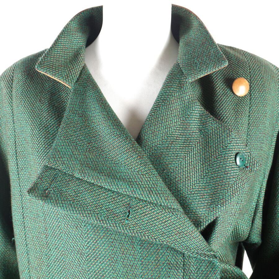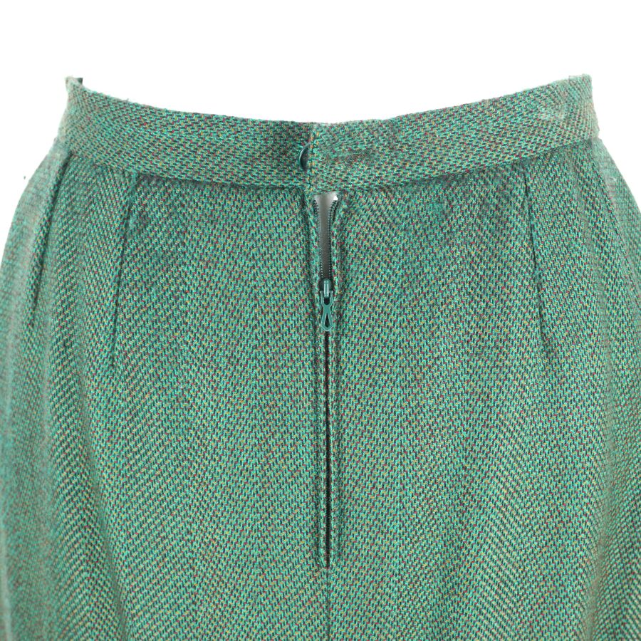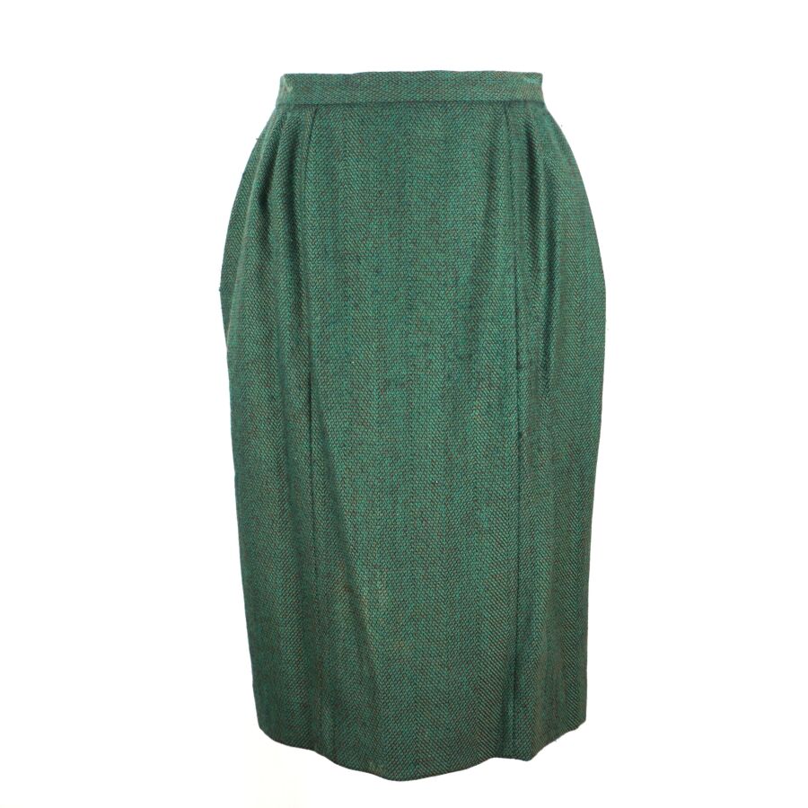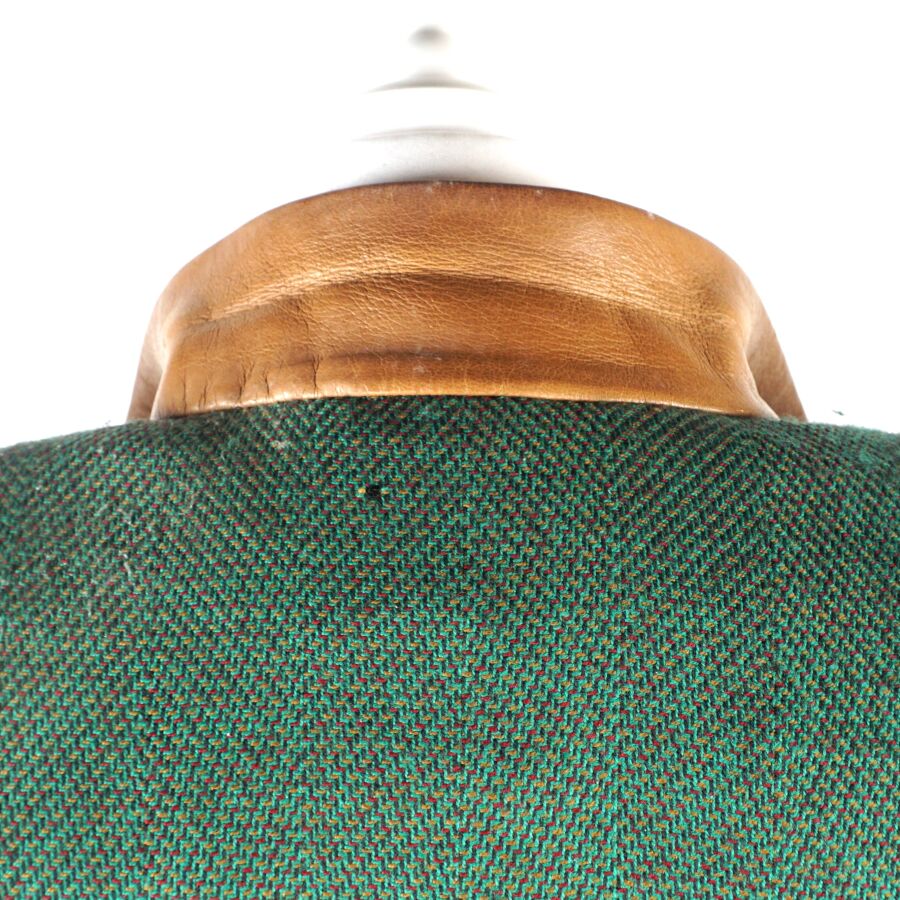 CHRISTIAN DIOR - BOUTIQUE : Tailleur en laine peignée teintée vert et empiècement en cuir marron, comprenant une veste, col tailleur, fermeture par deux boutons verts, doublure en soie, étiquette intérieure, avec sa jupe droite, fermeture à l'arrière par un bouton et une fermeture zippée, étiquette intérieure, taille supposée S/M, L. Veste : 52 cm. L. Jupe : 68 cm. Larg. Jupe : 33.5 cm environ (trous et usures à la doublure, quelques usures).