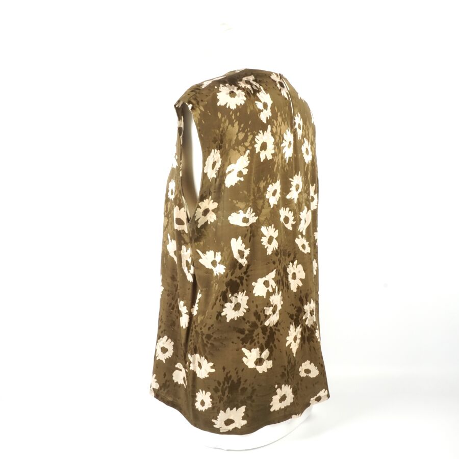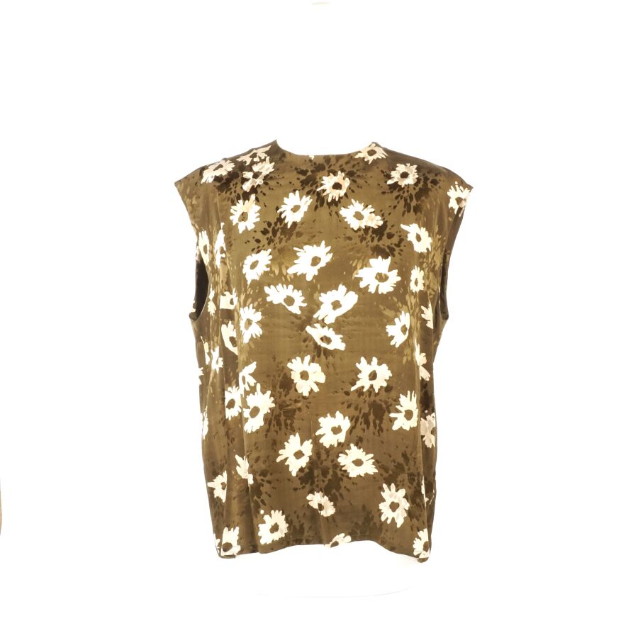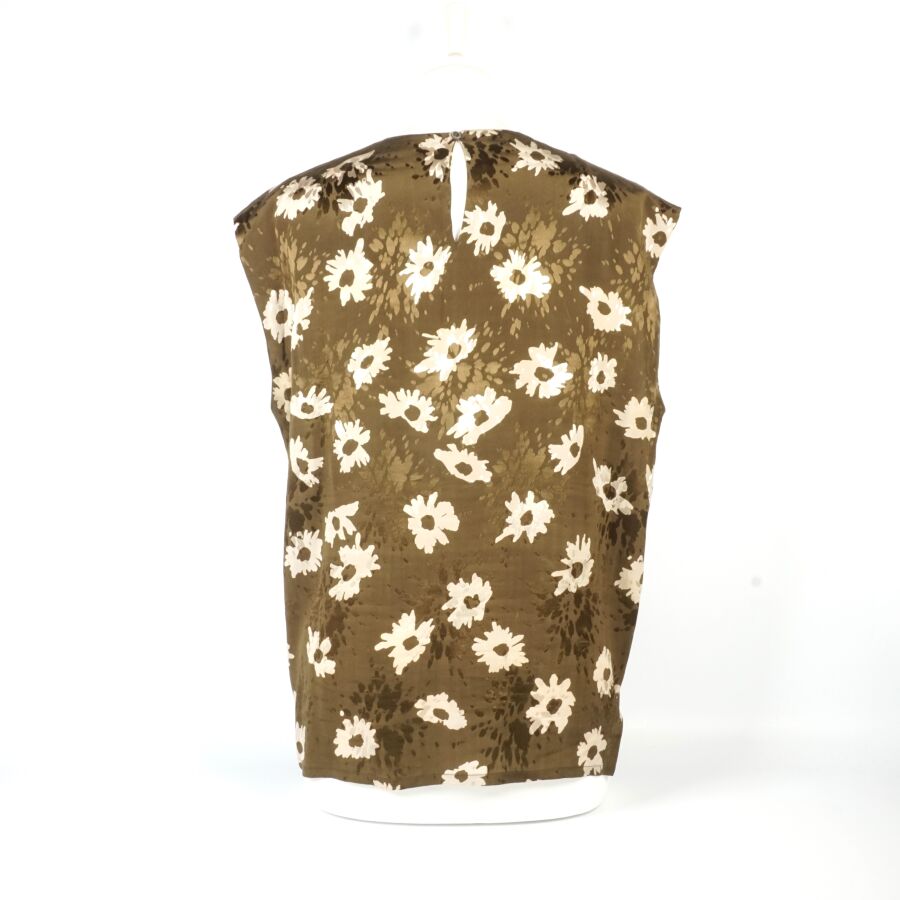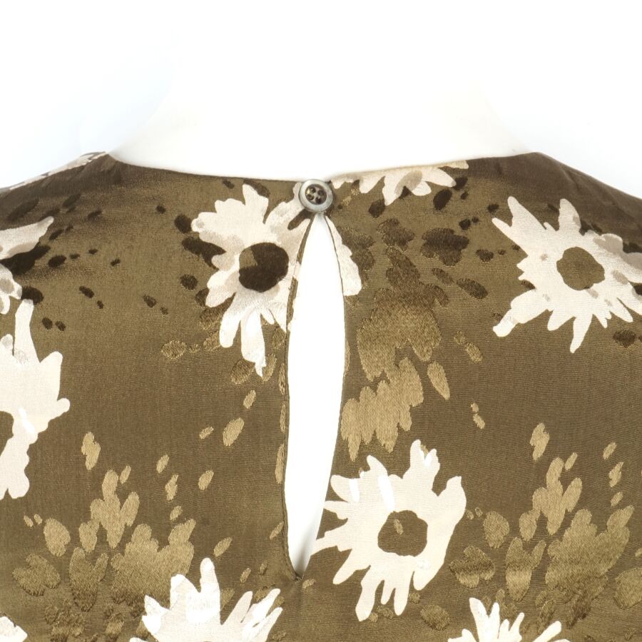 CHRISTIAN DIOR - BOUTIQUE : Top en soie vert olive - brun à motif de marguerites blanches, col court rond, manches courtes épaules, fermeture à un bouton à l'arrière, étiquette intérieure, taille supposée M, H. Totale : 58 cm.