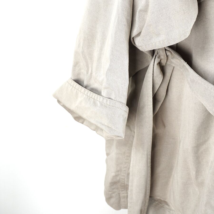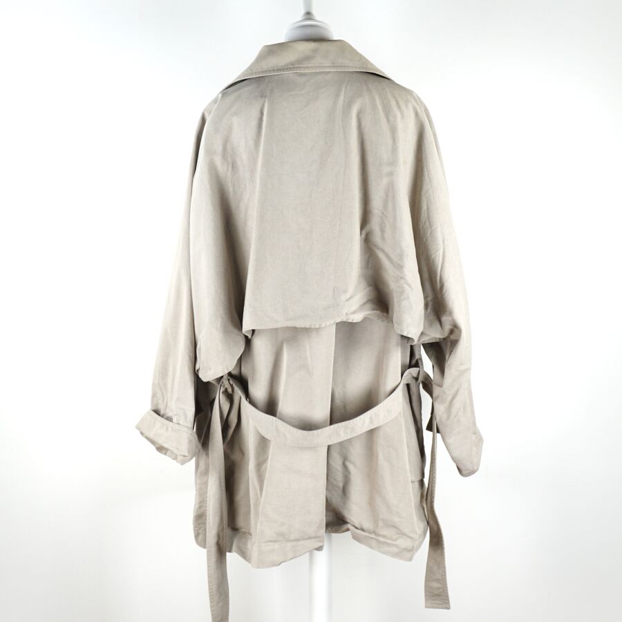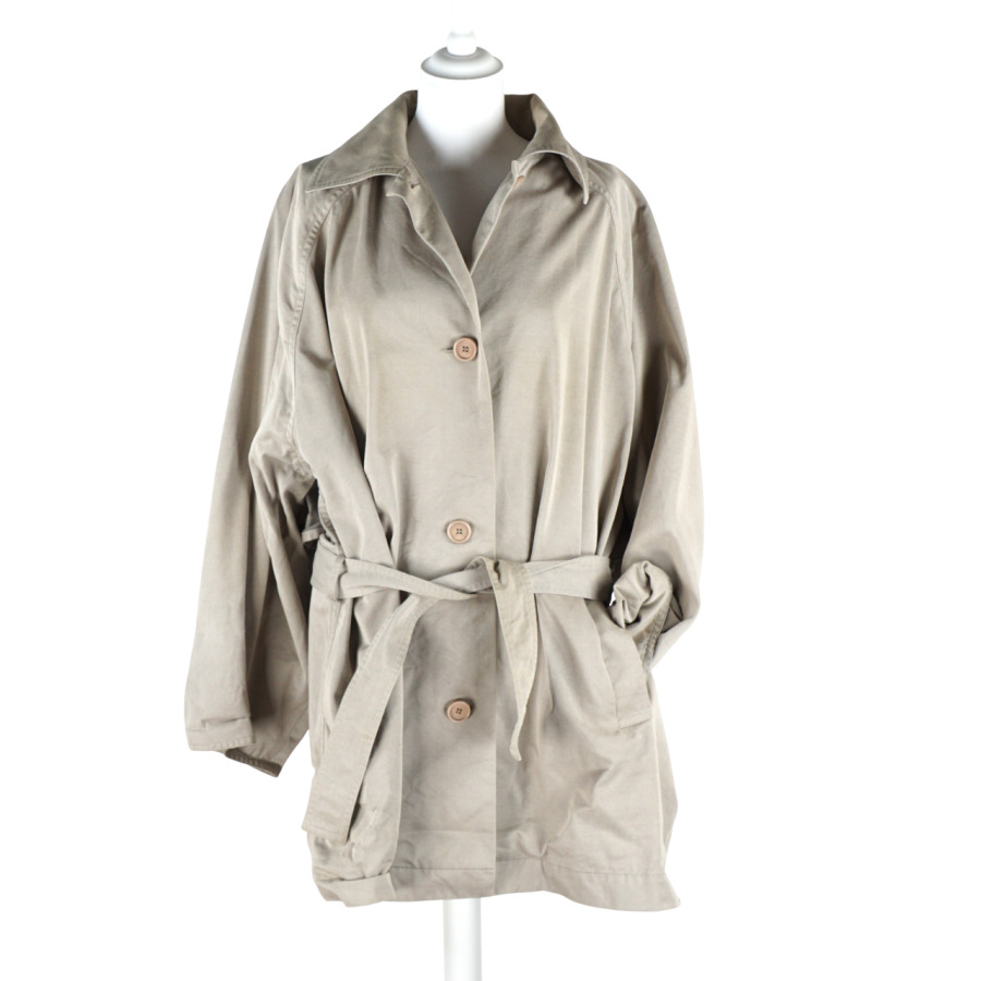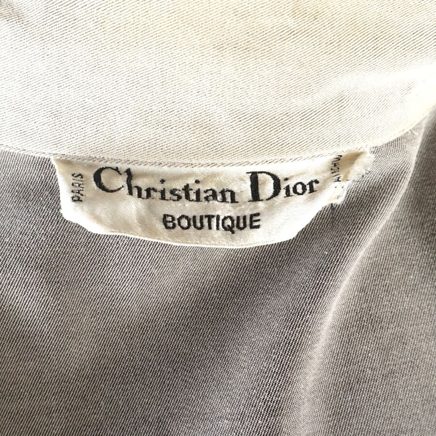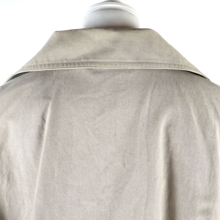 CHRISTIAN DIOR - BOUTIQUE : Trench-coat en coton et laine imperméabilisée de couleur gris-beige, col chemisier, fermeture à l'avant par cinq boutons, deux poches latérales basses, avec sa ceinture, étiquette intérieure, taille supposée L, présenté avec un cintre logoté Christian Dior Monsieur et une housse plastifiée logotée, L. Totale : 92.5 cm (petites taches et usures légères).