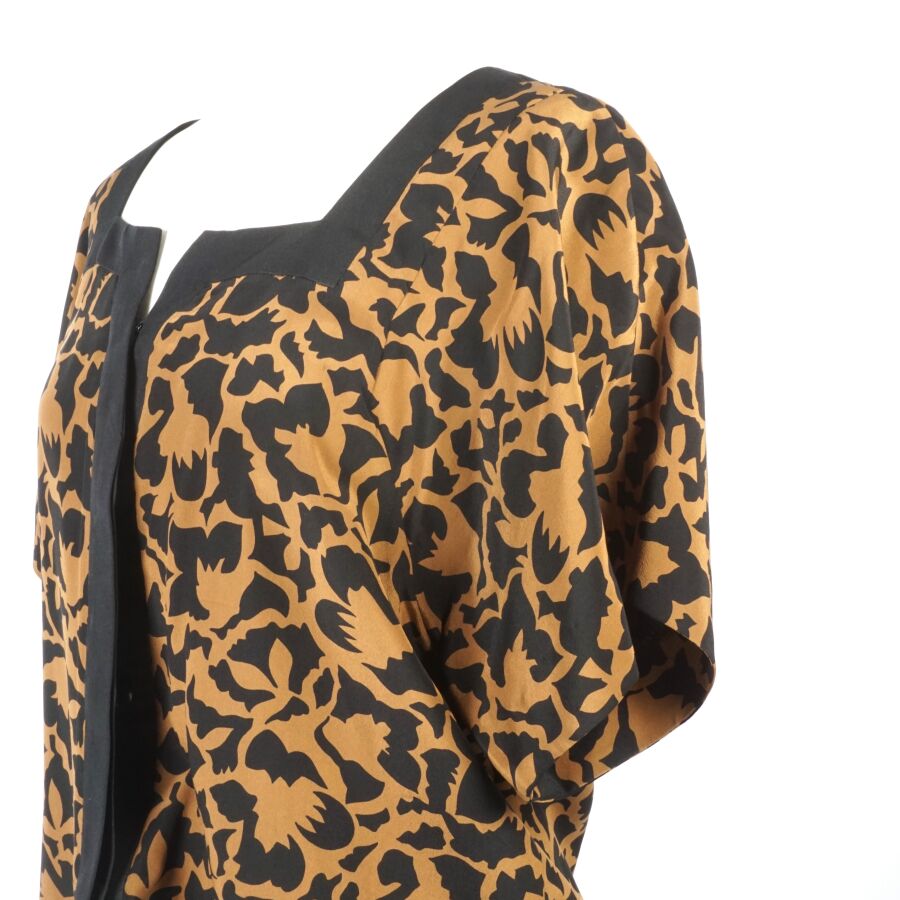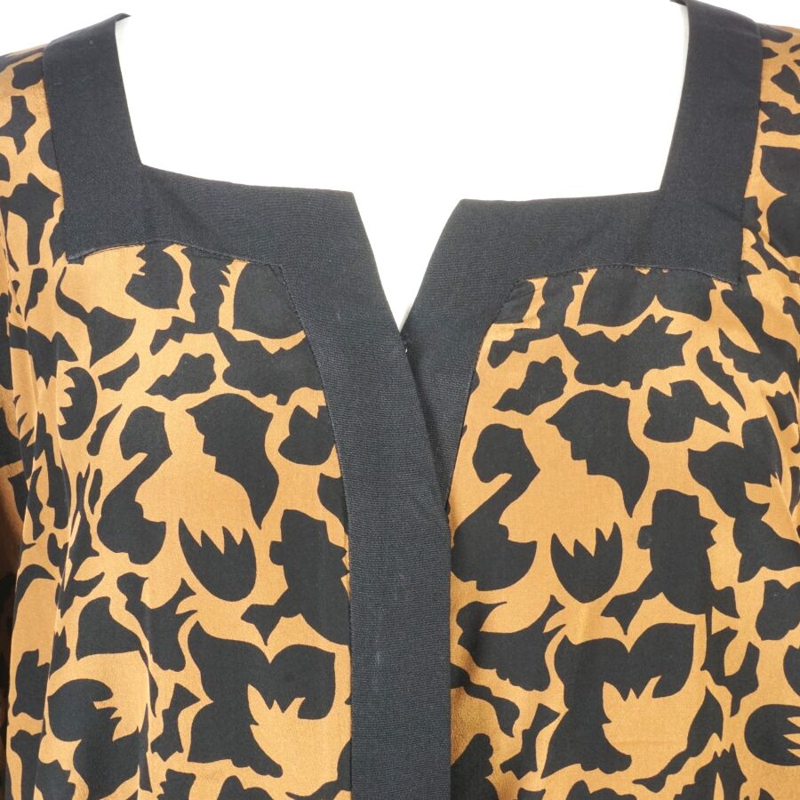 CHRISTIAN DIOR - BOUTIQUE : Tunique en soie à motif floral noir sur fond brun, col carré, manches courtes, fermeture à l'avant par un bouton pression et cinq boutons en bakélite noir, col carré, H. Totale : 80 cm environ (petites traces à la doublure).