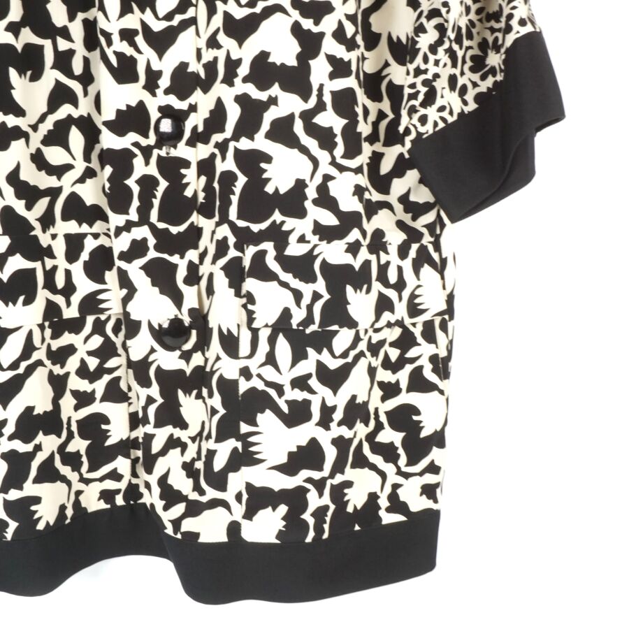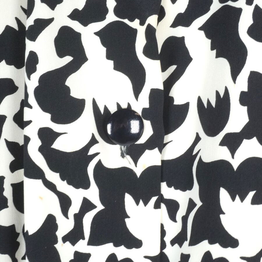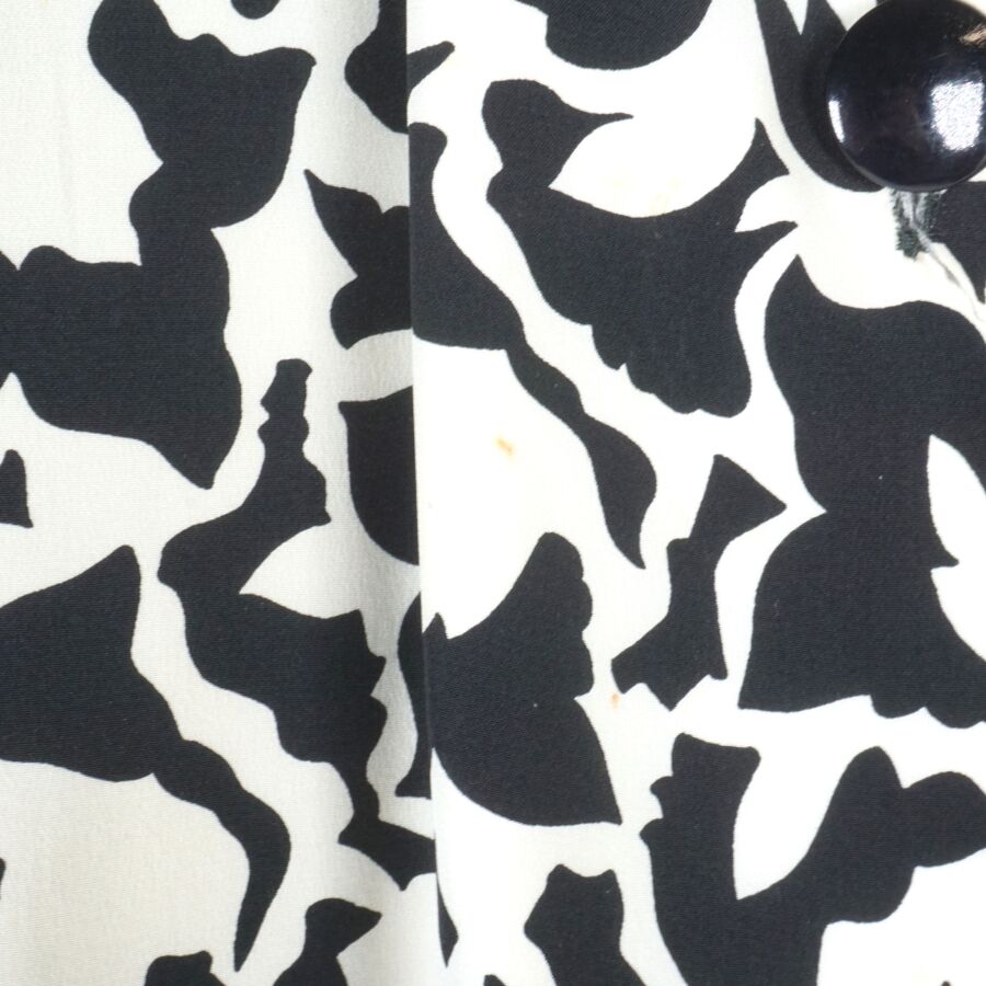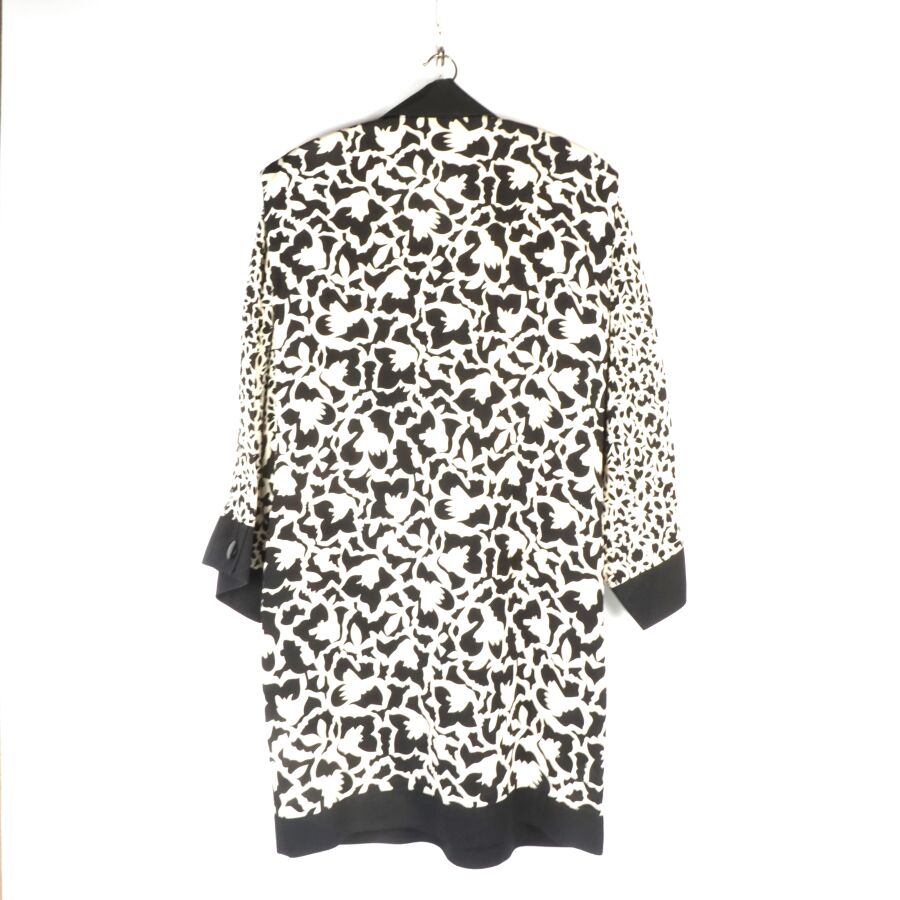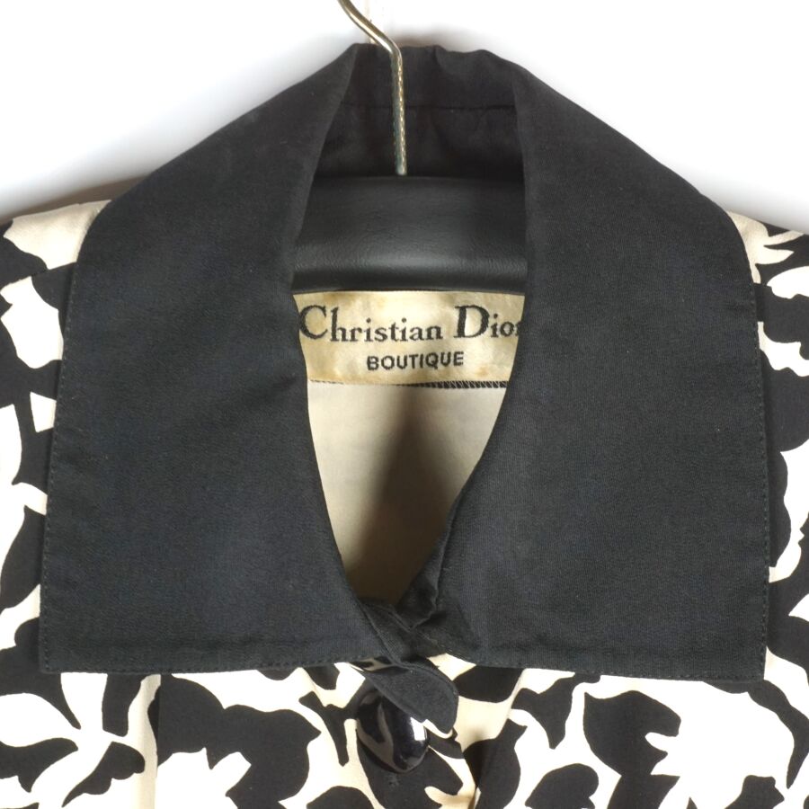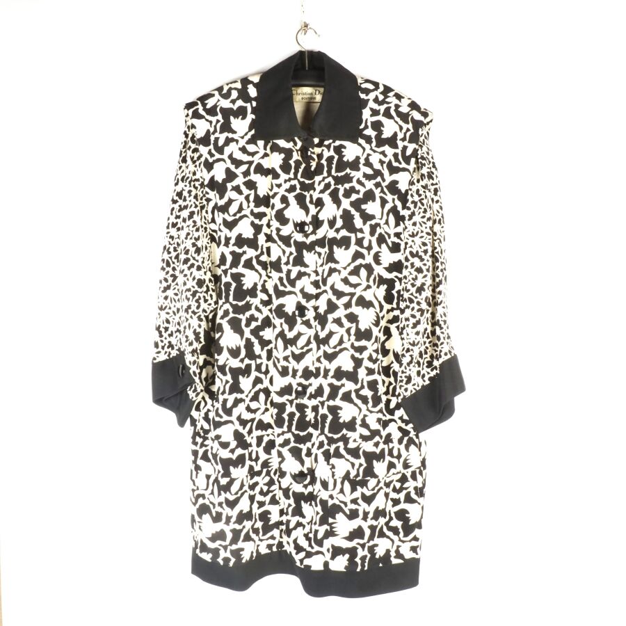 CHRISTIAN DIOR - BOUTIQUE : Tunique en soie noire et blanche à motif rayé, col chemisier noir, fermeture à six boutons en bakélite noire, manches 3/4 à fermeture à l'extrémité par un bouton, étiquette intérieure, deux poches latérales basses, taille supposée M, H. 86 cm (taches à la doublure, petit jaunissement à certains endroits).