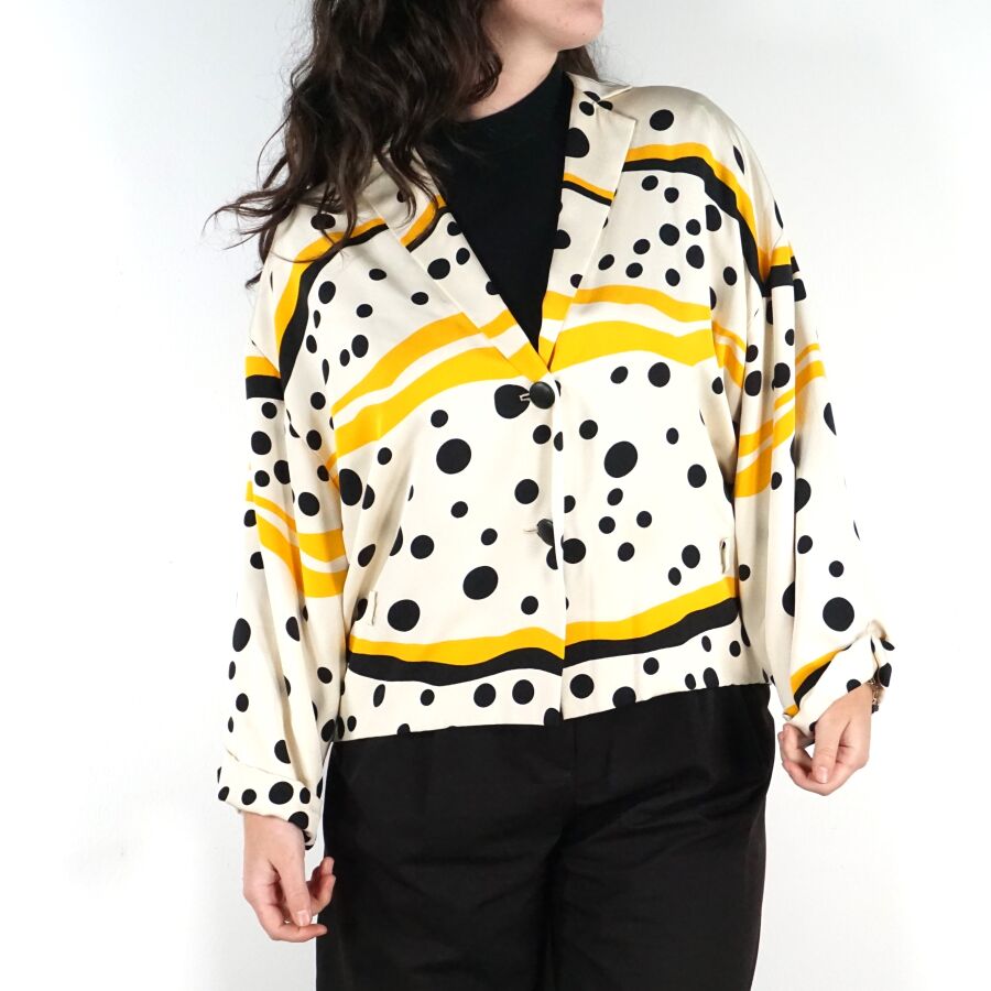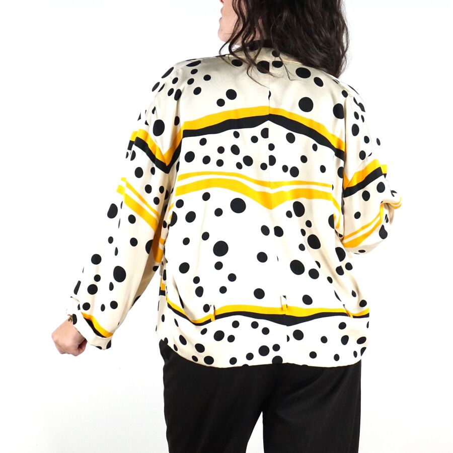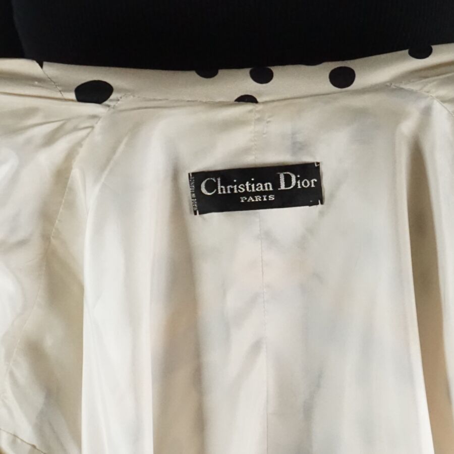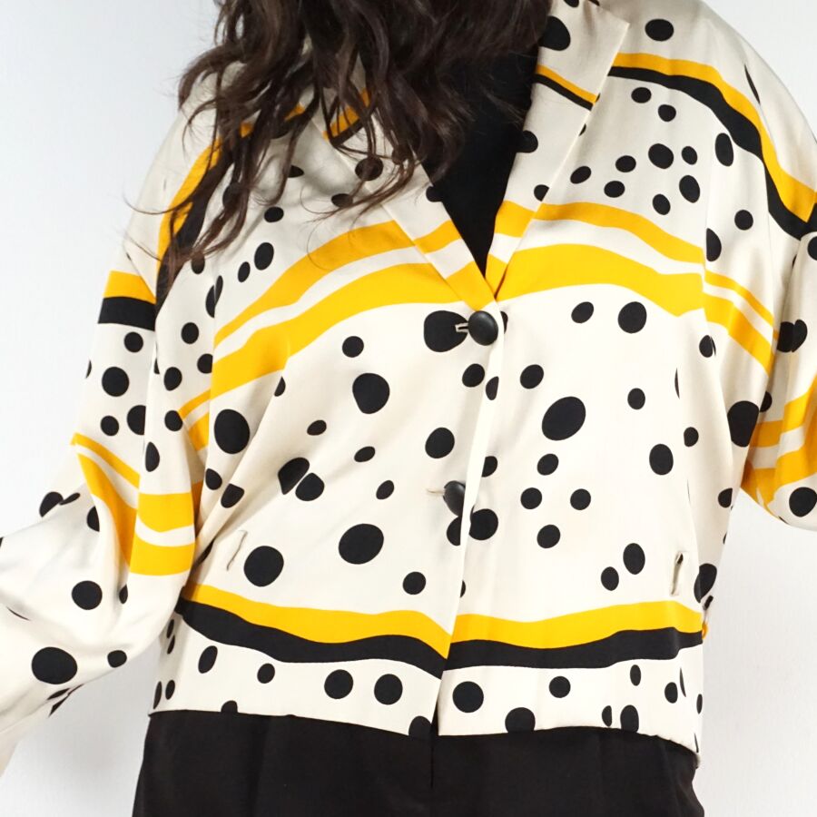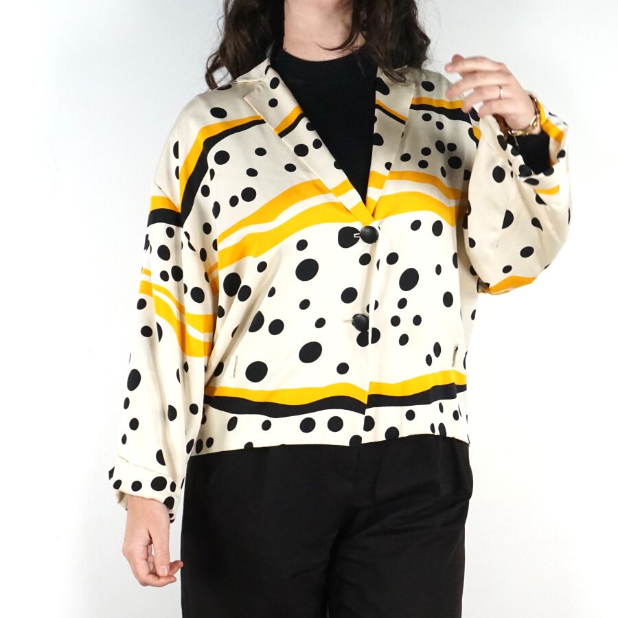 CHRISTIAN DIOR - BOUTIQUE : Veste ample en soie à décor de rayures jaunes et pois noirs sur fond écru, fermeture à l'avant par deux boutons en bakélite noire, doublure écru en soie, taille supposée L, présentée avec son cintre logotée, H. Totale 63.5 cm (manque la ceinture, petites taches).