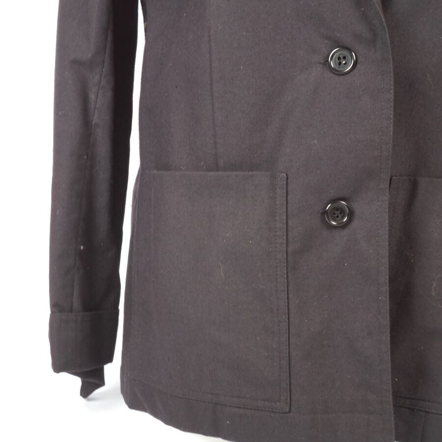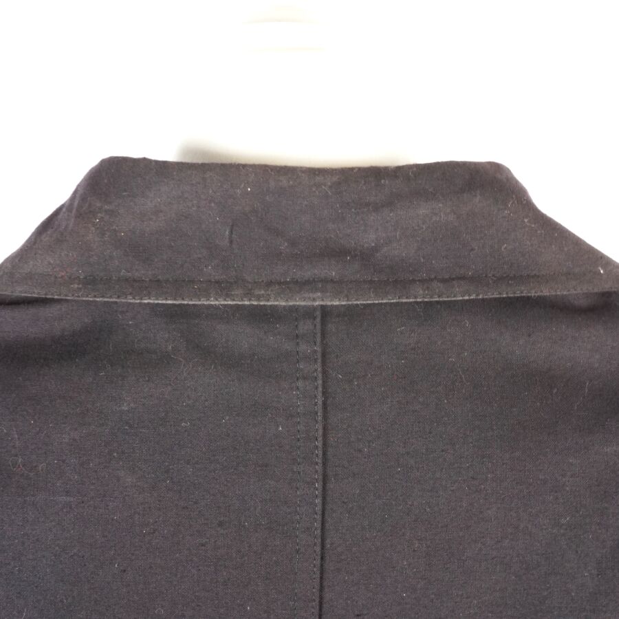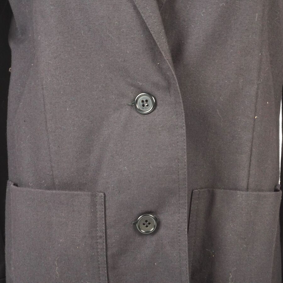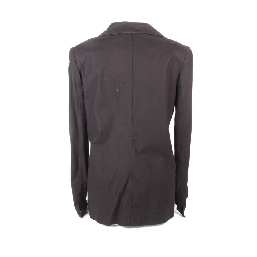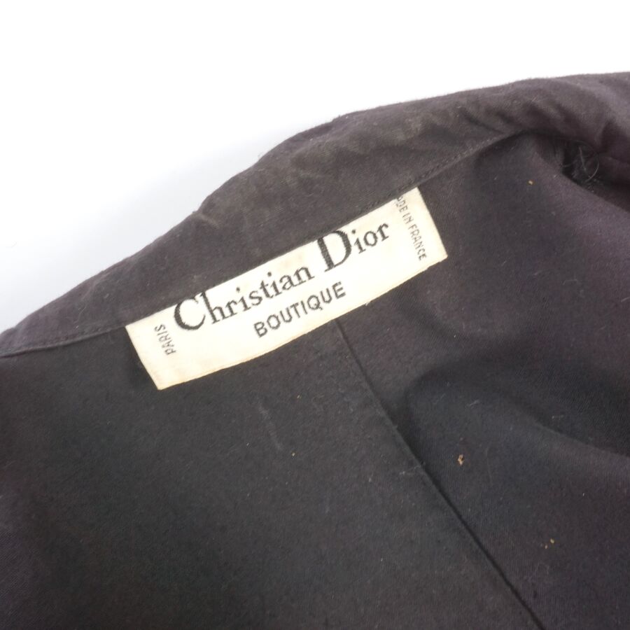 CHRISTIAN DIOR - BOUTIQUE : Veste blazer en coton de couleur noire, col dit tailleur, fermeture à l'avant par deux boutons noirs, deux poches latérales, étiquette intérieure, taille supposée M, présentée avec un cintre logoté, L. Totale : 69 cm (usures et traces, cintre accidenté).