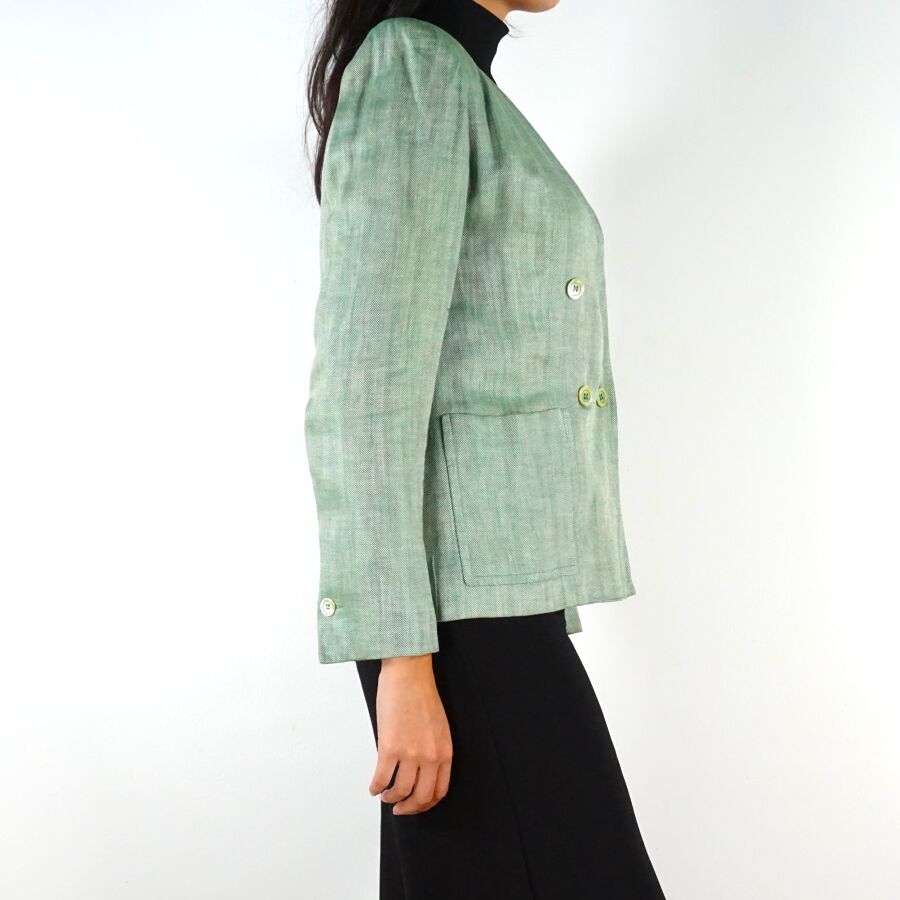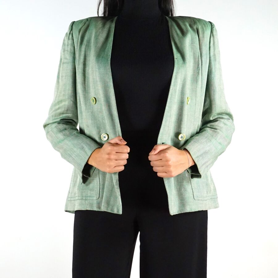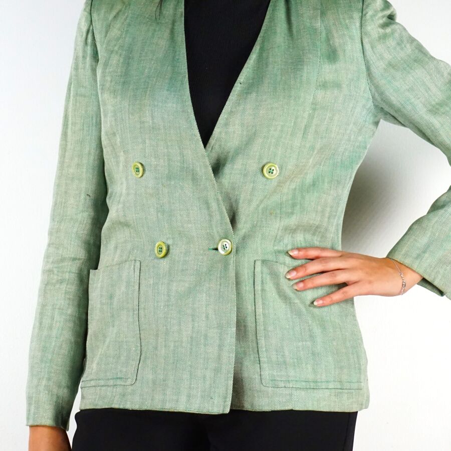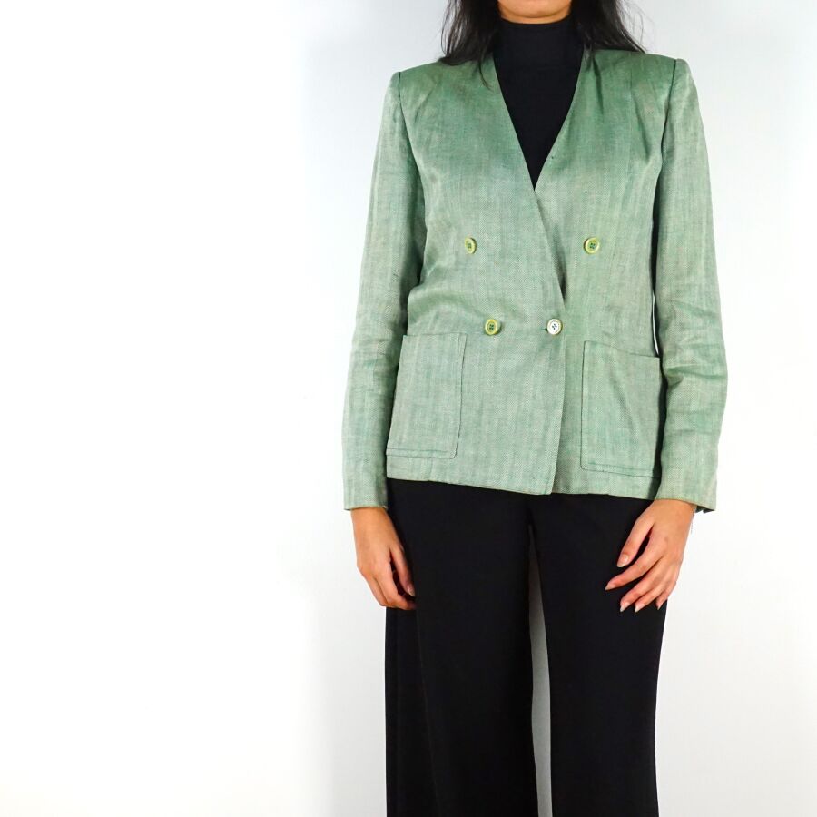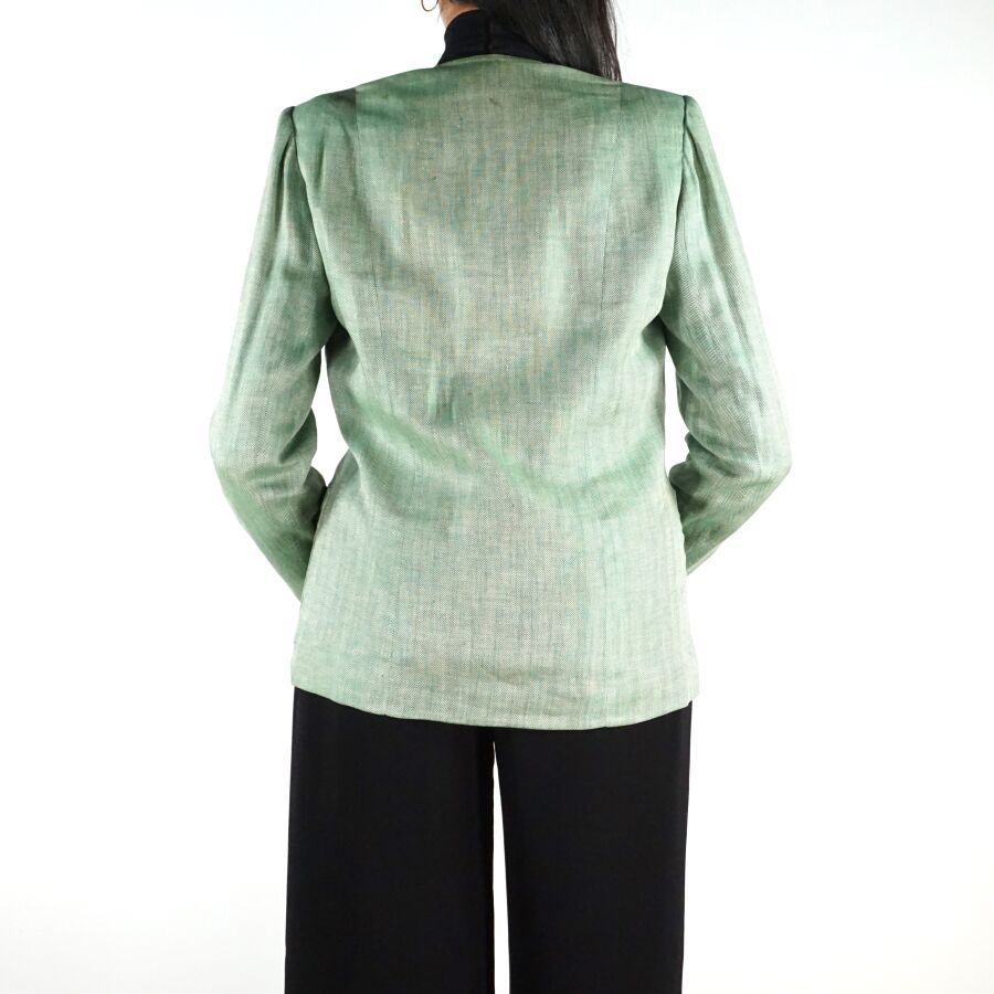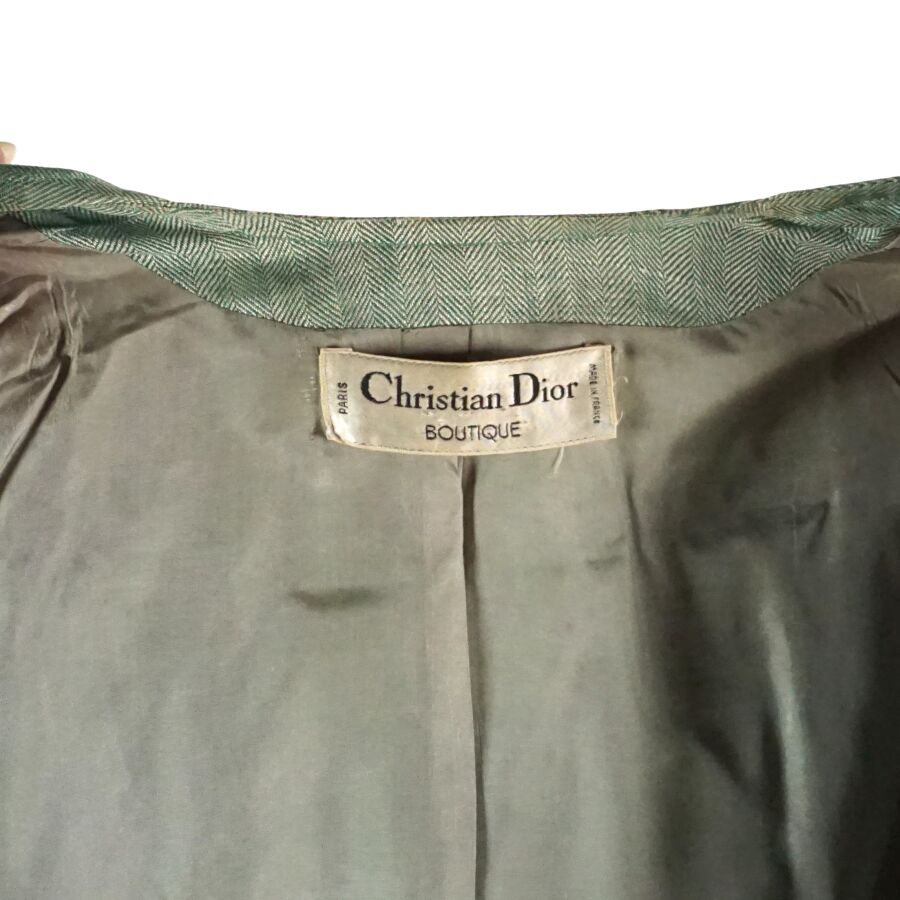 CHRISTIAN DIOR - BOUTIQUE : Veste blazer en lin vert, col type châle, fermeture à l'avant par un bouton, deux poches latérales basses, manches longues terminant aux extrémités par un bouton, étiquette intérieure, taille supposée M, doublure verte en soie,, présentée avec son cintre logoté (accidenté), H. Totale : 71.5 cm environ (quelques taches).