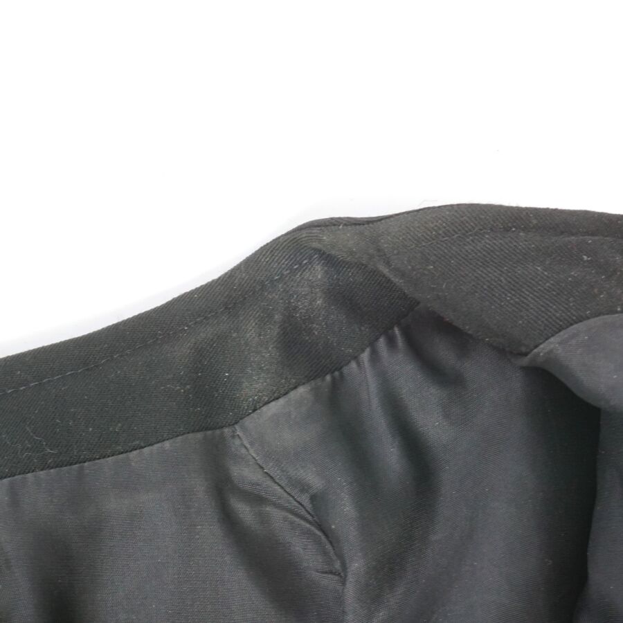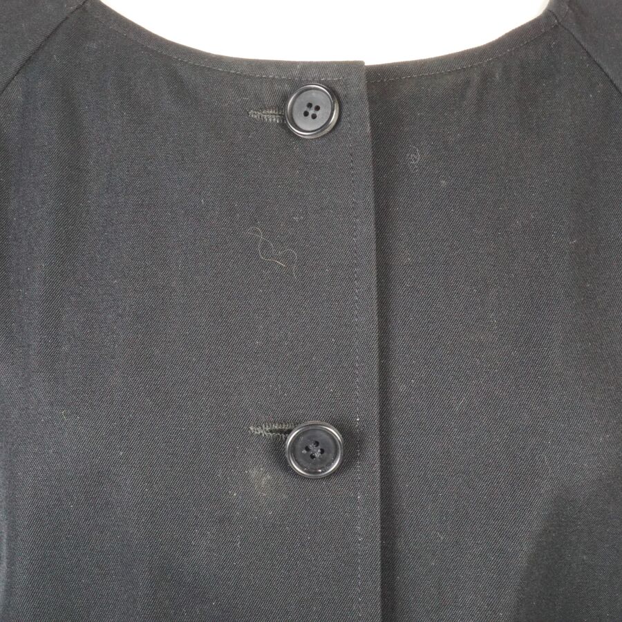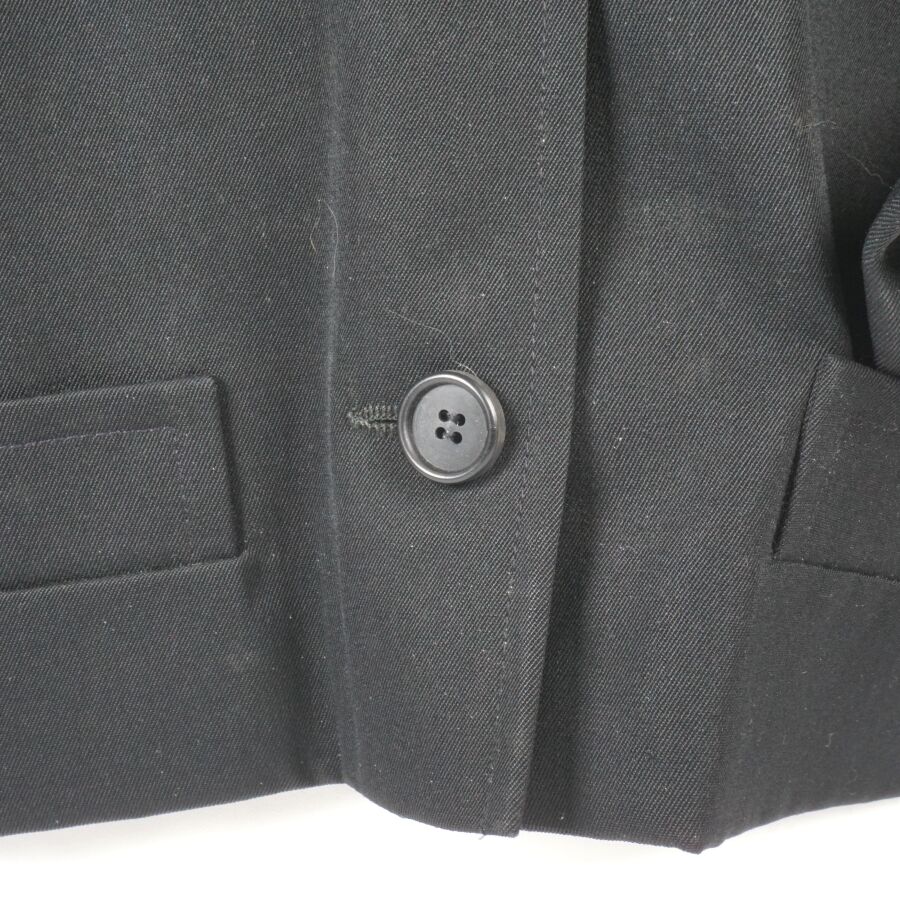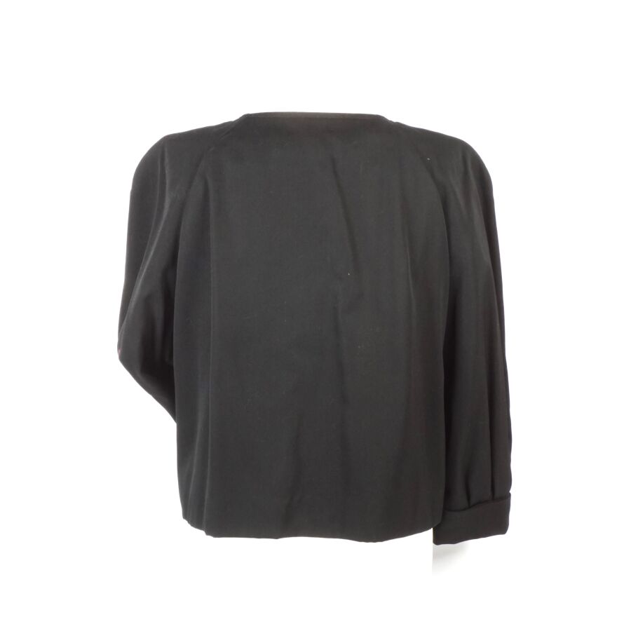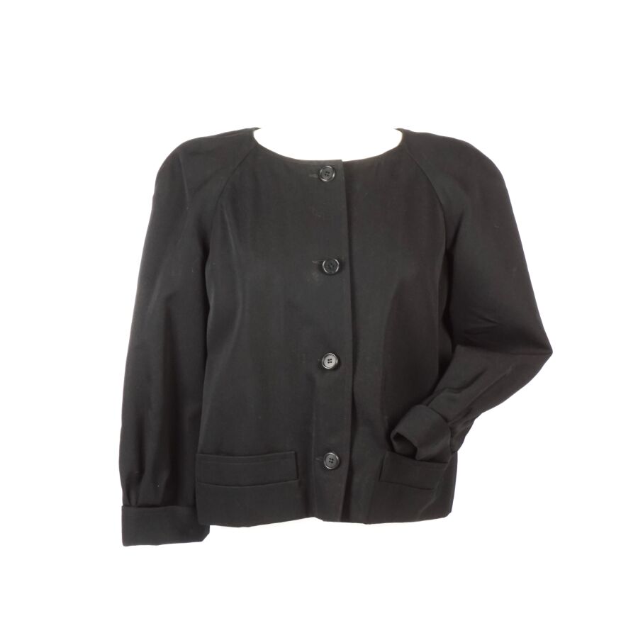 CHRISTIAN DIOR - BOUTIQUE : Veste courte en laine de couleur noire, col rond, manches longues à ourlets, fermeture à l'avant par quatre boutons, deux poches courtes latérales, doublure noire, étiquette intérieure, taille supposée S/M, L. 52 cm (quelques taches).