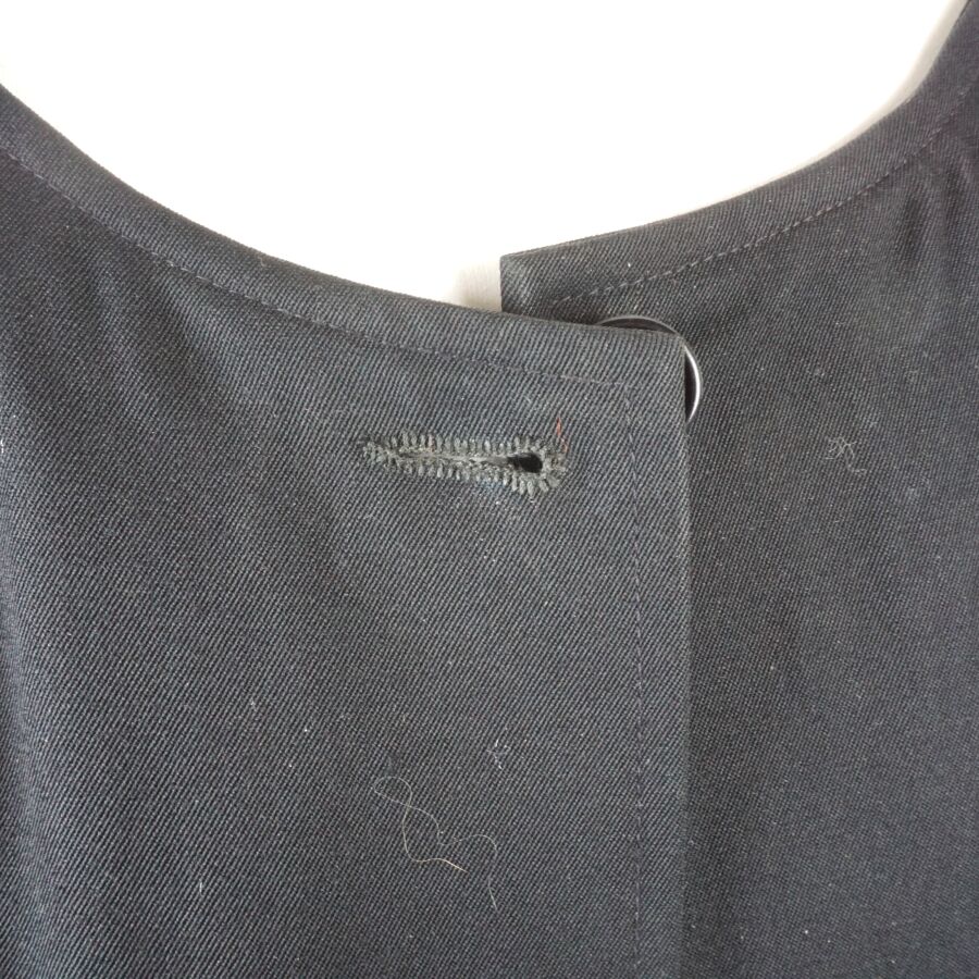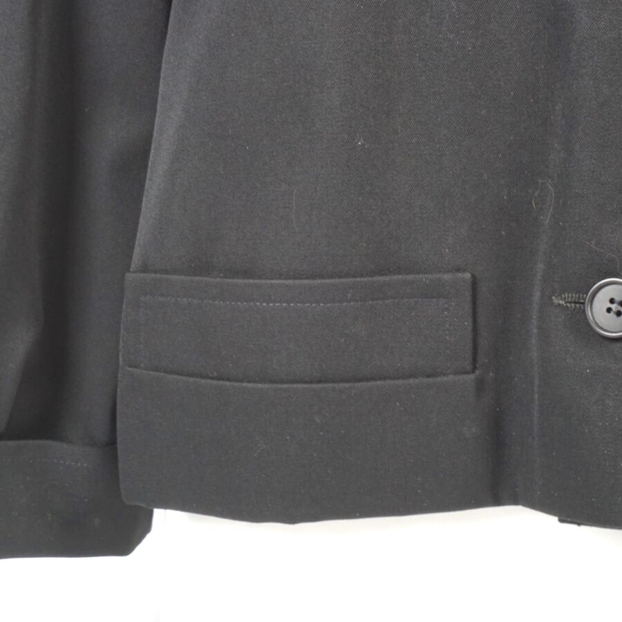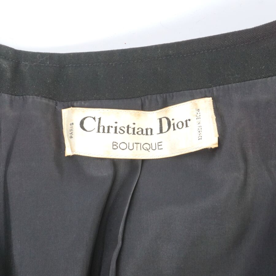 CHRISTIAN DIOR - BOUTIQUE : Veste courte en laine de couleur noire, col rond, manches longues à ourlets, fermeture à l'avant par quatre boutons, deux poches courtes latérales, doublure noire, étiquette intérieure, taille supposée S/M, L. 52 cm (quelques taches).