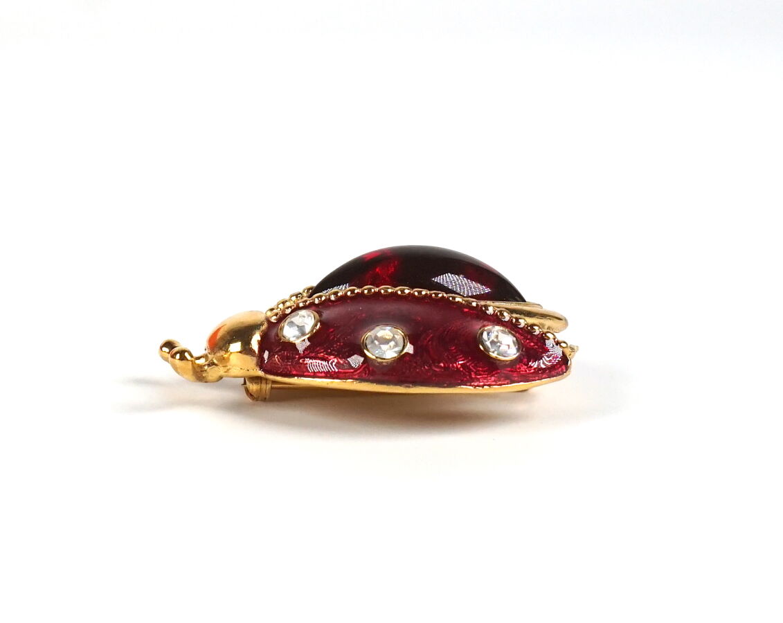 Christian DIOR : Broche "Coccinelle" en métal doré émaillé rouge, agrémentée d'un cabochon de résine rouge et de pierres de fantaisie imitant le diamant, signée "Christian Dior Parfums", L. 4.5 cm.