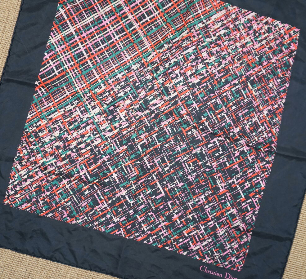 Christian DIOR : Carré de soie à décor géométrique en rose, rouge et vert sur fond noir, signé, 75 x 75 cm environ (lègeres usures d'usage).