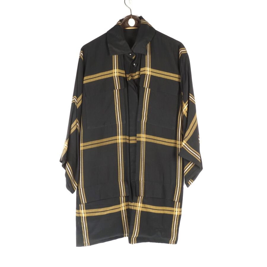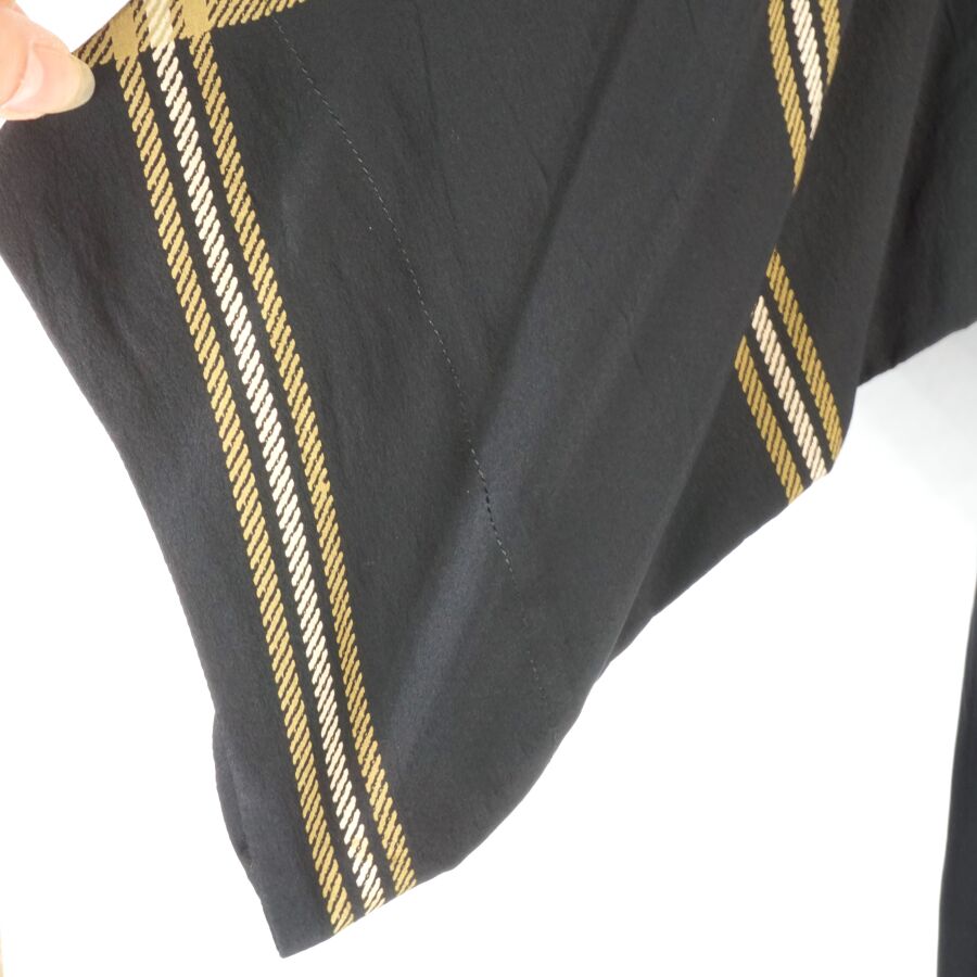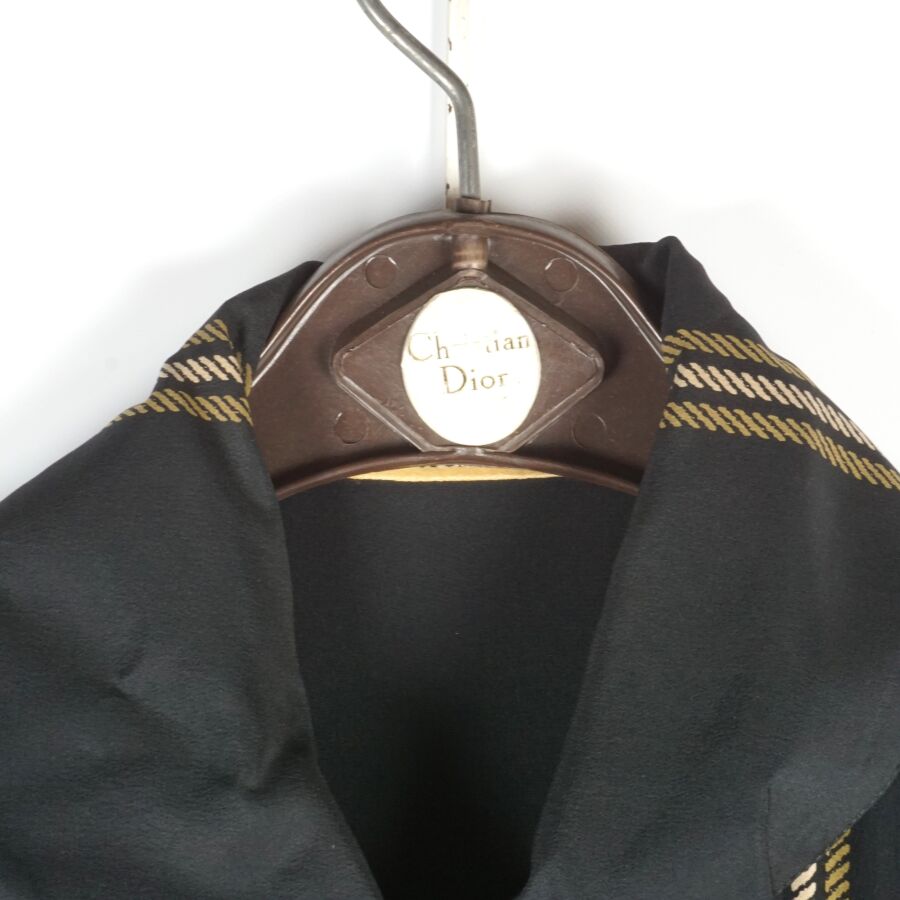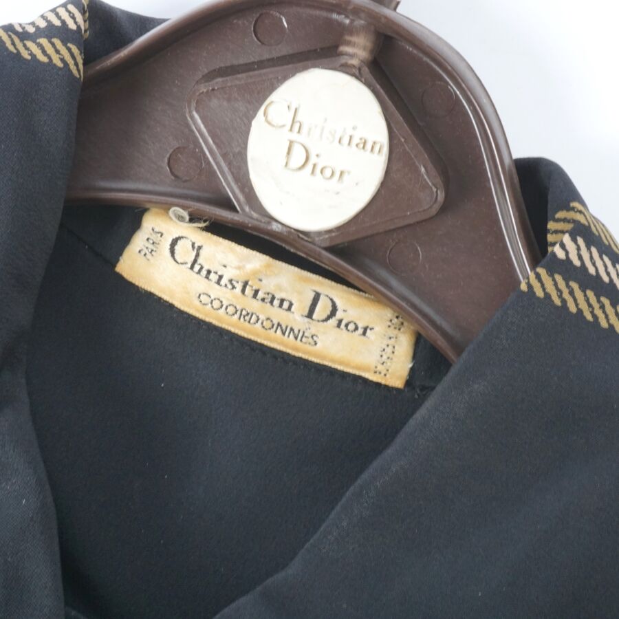 CHRISTIAN DIOR - COORDONNES : Tunique - chemisier en soie à motif rayé beige et ocre sur fond noir, fermeture partielle à l'avant par six boutons en bakélite noire, col chemisier, quatre poches, deux en partie basse, deux autres en partie haute, manches courtes voire 3/4, étiquette intérieure, taille supposée M, présentée avec son cintre logoté, H. Totale : 81 cm (taches à l'étiquette intérieure, petits fils tirés).