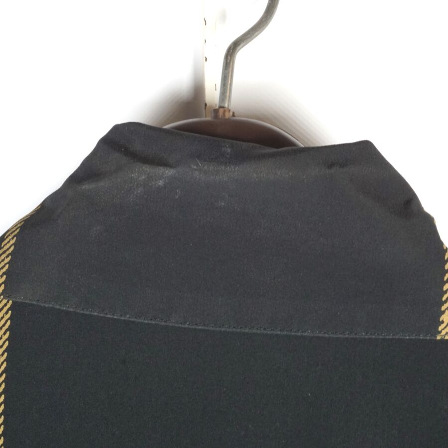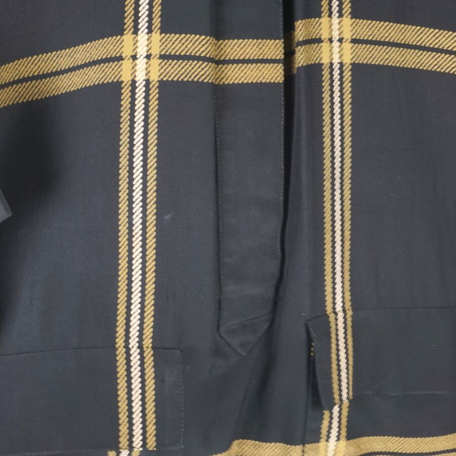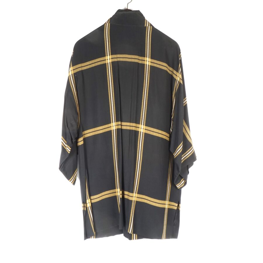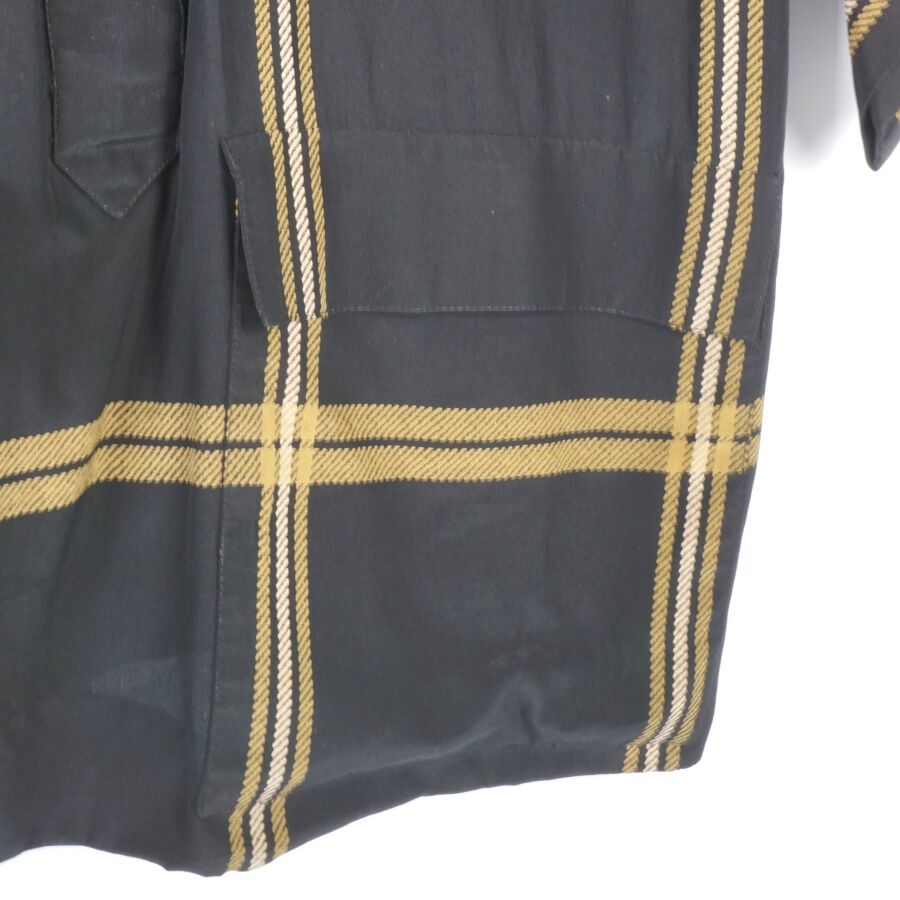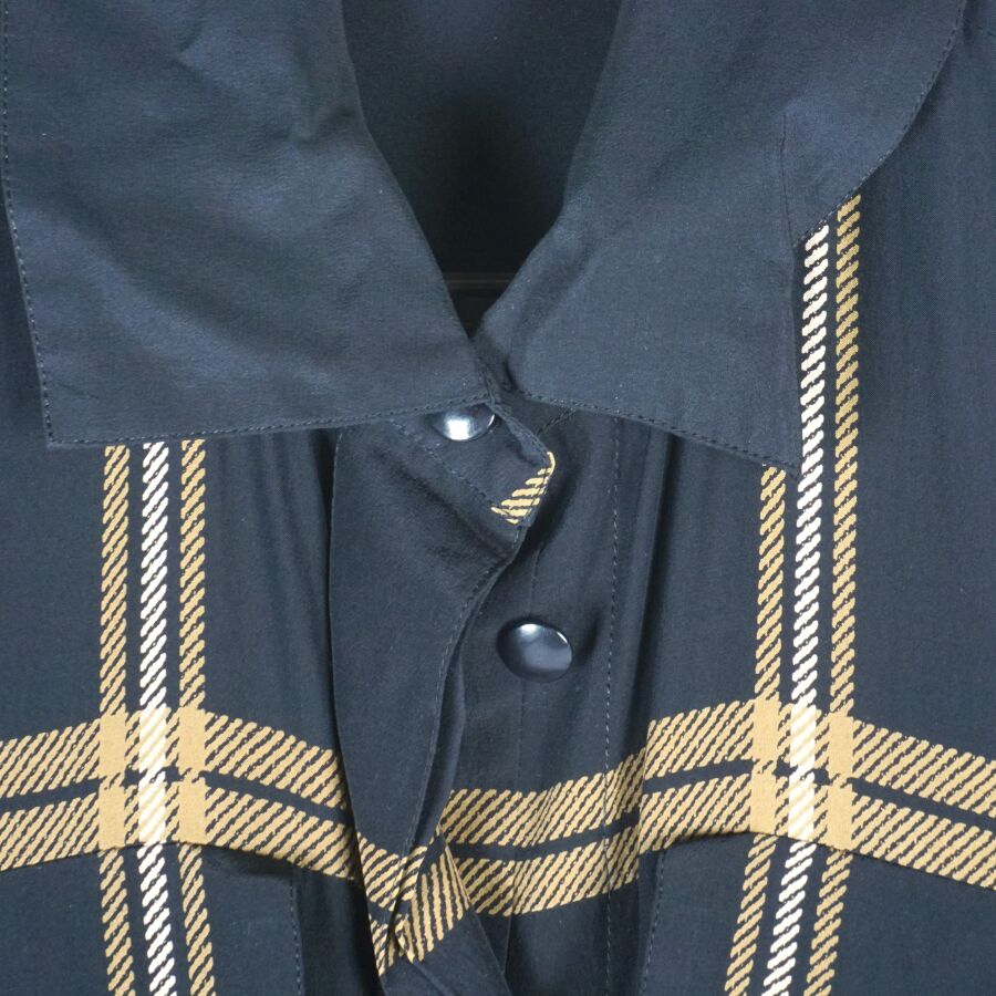 CHRISTIAN DIOR - COORDONNES : Tunique - chemisier en soie à motif rayé beige et ocre sur fond noir, fermeture partielle à l'avant par six boutons en bakélite noire, col chemisier, quatre poches, deux en partie basse, deux autres en partie haute, manches courtes voire 3/4, étiquette intérieure, taille supposée M, présentée avec son cintre logoté, H. Totale : 81 cm (taches à l'étiquette intérieure, petits fils tirés).