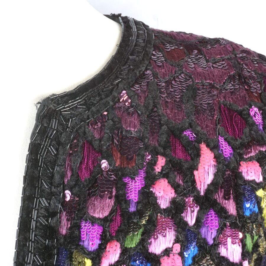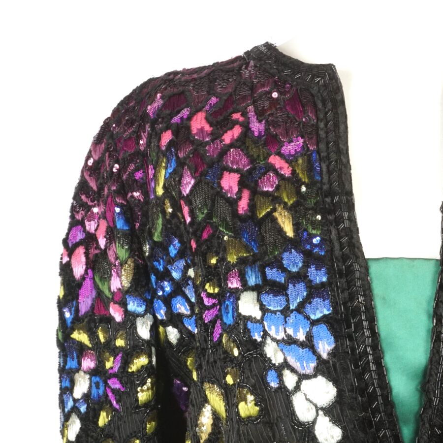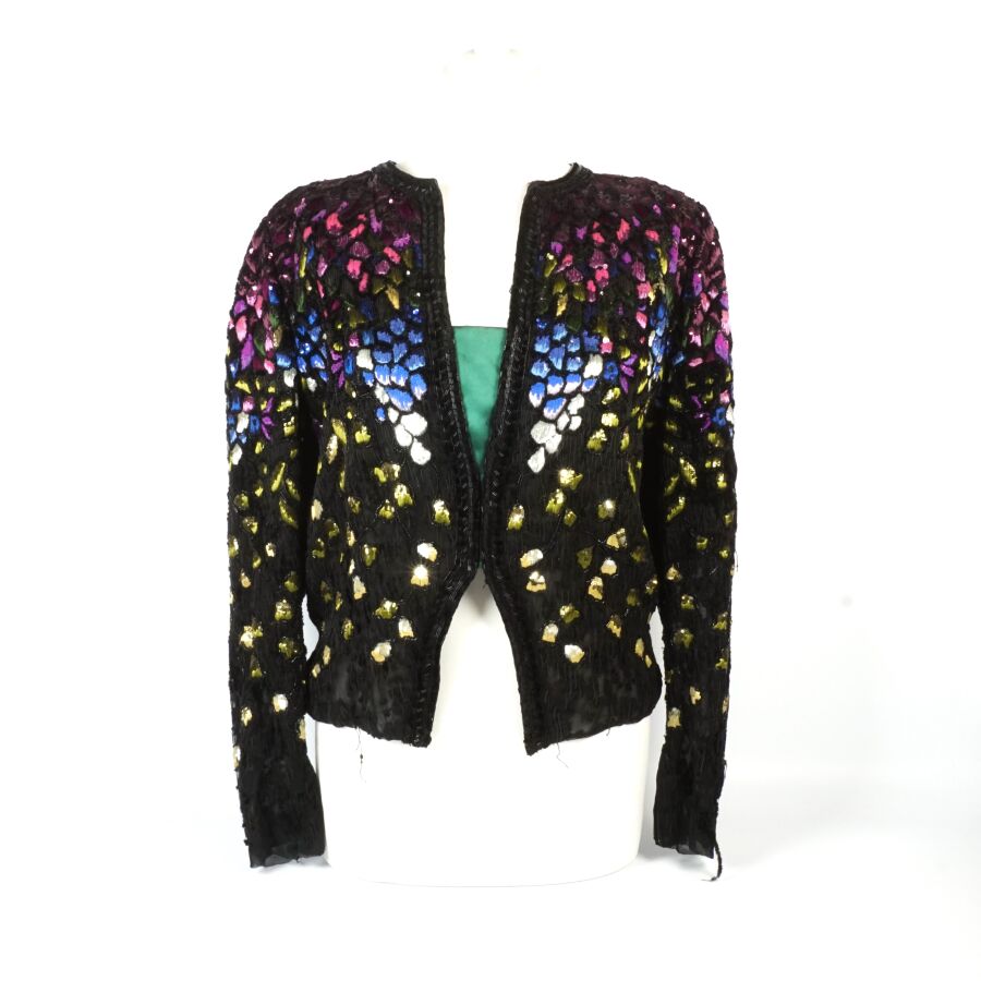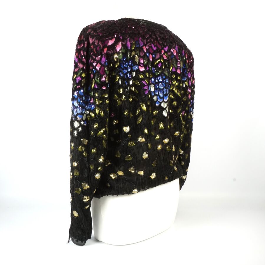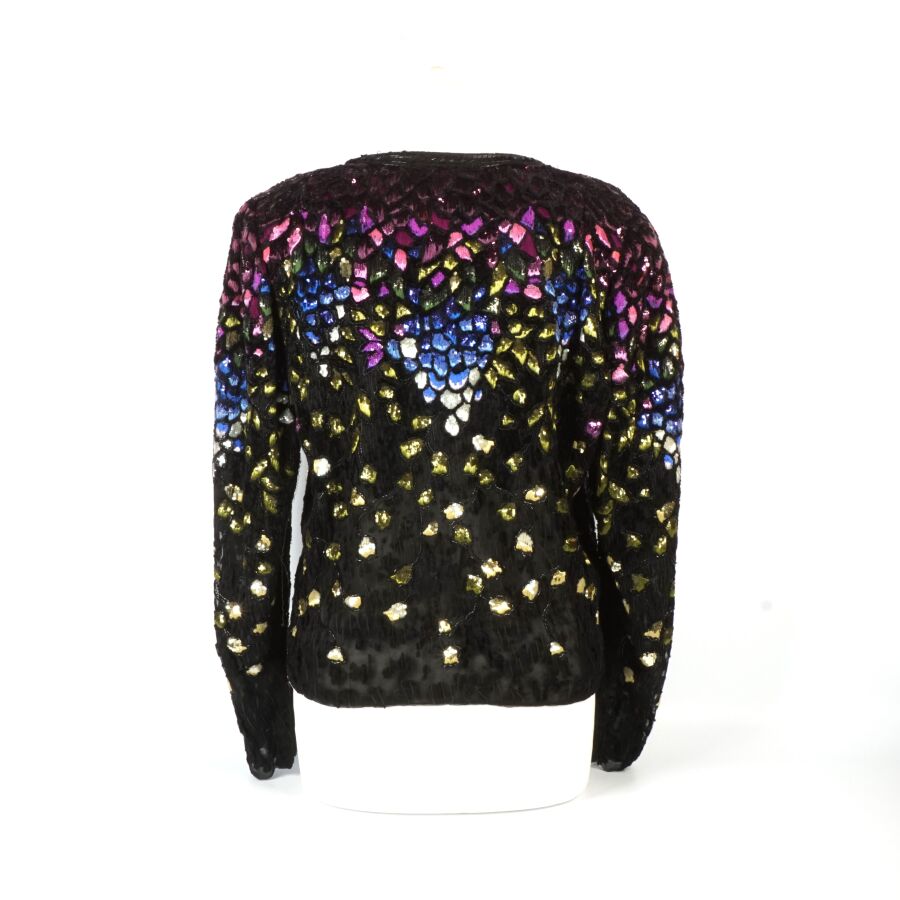 CHRISTIAN DIOR : Élégant top en soie, sequins polychromes et perles de verre noir, col rond ouvert sur le décolleté, fermeture par un empiècement vert à 9 boutons pression, manches longues, fermeture aux extrémités des manches par un zip, sans étiquette, taille supposée M, L. Totale : 53 cm (fils tirés et quelques manques, épaulettes intérieures en l'état).