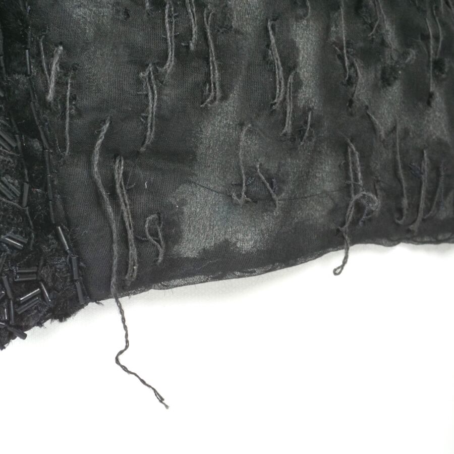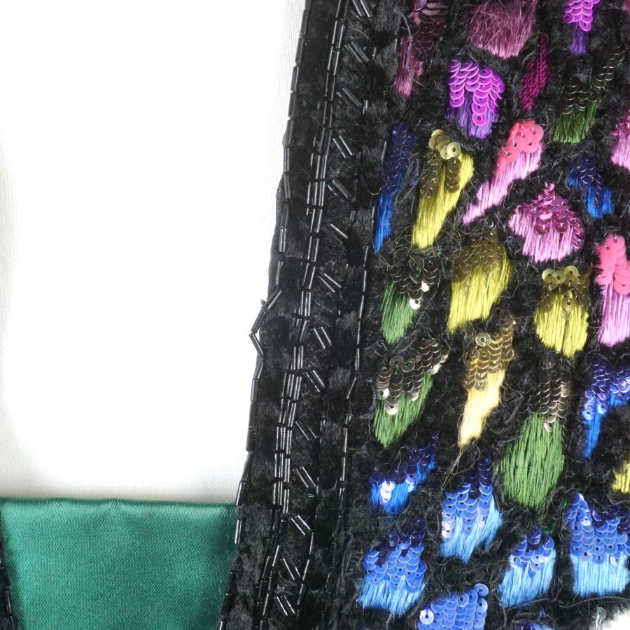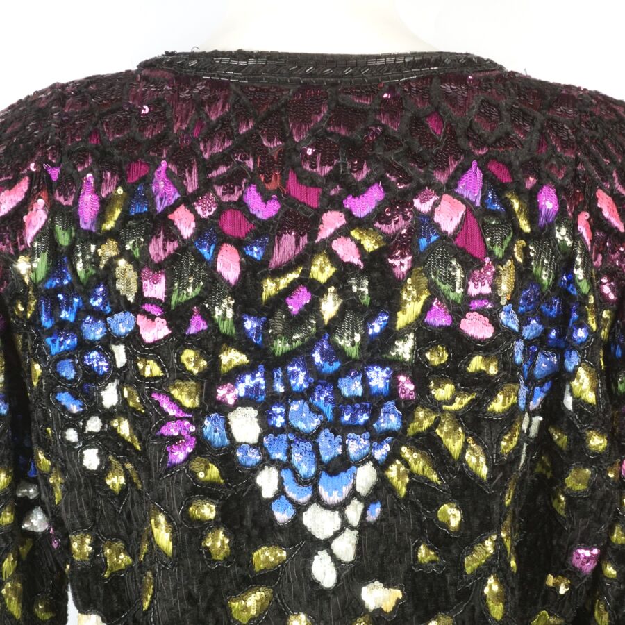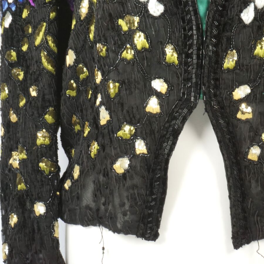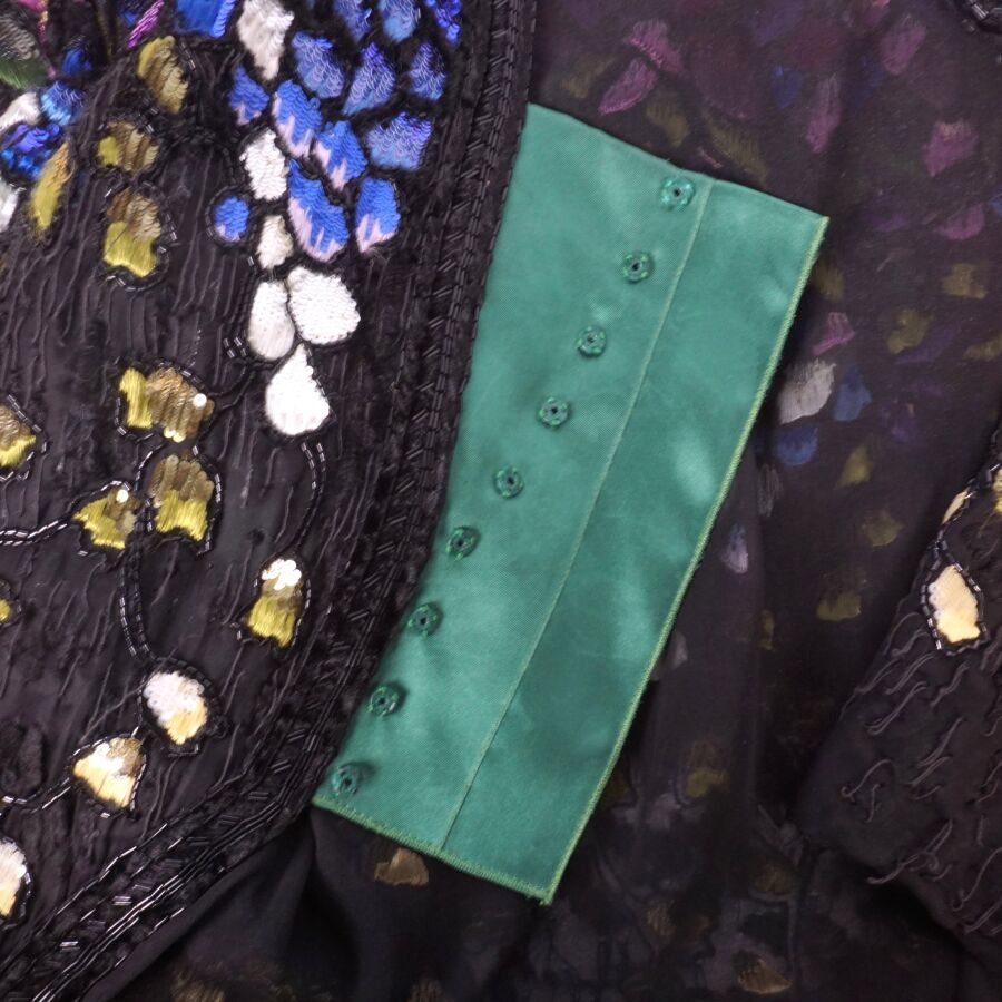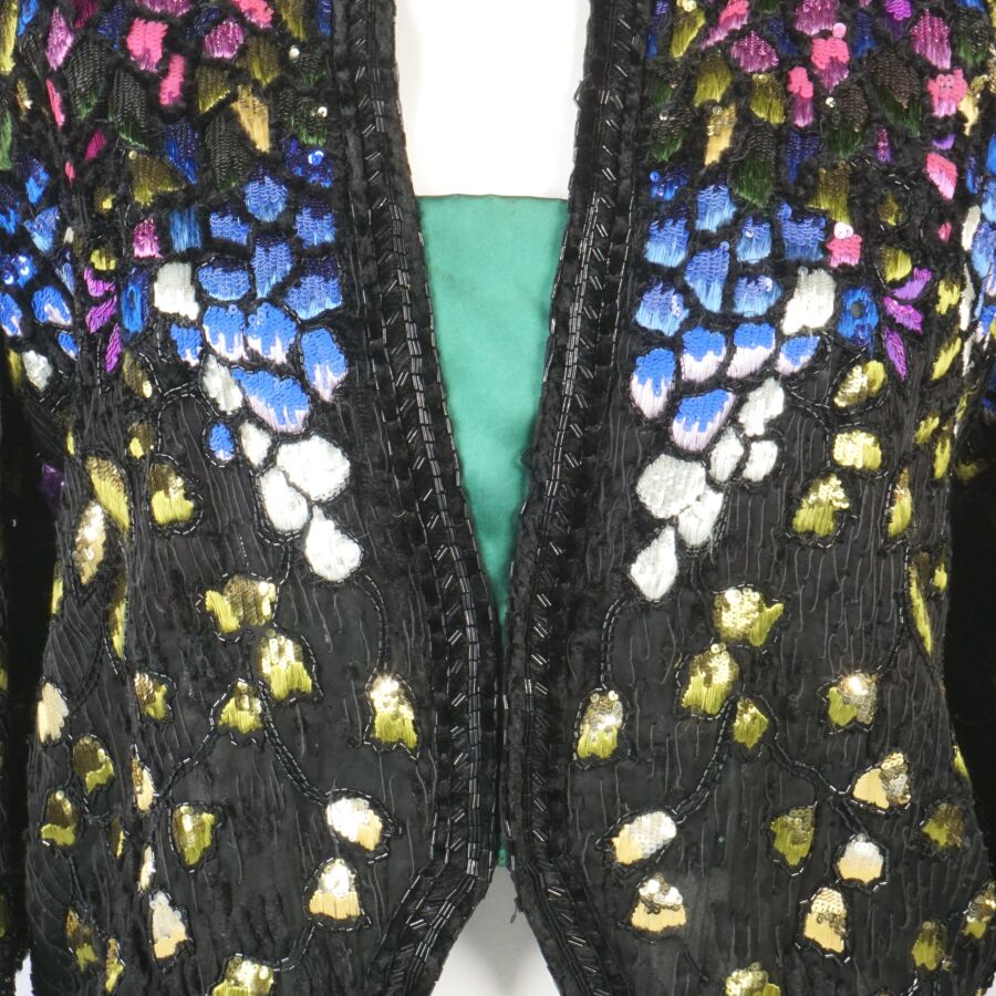 CHRISTIAN DIOR : Élégant top en soie, sequins polychromes et perles de verre noir, col rond ouvert sur le décolleté, fermeture par un empiècement vert à 9 boutons pression, manches longues, fermeture aux extrémités des manches par un zip, sans étiquette, taille supposée M, L. Totale : 53 cm (fils tirés et quelques manques, épaulettes intérieures en l'état).