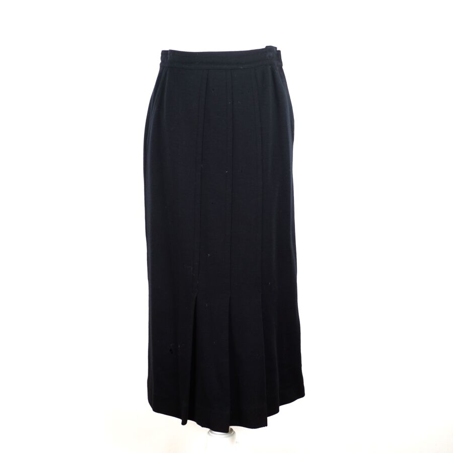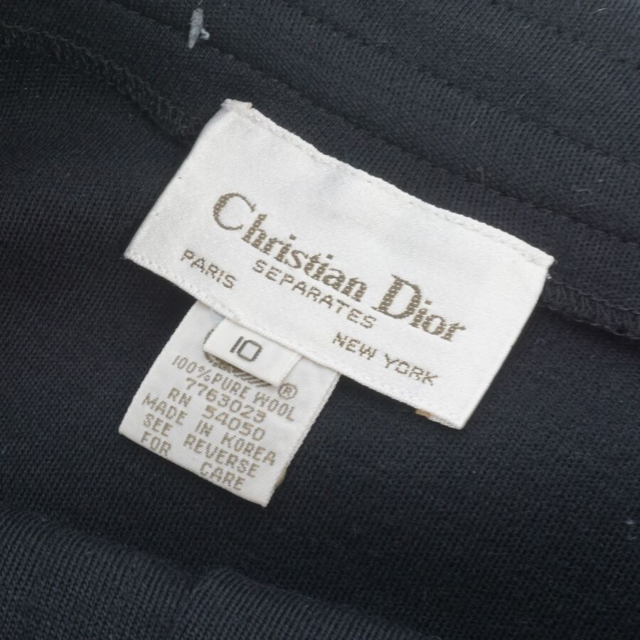 CHRISTIAN DIOR : Jupe évasée en laine de couleur noire, fermeture latérale à la taille par un bouton et un crochet, étiquette intérieure, taille indiquée 10, L. Totale : 84 cm. Larg. Taille : 36 cm (trous, usures).