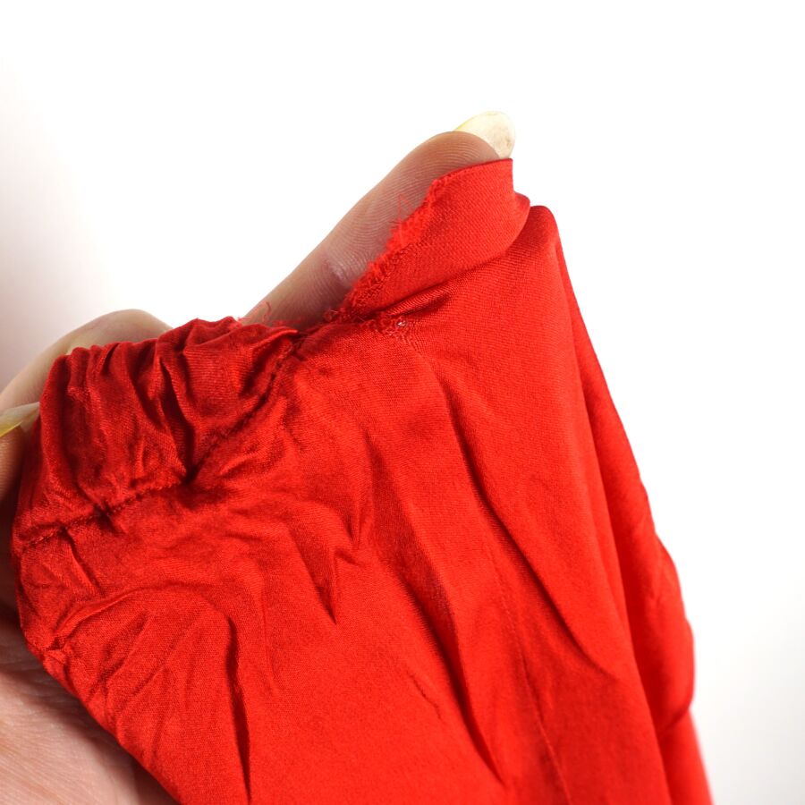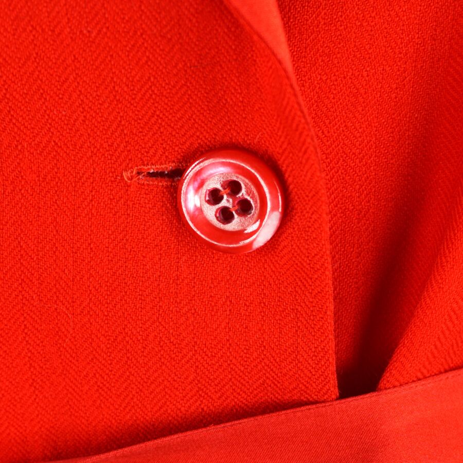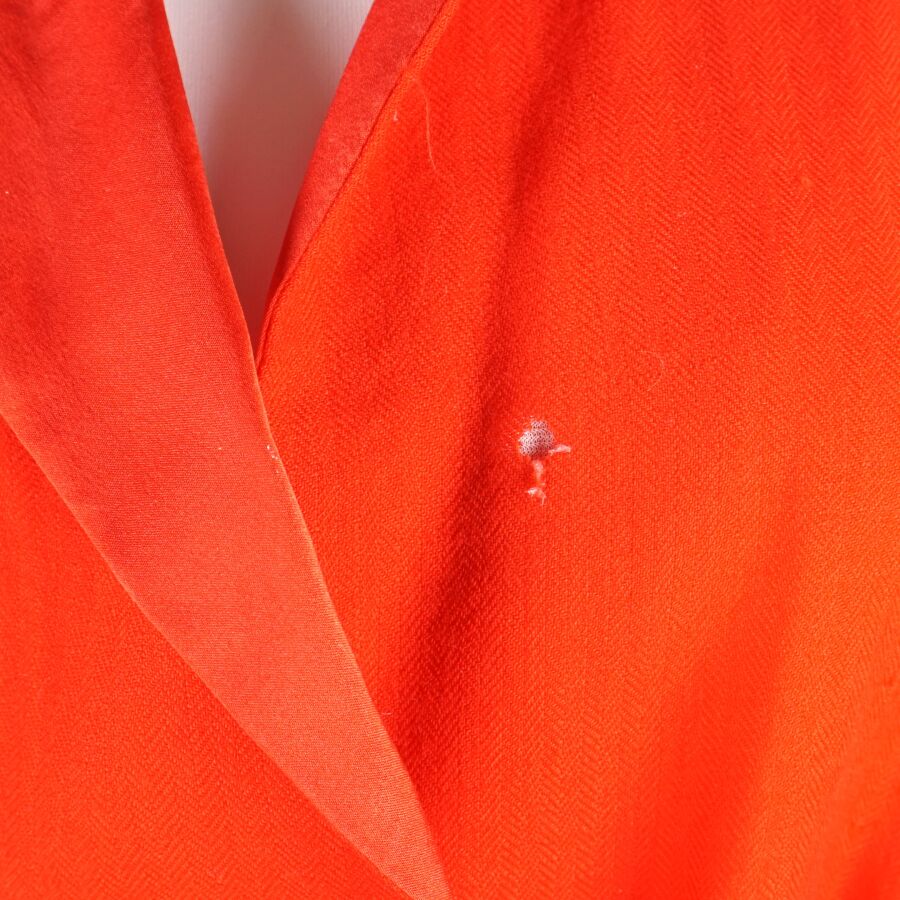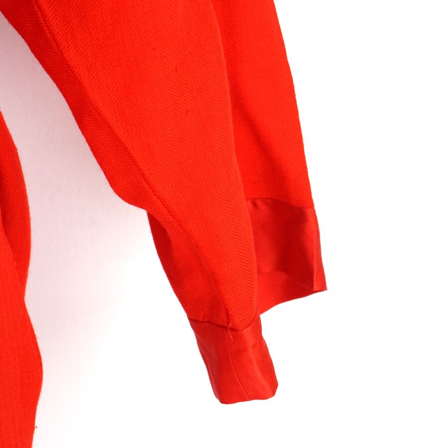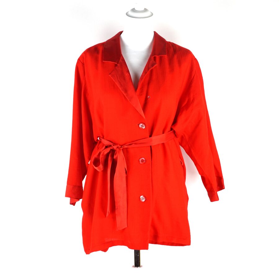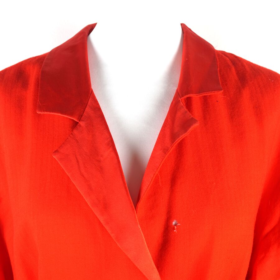 CHRISTIAN DIOR - LINGERIE : Ensemble en laine et soie de couleur rouge, comprenant une veste à col dit tailleur, fermant par trois boutons à l'avant, manches 3/4 avec sa ceinture, et pantalon en soie, taille élastique, taille indiquée 42, L. Veste : 77 cm environ. L. Pantalon : 96 cm (élastique du pantalon en l'état, déchirure, petit trou).