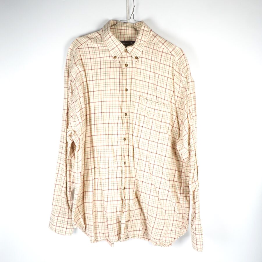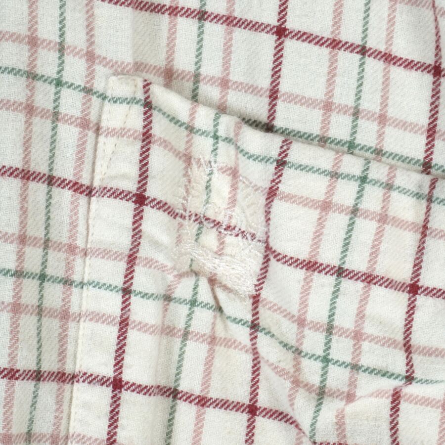 CHRISTIAN DIOR MONSIEUR - BOUTIQUE : Chemise en coton à motif rayé de couleur vert, rose et bordeaux sur fond beige-écru, fermeture à l'avant par six boutons marrons, manches longues avec fermeture à l'extrémité par un bouton, poche latérale haute ornée du monogramme "CD" brodé, étiquette intérieure, L. Totale : 80 cm environ (infimes petites usures).