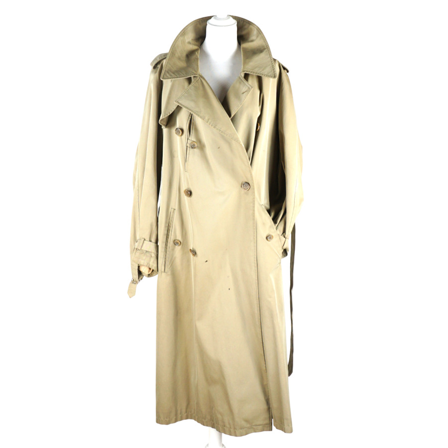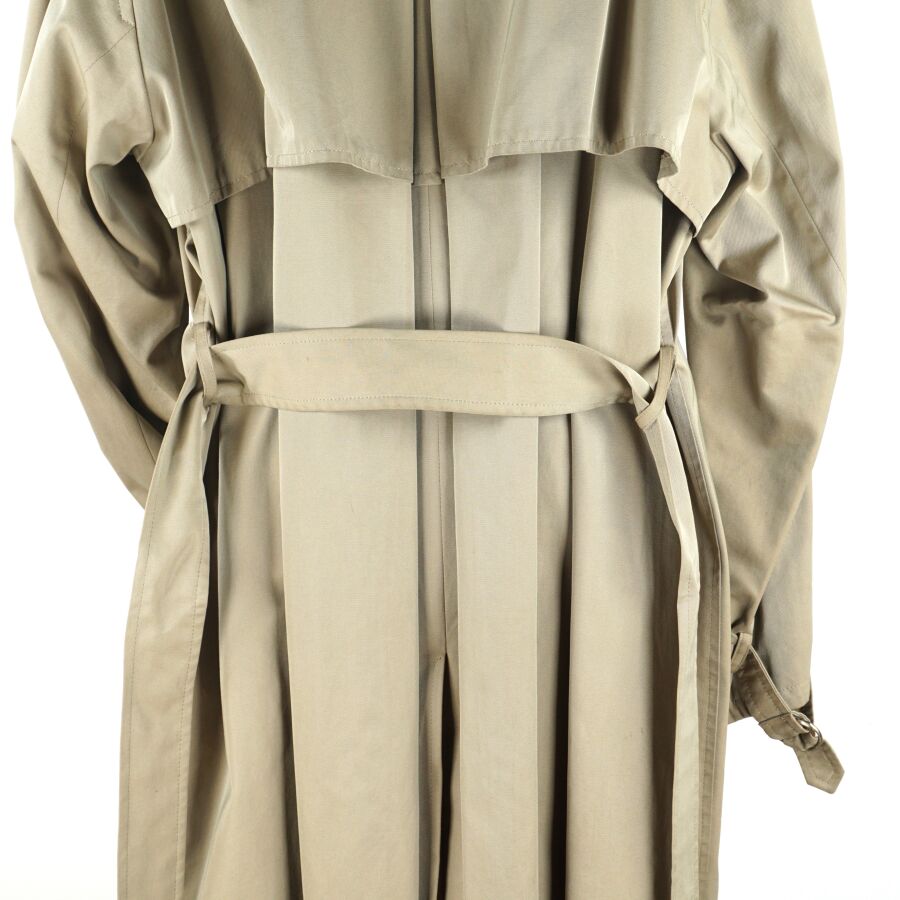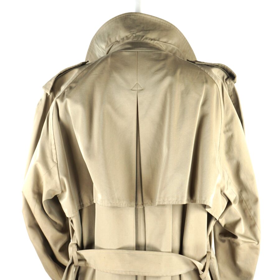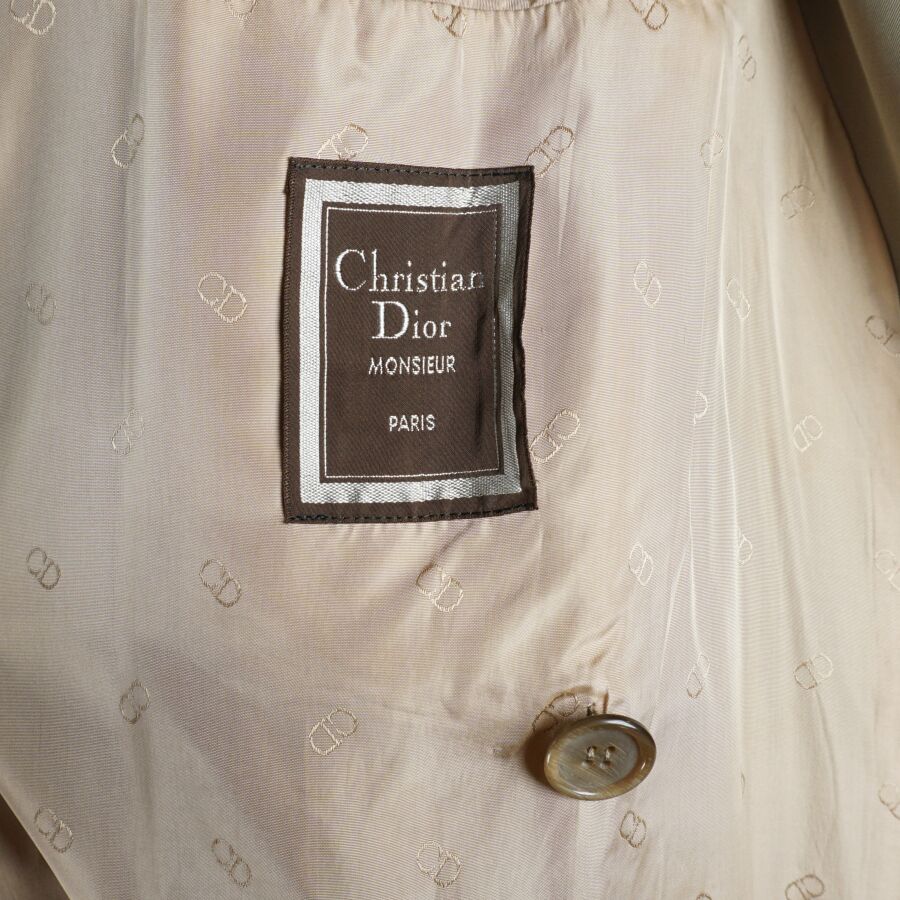 CHRISTIAN DIOR - MONSIEUR : Trench-coat, toile de coton beige-marron, deux poches externes basses, une poche haute latérale, fermeture par bouton, sangles aux extrémités des manches, avec sa ceinture, doublure en soie beige logotée "CD", étiquette intérieure, pochette interne latérale, fendu à l'arrière, bouton complémentaire cousu à l'intérieur, présenté avec son cintre d'origine, H. Totale : 125 cm (traces, petits trous).