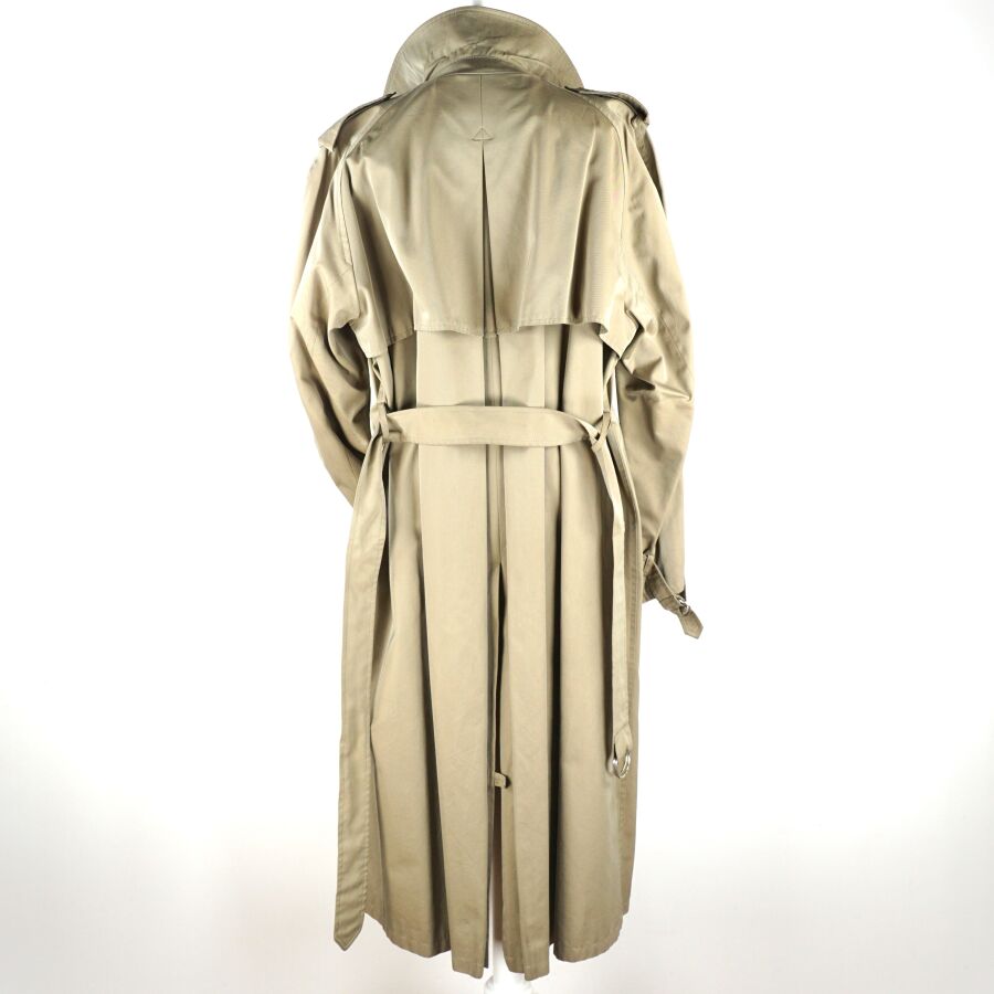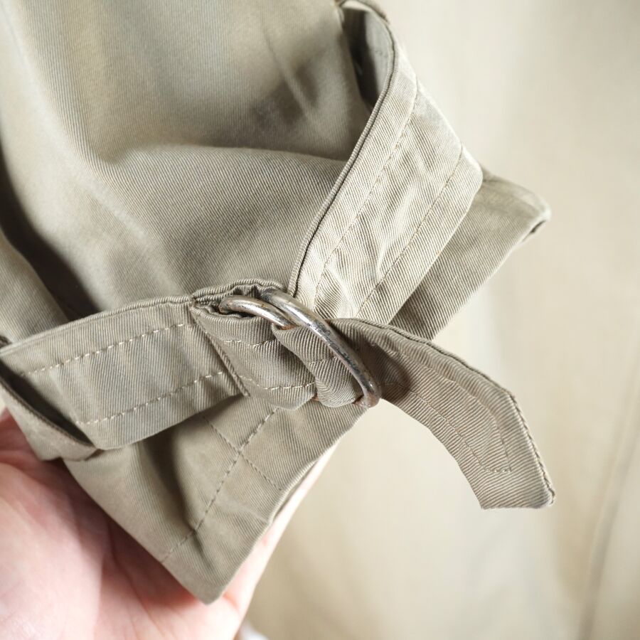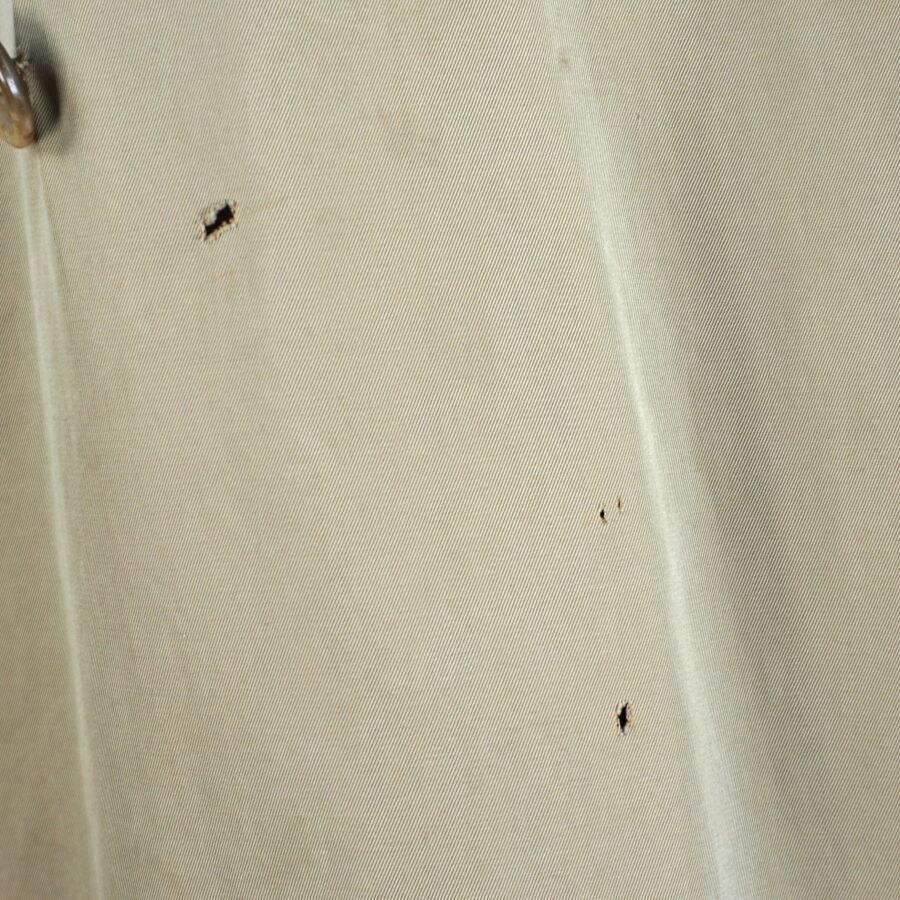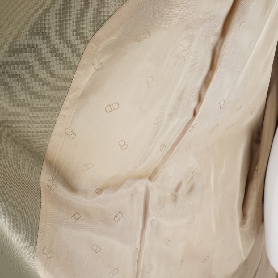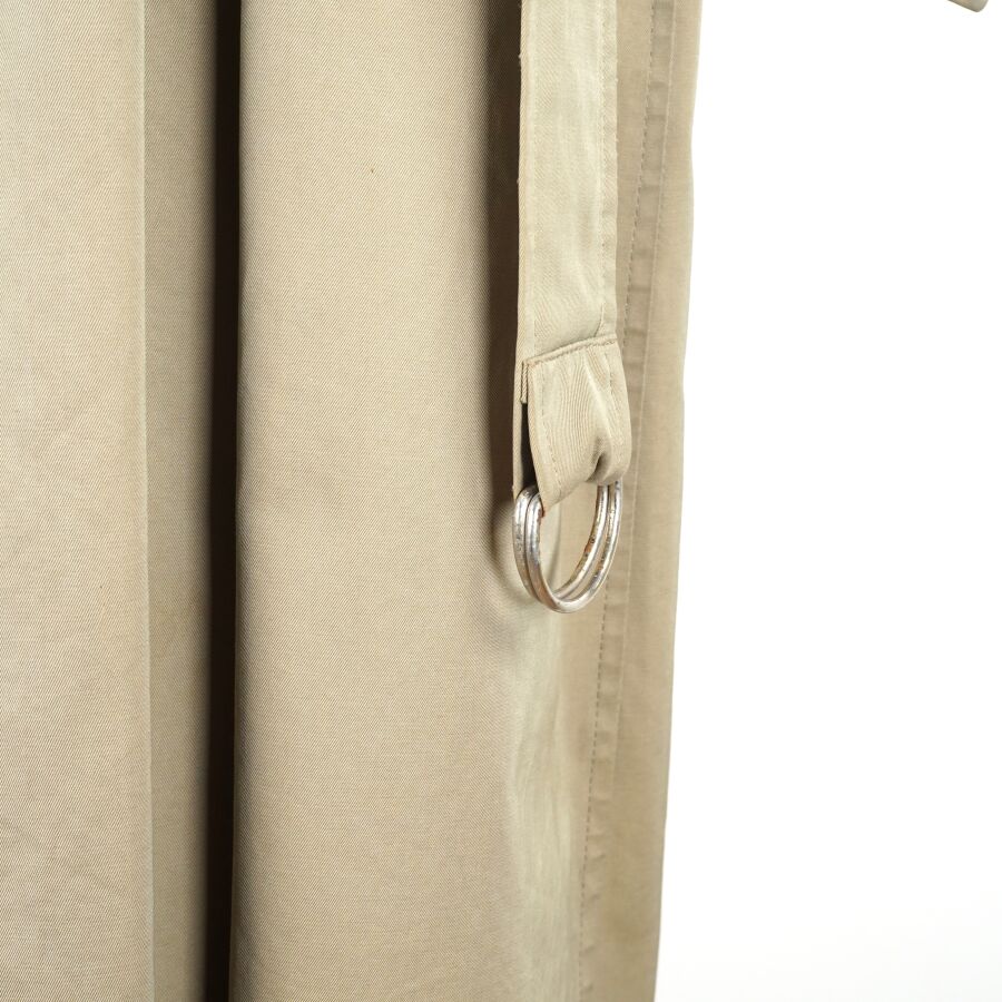 CHRISTIAN DIOR - MONSIEUR : Trench-coat, toile de coton beige-marron, deux poches externes basses, une poche haute latérale, fermeture par bouton, sangles aux extrémités des manches, avec sa ceinture, doublure en soie beige logotée "CD", étiquette intérieure, pochette interne latérale, fendu à l'arrière, bouton complémentaire cousu à l'intérieur, présenté avec son cintre d'origine, H. Totale : 125 cm (traces, petits trous).