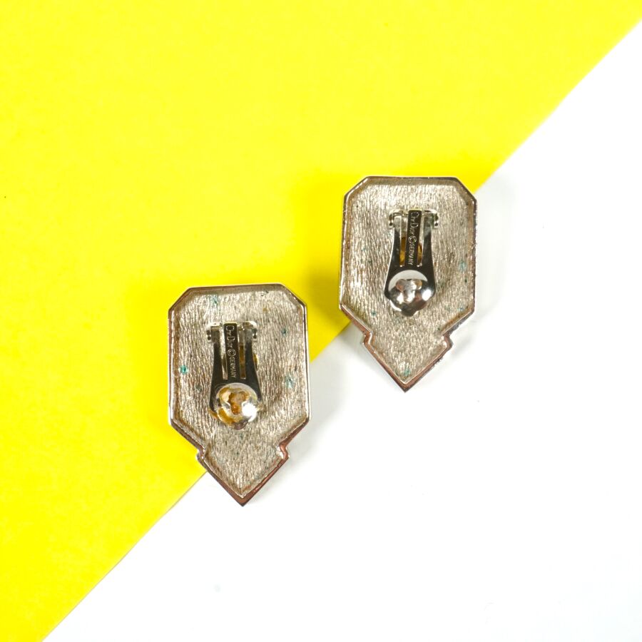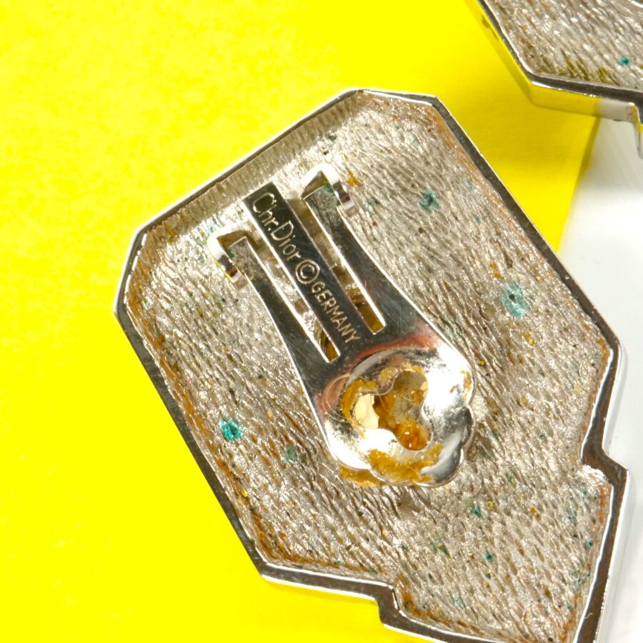 CHRISTIAN DIOR : Paire de clips d'oreille architecturés style Art Déco, métal argenté et strass, signés au revers, Dim. 4 x 2.5 cm (sans caoutchouc, usures).