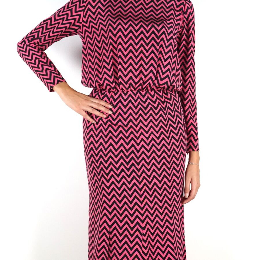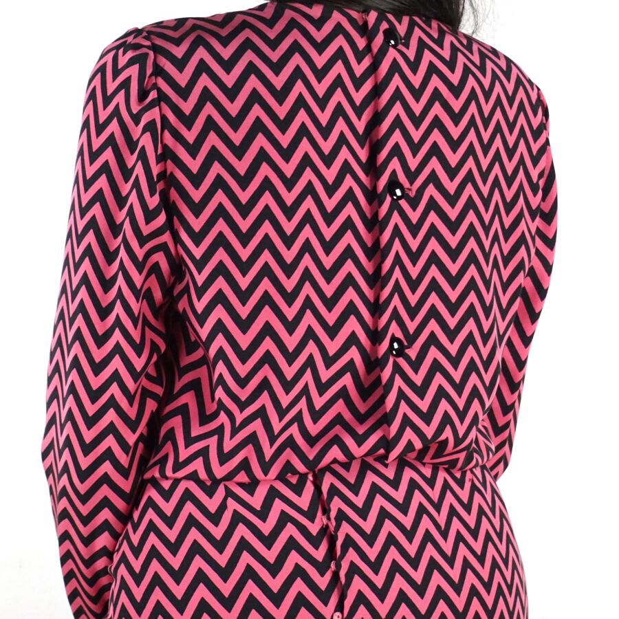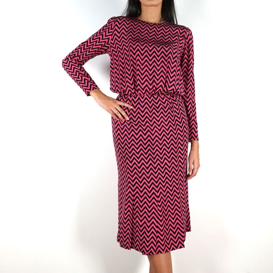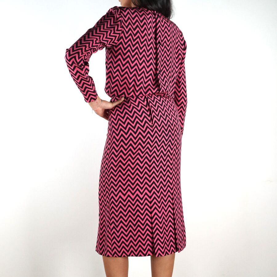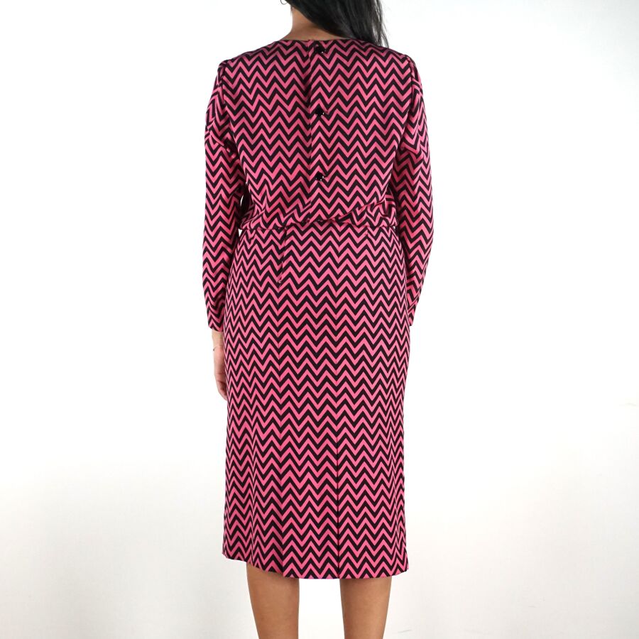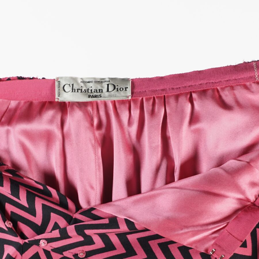 CHRISTIAN DIOR - PARIS : Collection Automne - Hiver 1984, Robe en soie rose et noir à motif rayé, col rond, épaulettes, fermeture à l'arrière par un bouton pression et quatre boutons en bakélite noir jusqu'à la taille, fermeture à six boutons pression à la taille, étiquette intérieure numérotée, manches longues à fermeture zippée à l'extrémité, présentée avec son cintre logoté, taille supposée S/M, H. Totale : 126 cm (petites taches).