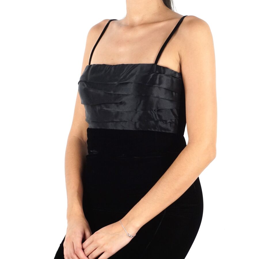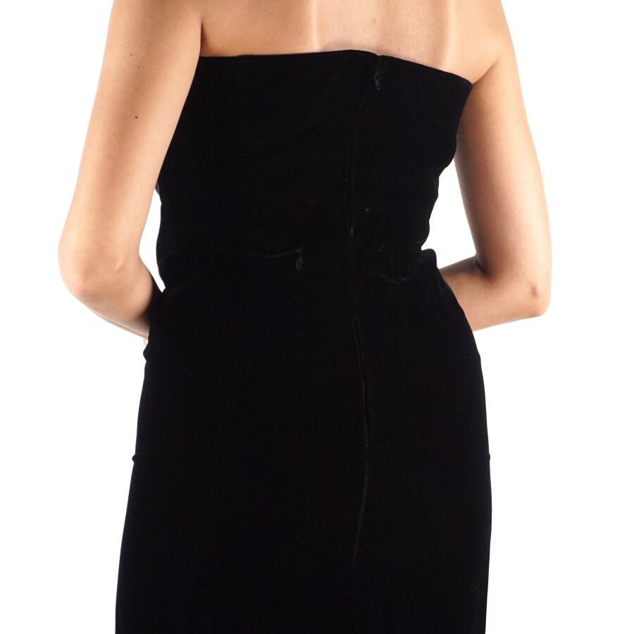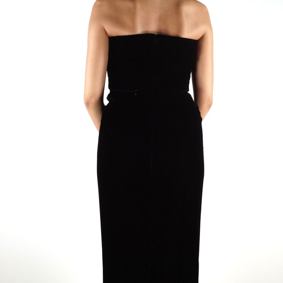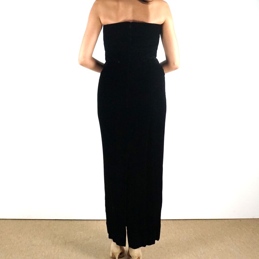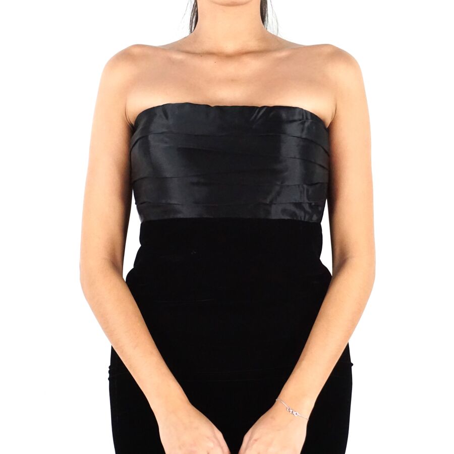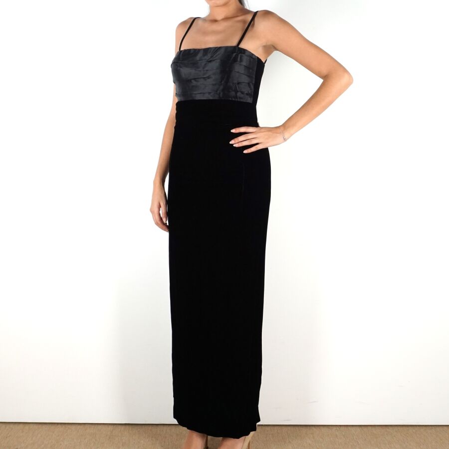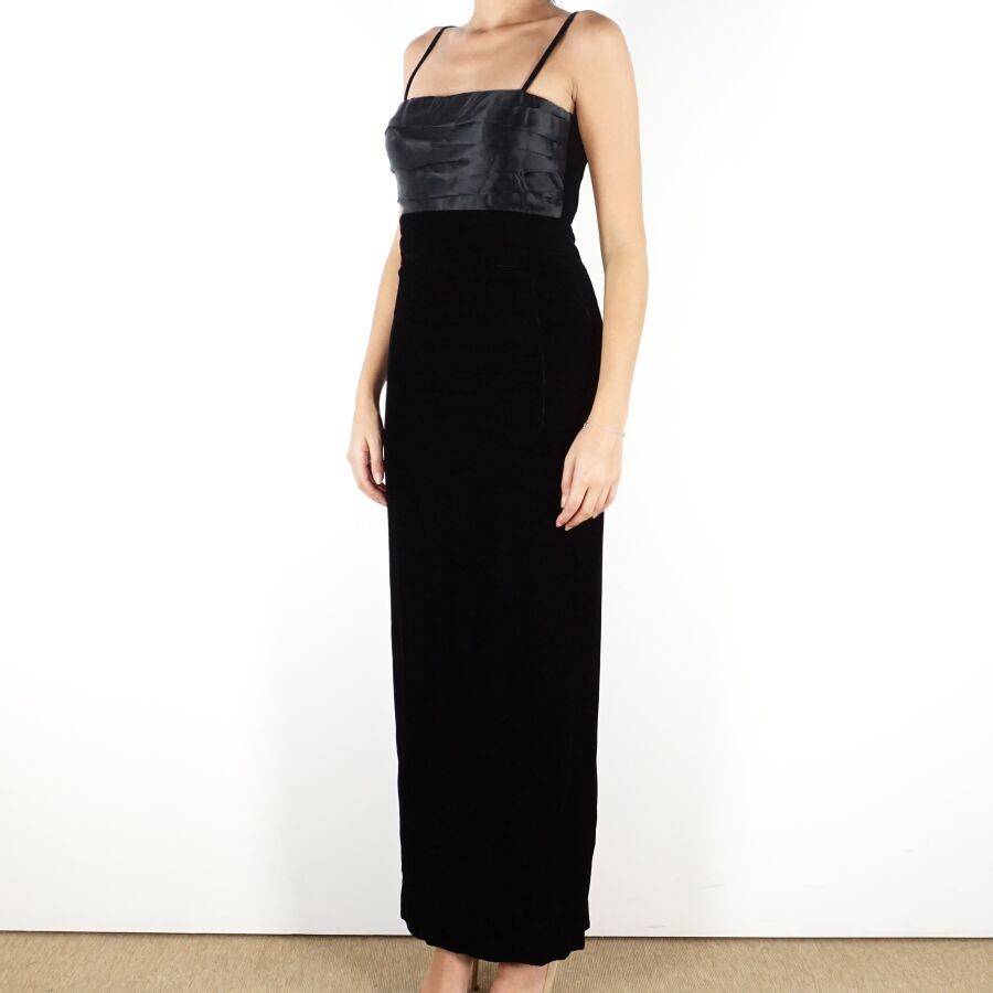 CHRISTIAN DIOR - PARIS : Collection Automne - Hiver 1984, Belle robe du soir type bustier en laine, soie, satin et rayonne noir, bustier plissé, bretelles fines non ajustables, étiquette intérieure numérotée, double fermeture zippée au dos (une pour la doublure), fendue à l'arrière, taille supposée M, présentée avec son cintre logoté, H. Hors bretelles : 129 cm environ. H. Bretelles : 20.4 cm.
