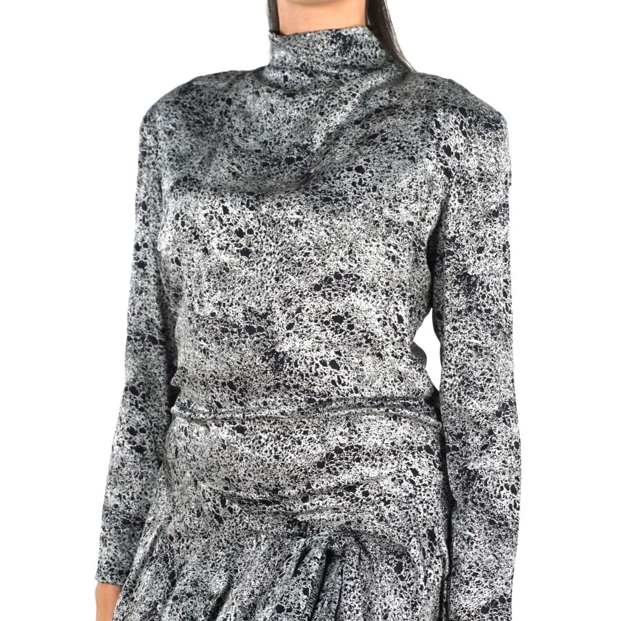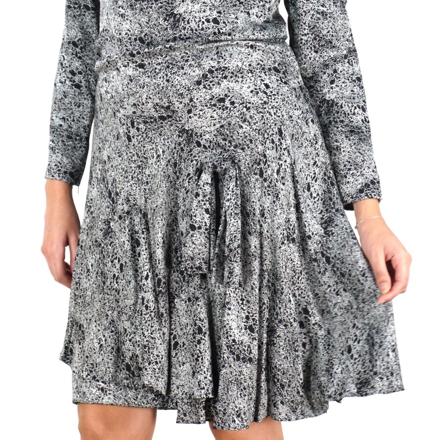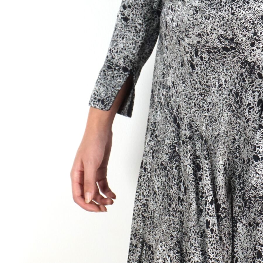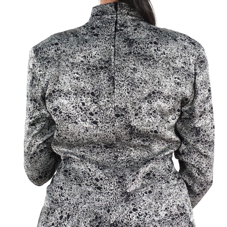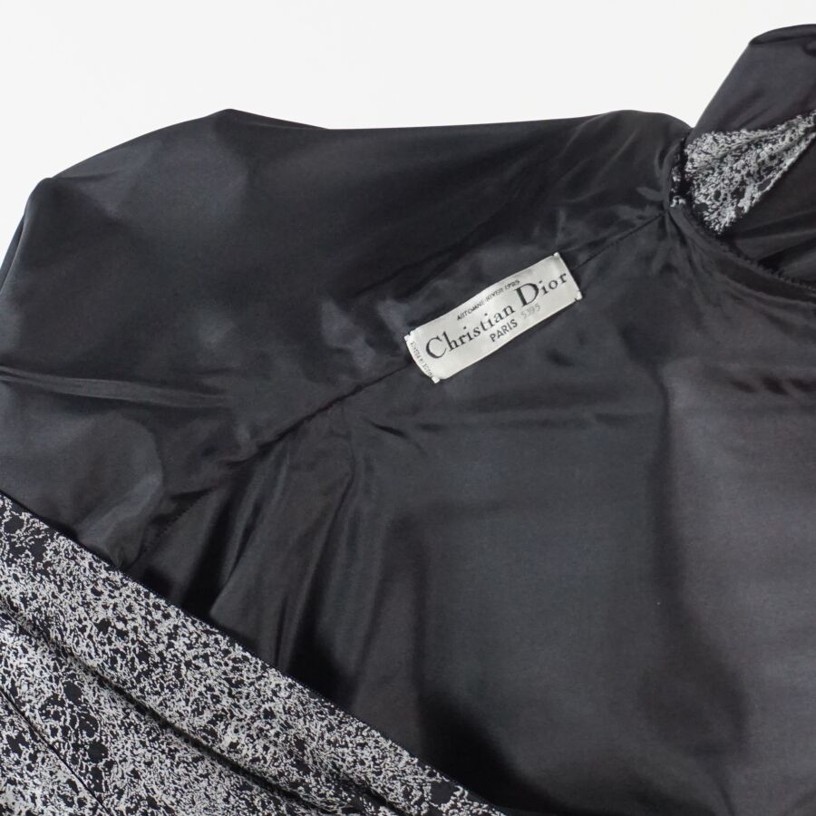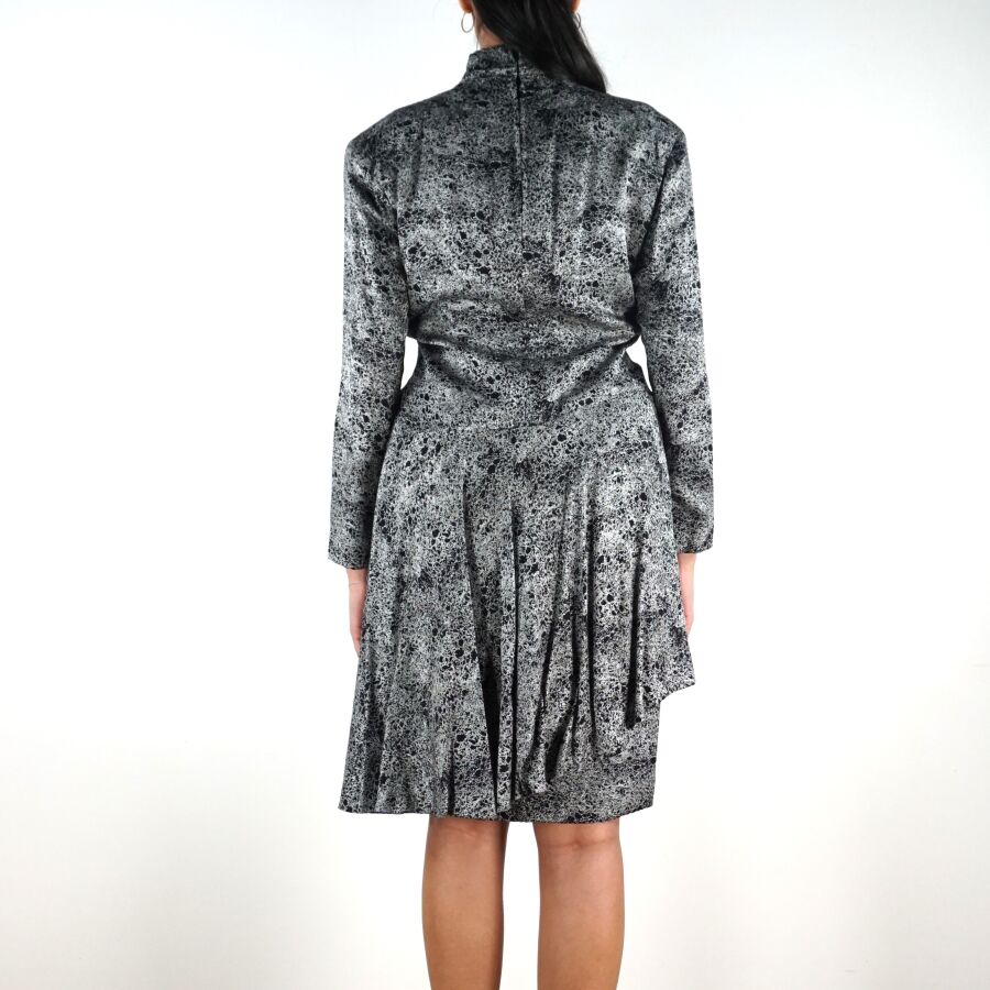 CHRISTIAN DIOR - PARIS : Collection Automne - Hiver 1985, Robe en soie de couleur grise et noire, col montant, fermeture à l'arrière zippée, manches longues, partie basse dite "volante" ornée d'un noeud cousu, taille supposée S/M, étiquette intérieure numérotée, présentée avec son cintre logoté, H. Totale : 112 cm.
