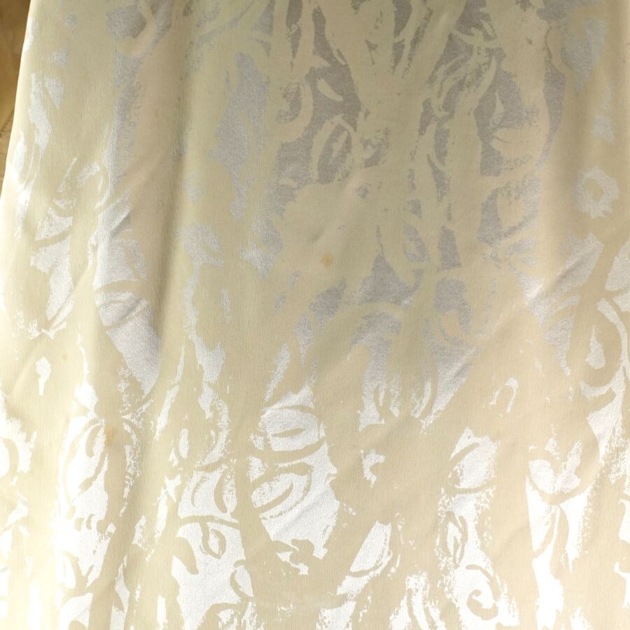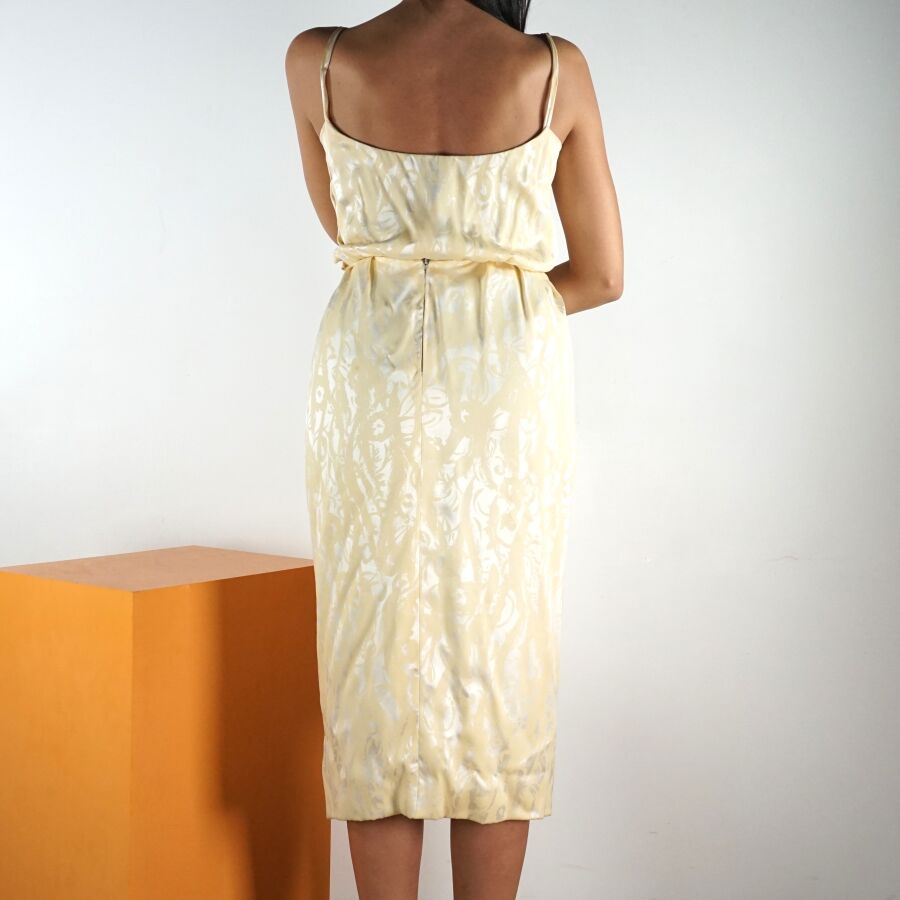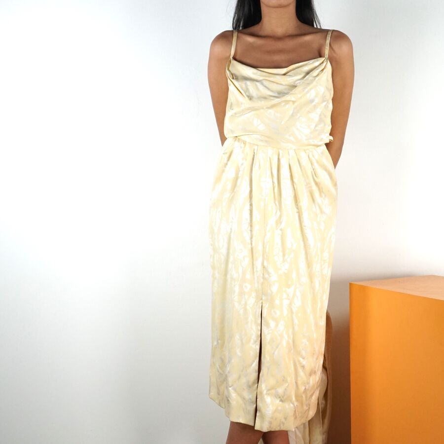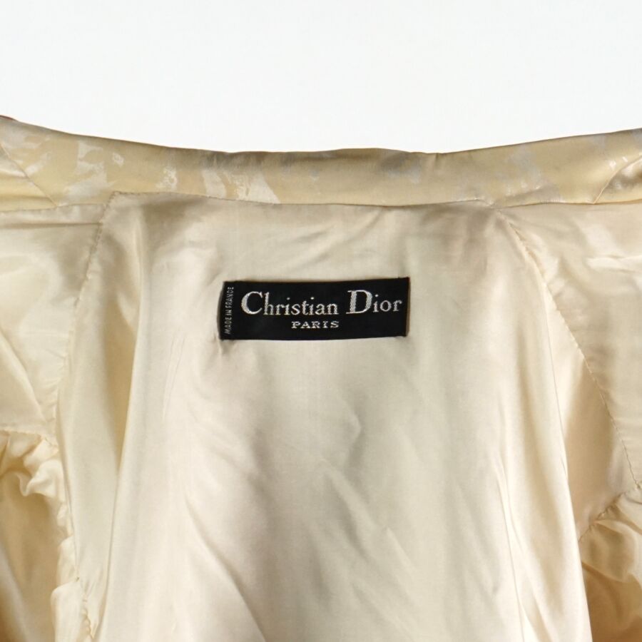 CHRISTIAN DIOR - PARIS : Élégant ensemble en soie crème - jaune et écru, comprenant une veste longue à motif brodé de perles blanches et sequins, deux poches latérales basses, doublure intérieure en soie blanche-écru et sa robe longue à bretelles, décolleté légèrement plissé, fermeture par boutons pression et fermeture zippée à l'arrière, bretelles non ajustables, taille supposée S/M présentée avec son cintre logoté, H. Totale : 88.5 cm. L. Totale Robe (hors bretelles) : 108.5 cm. H. Bretelles : 14 cm environ (quelques petites taches).