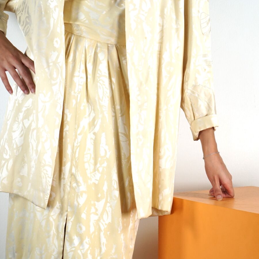 CHRISTIAN DIOR - PARIS : Élégant ensemble en soie crème - jaune et écru, comprenant une veste longue à motif brodé de perles blanches et sequins, deux poches latérales basses, doublure intérieure en soie blanche-écru et sa robe longue à bretelles, décolleté légèrement plissé, fermeture par boutons pression et fermeture zippée à l'arrière, bretelles non ajustables, taille supposée S/M présentée avec son cintre logoté, H. Totale : 88.5 cm. L. Totale Robe (hors bretelles) : 108.5 cm. H. Bretelles : 14 cm environ (quelques petites taches).