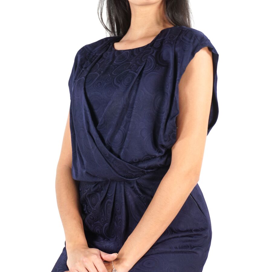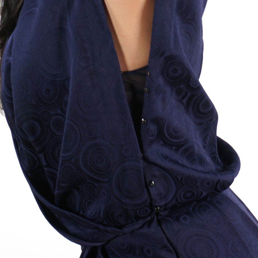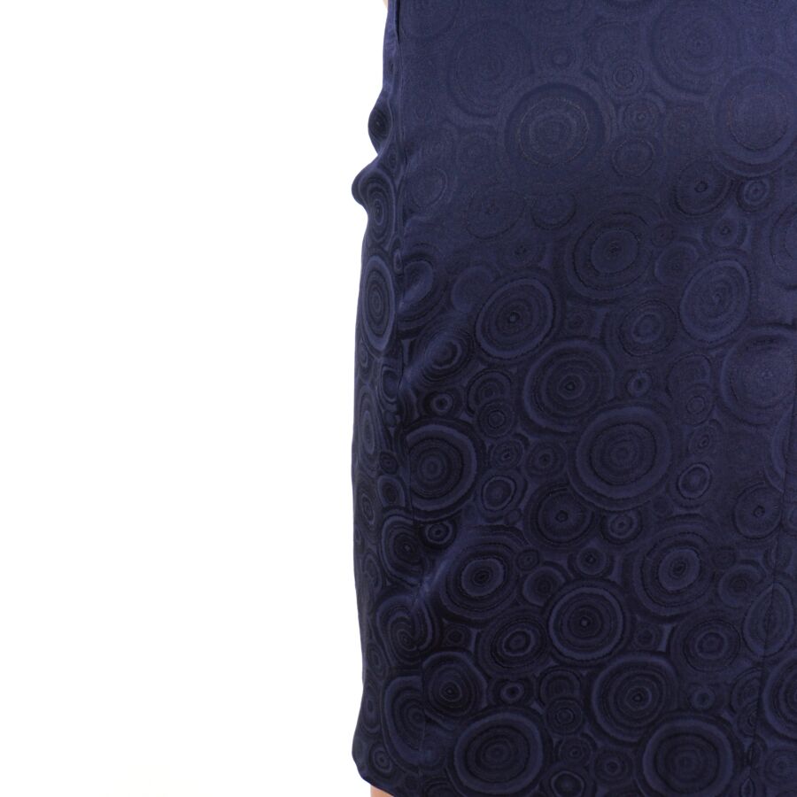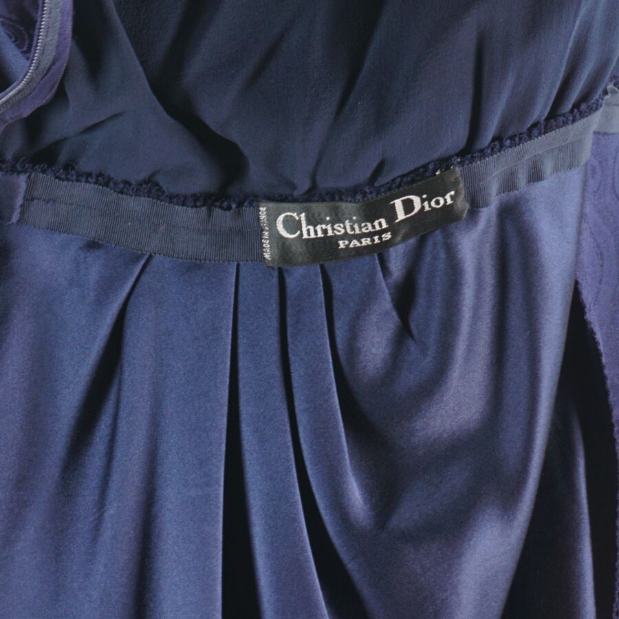 CHRISTIAN DIOR - PARIS : Élégante robe en soie de couleur bleue nuit à motifs graphiques, col à plastron s'encastrant dans un col en V, attache par trois agrafes à l'épaule, manches courtes épaules, fermeture zippée latérales et boutons pression sur le côté, étiquette intérieure, taille supposée S/M, présentée avec son cintre logoté, H. Totale : 114 cm environ.