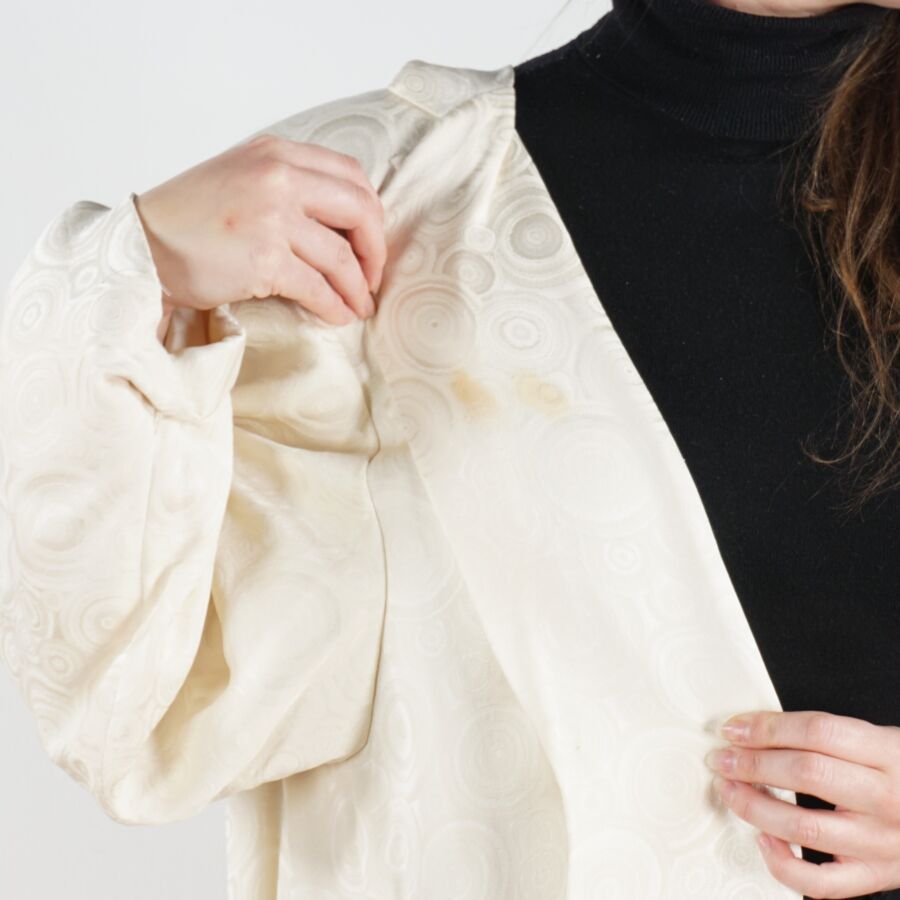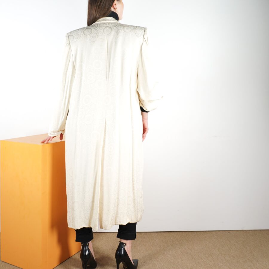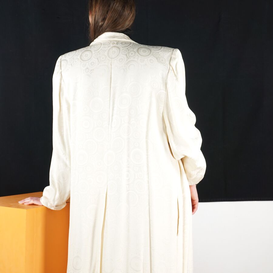 CHRISTIAN DIOR - PARIS : Longue et élégante veste en soie de couleur écrue à motif de spirales, sans fermeture, fendue à l'arrière, étiquette intérieure, taille supposée M, H. Totale : 117 cm (quelques taches, une principale sur le col, étiquette intérieure partiellement décousue).