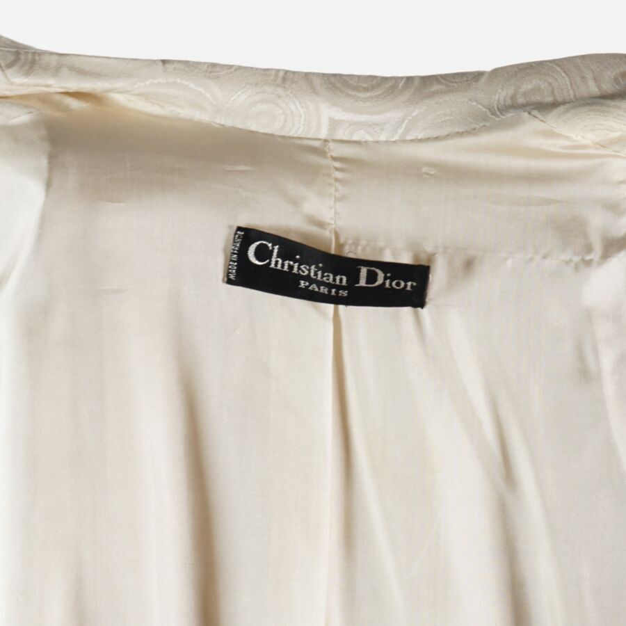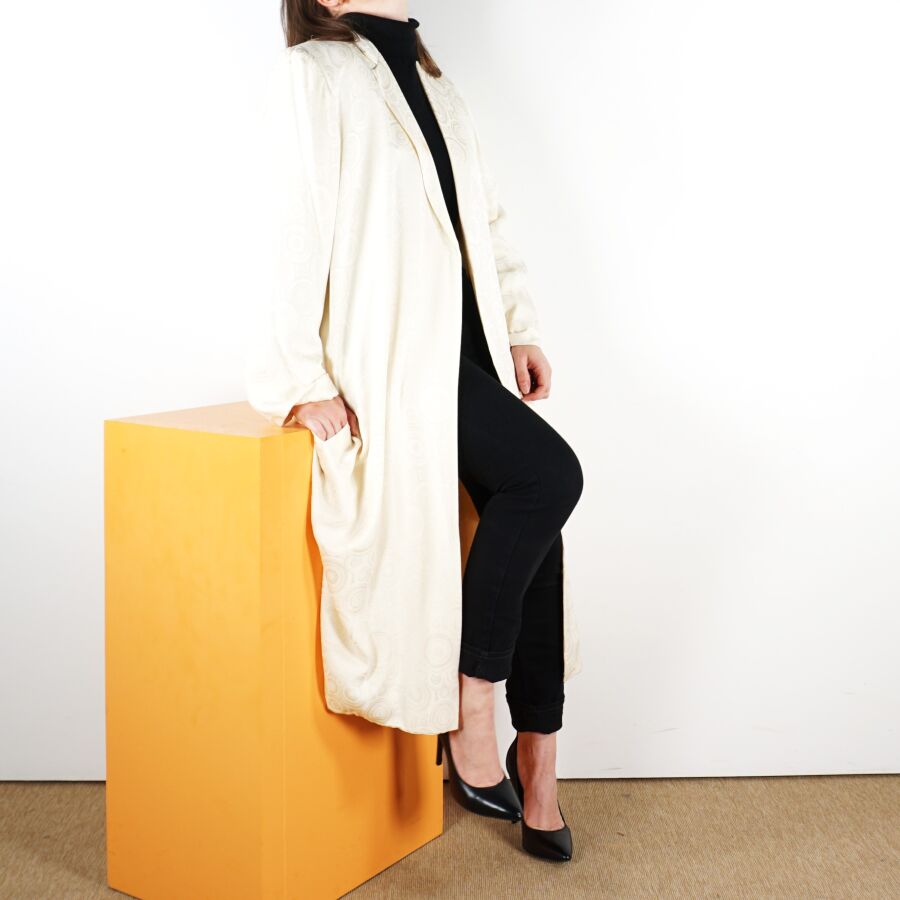 CHRISTIAN DIOR - PARIS : Longue et élégante veste en soie de couleur écrue à motif de spirales, sans fermeture, fendue à l'arrière, étiquette intérieure, taille supposée M, H. Totale : 117 cm (quelques taches, une principale sur le col).