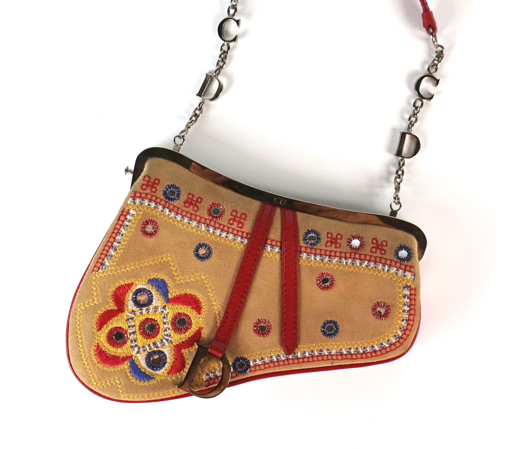 Christian DIOR : Petit sac "Saddle" en daim beige à décor brodé polychrome de fleurs et motifs stylisés, rehaussé de petites plaquettes effet miroir, armature rigide en métal argenté, ouverture par bouton poussoir, anse en cuir rouge et chainette agrémentée des lettres "C" et "D", intérieur tissus monogrammé, signé et numéroté 09BM-1013, édition limitée N°0012, L. 18 cm, H. 14 cm (légères usures et traces, bon état général).