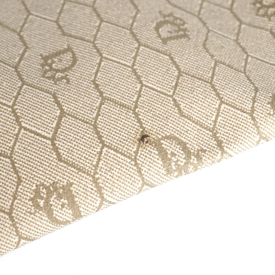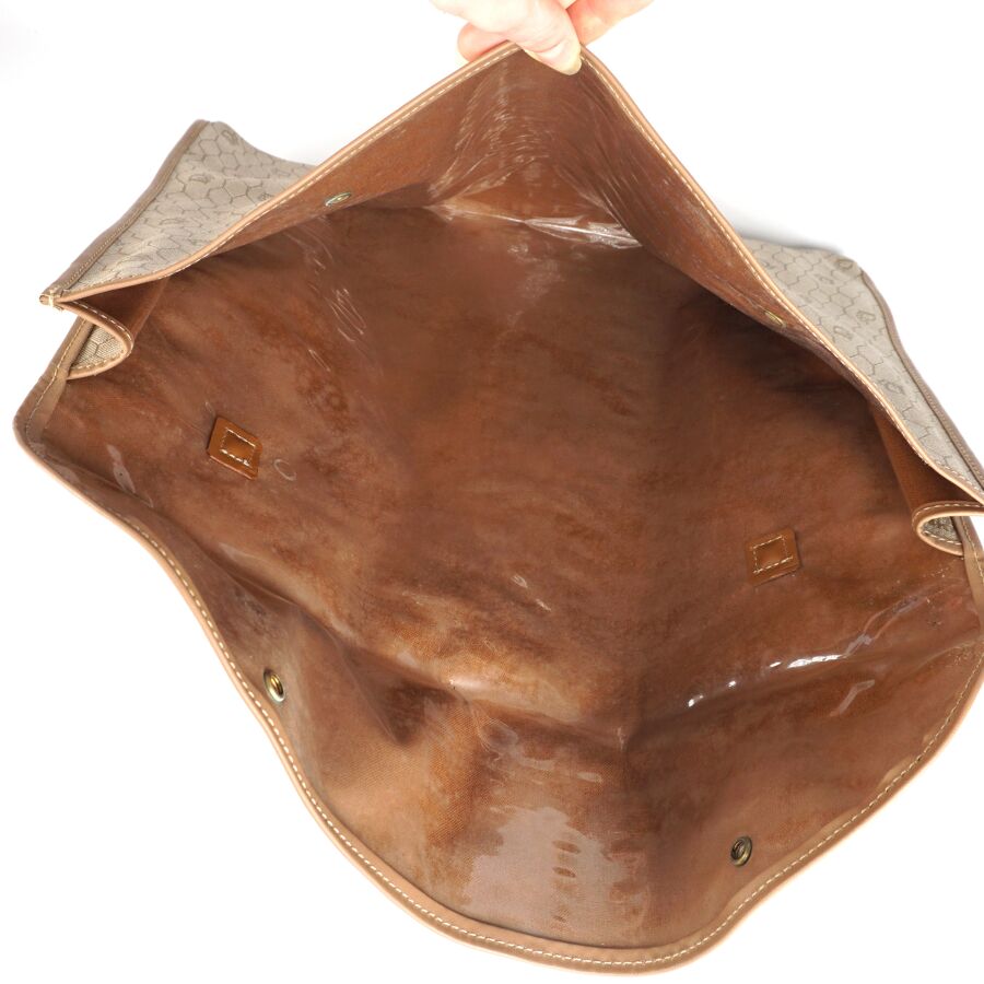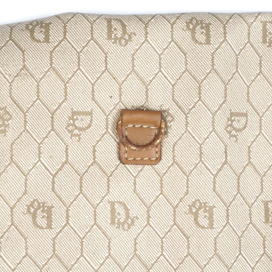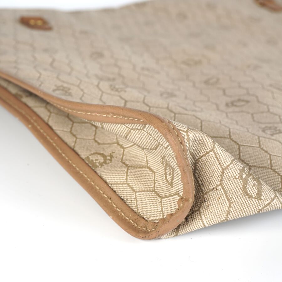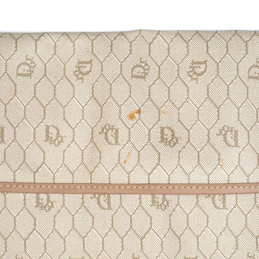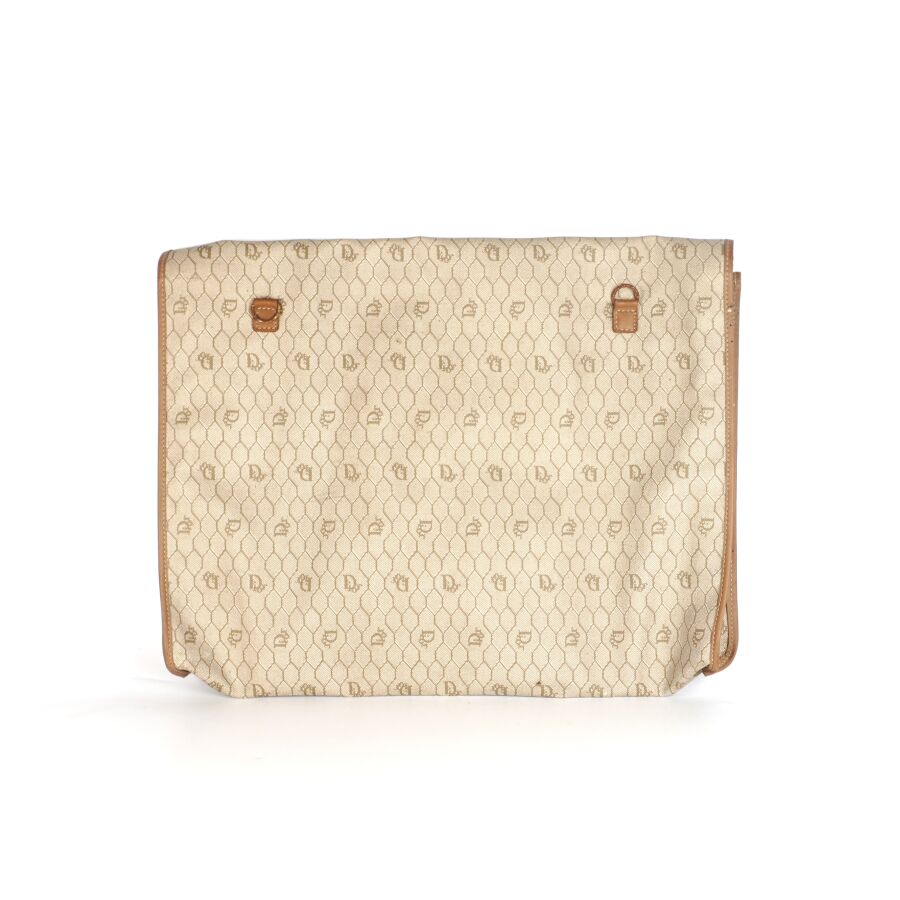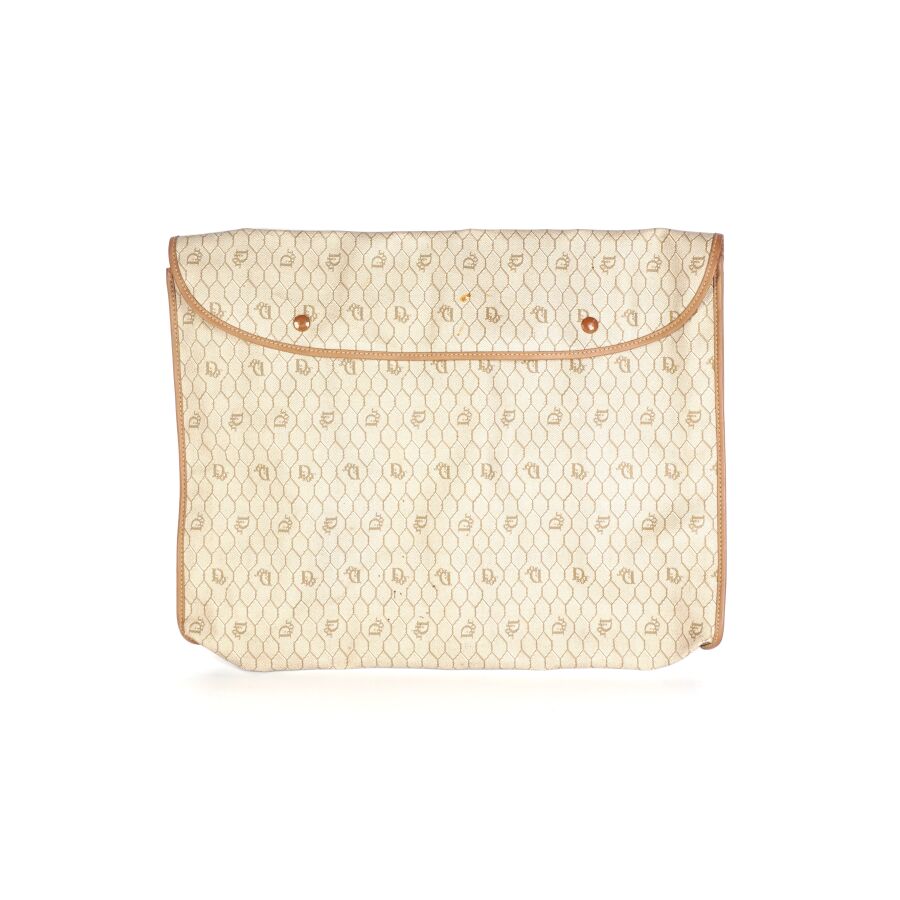 CHRISTIAN DIOR : Pochette en cuir marron et toile monogrammée sur fond beige, rabat à fermeture par deux boutons pression, intérieur plastifié, Dim. 37.5 x 47 cm (quelques taches, usures au métal).