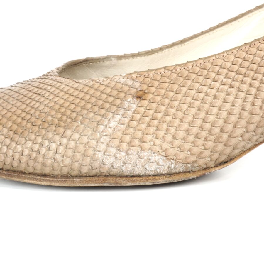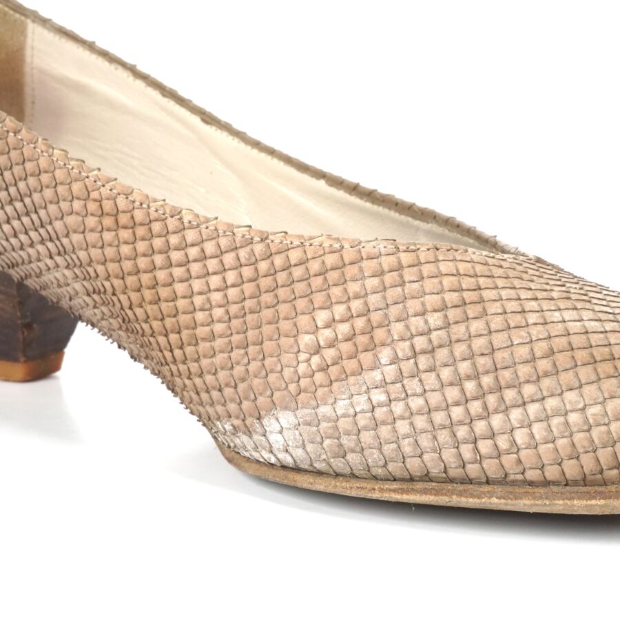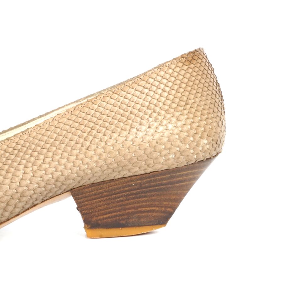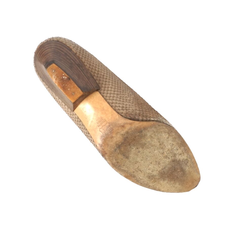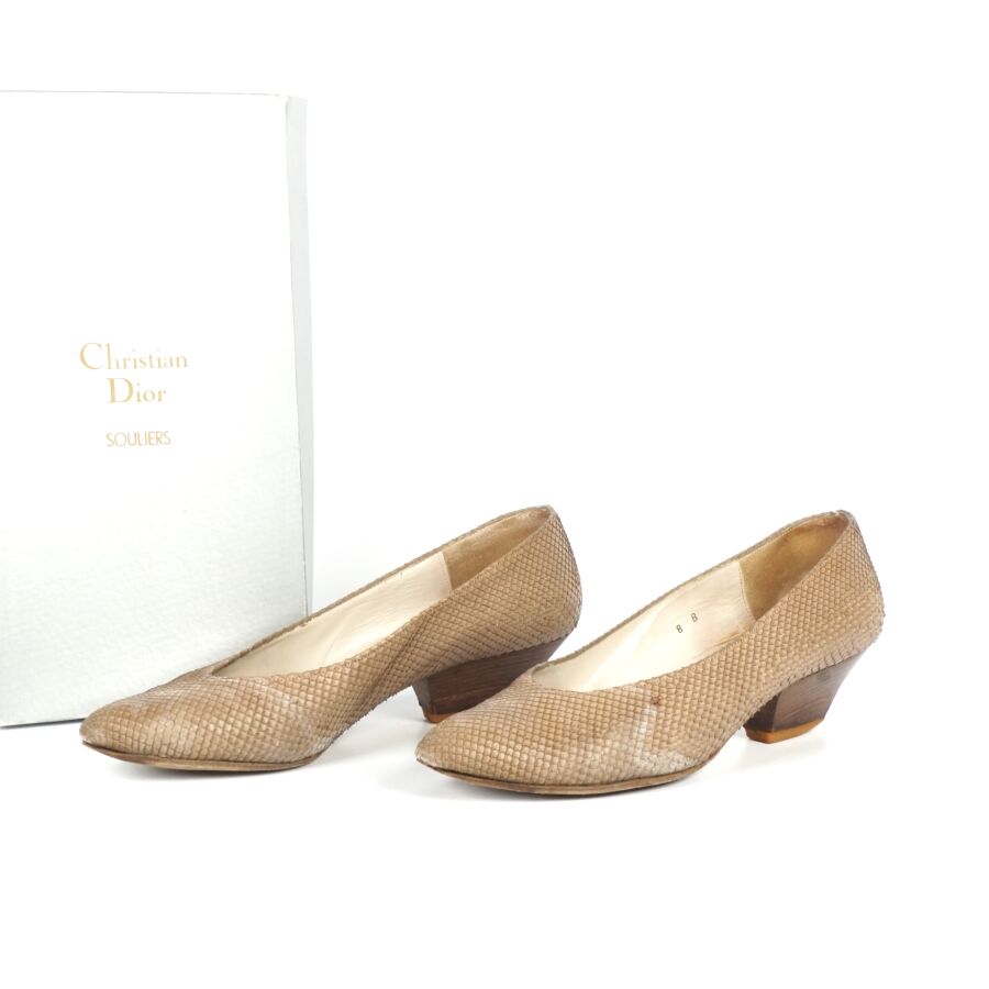 CHRISTIAN DIOR - SOULIERS : Paire d'escarpins à talon bas en serpent brun-beige et cuir, talon bois, taille supposée 40, présentée dans sa boîte d'origine, H. Talon : 4 cm. L. Totale : 25.5 cm (en l'état, taches, usures).