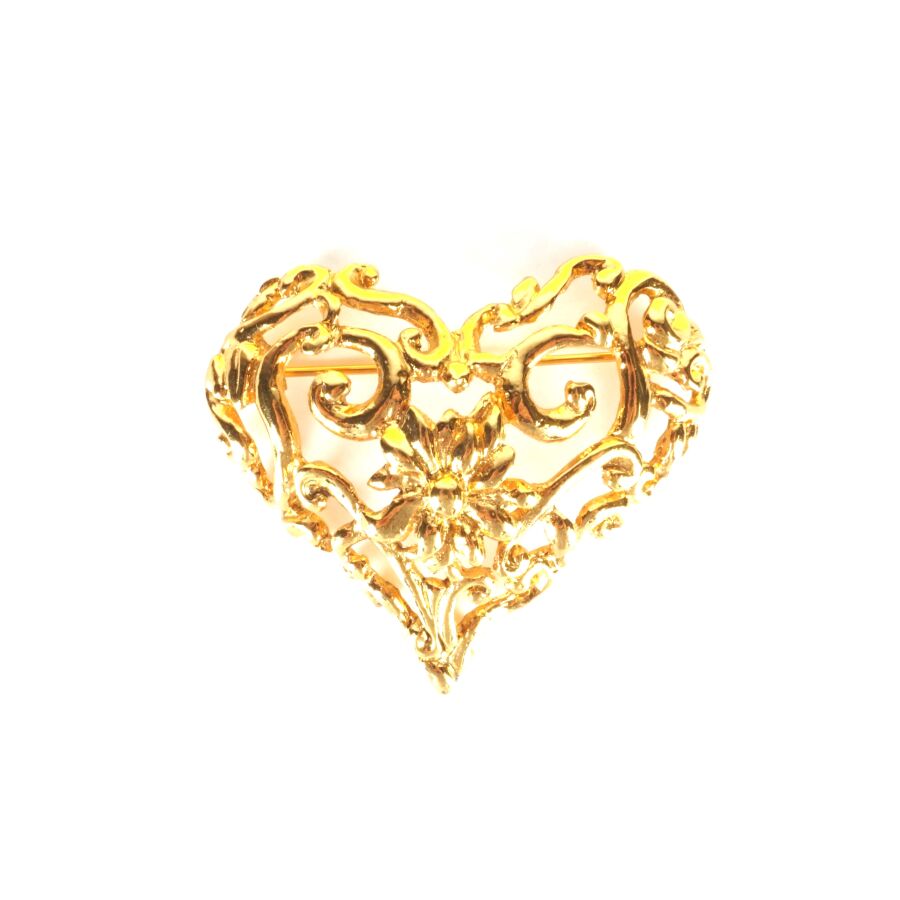 CHRISTIAN LACROIX : Broche "Coeur" en métal doré à motif ajouré d'une fleur et d'entrelacs, signée, Dim. 6 x 5.5 cm.