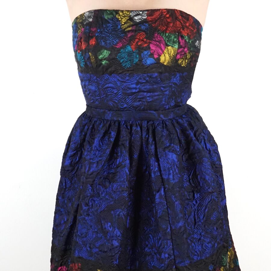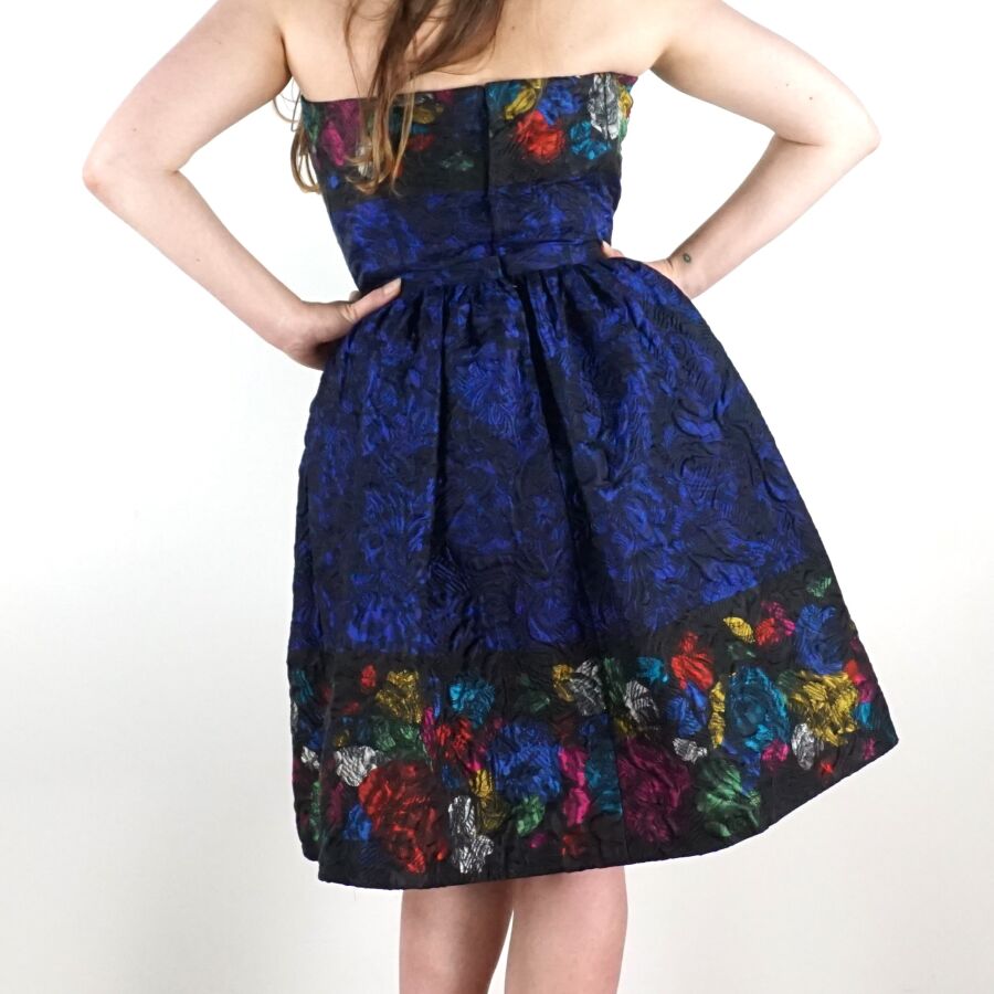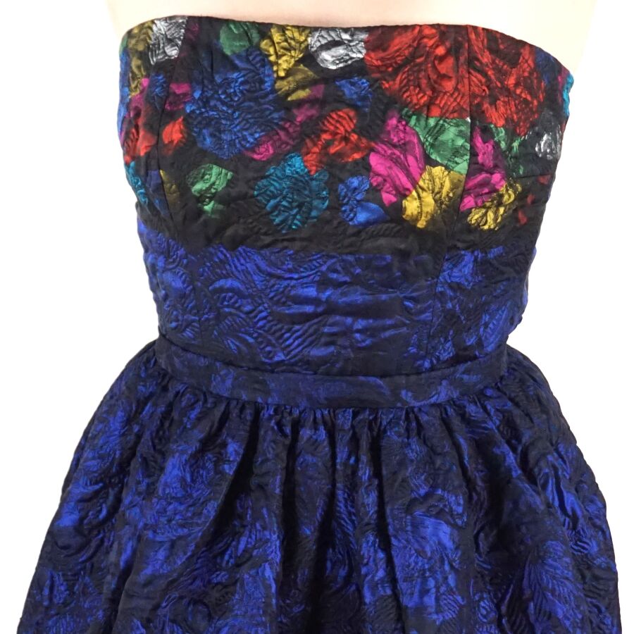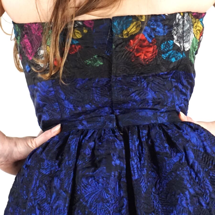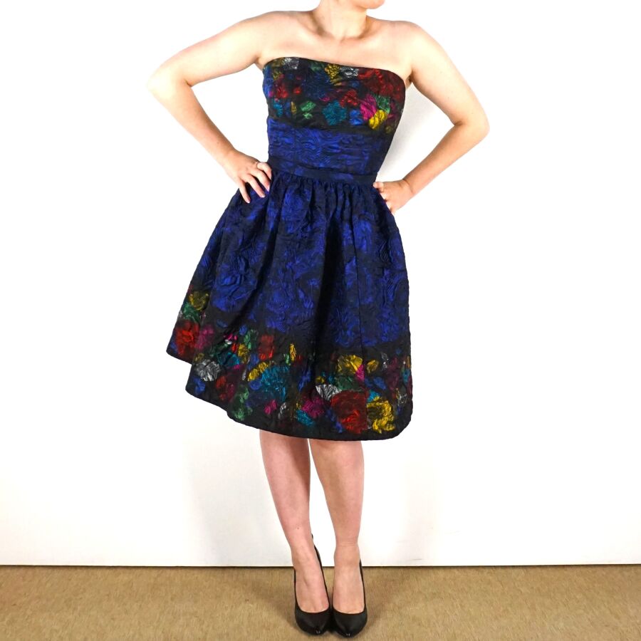 CHRISTIAN LACROIX : Ensemble en soie polychrome à décor de motifs floraux sur fond bleu foncé comprenant un top bustier, fermeture zippée à l'arrière et sa jupe évasée, fermeture zippée à l'arrière, doublure noire, taille supposée M, sans étiquette, H. Bustier : 35.5 cm. L. Jupe : 57.5 cm.