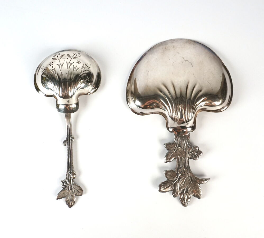 CHRISTOFLE : Couverts de service à fraises en métal argenté, comprenant une pelle à fraises et une cuillère saupoudreuse, à décor de branches de fraisiers, L. 15.5 et 16.3 cm.