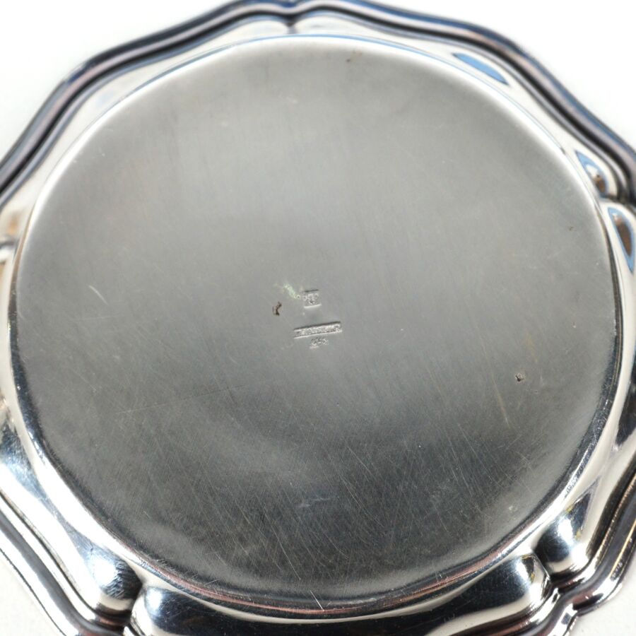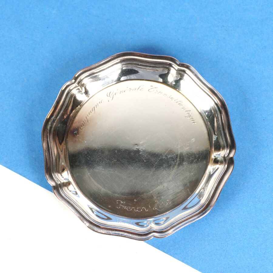 CHRISTOFLE : Deux dessous de bouteille en métal argenté, bordure festonnée à décor au filet, portant l'inscription "Compagnie Générale Transatlantique", marqués dessous, D. 8.5 cm.