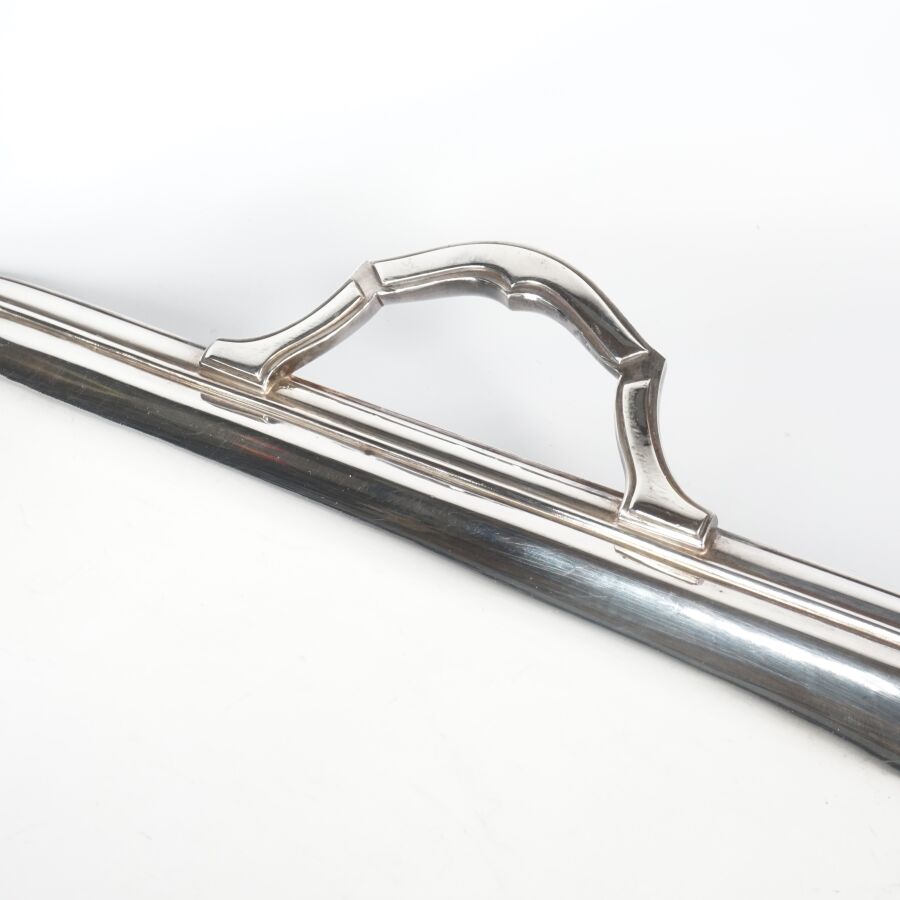 CHRISTOFLE : Grand plateau de service de forme rectangulaire en métal argenté, à deux anses, gravé au centre d'une ancre au dauphin, L. 57 cm (petites usures).