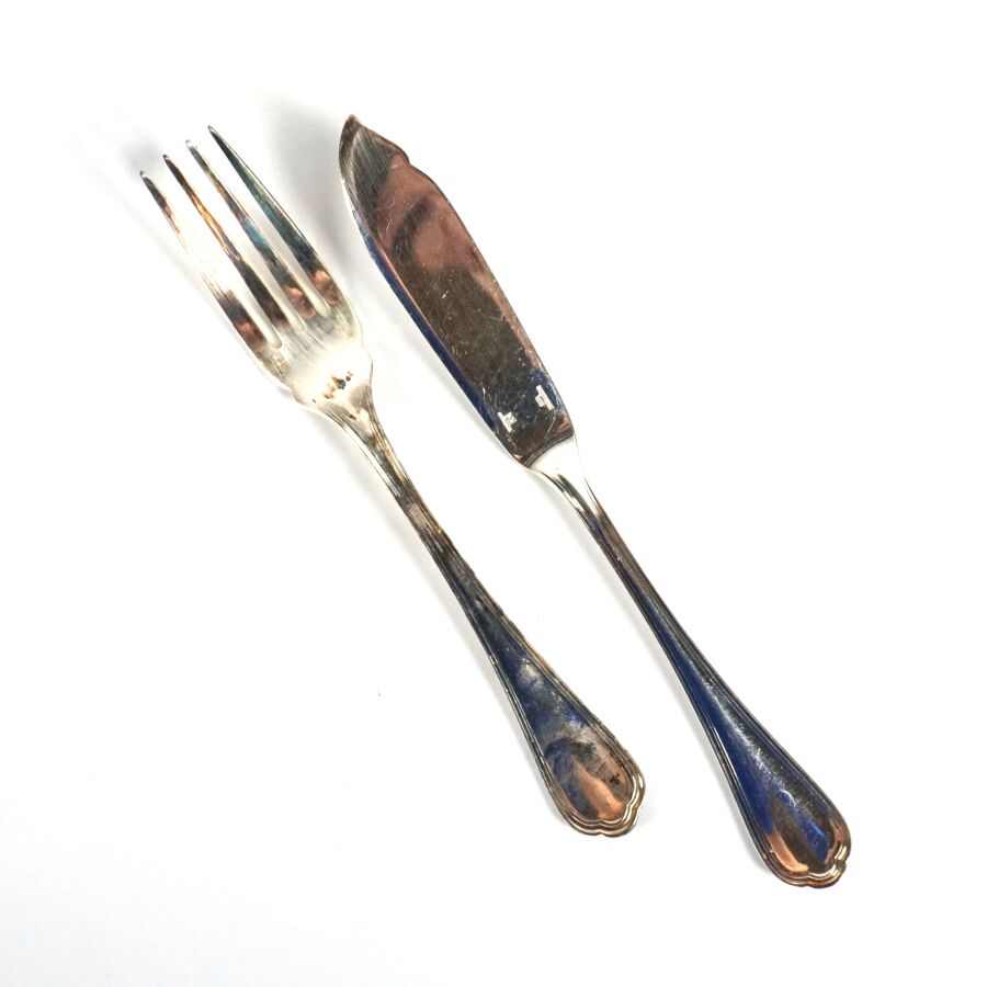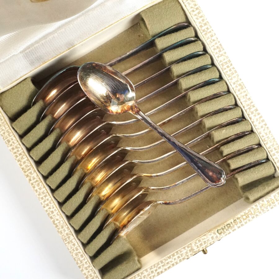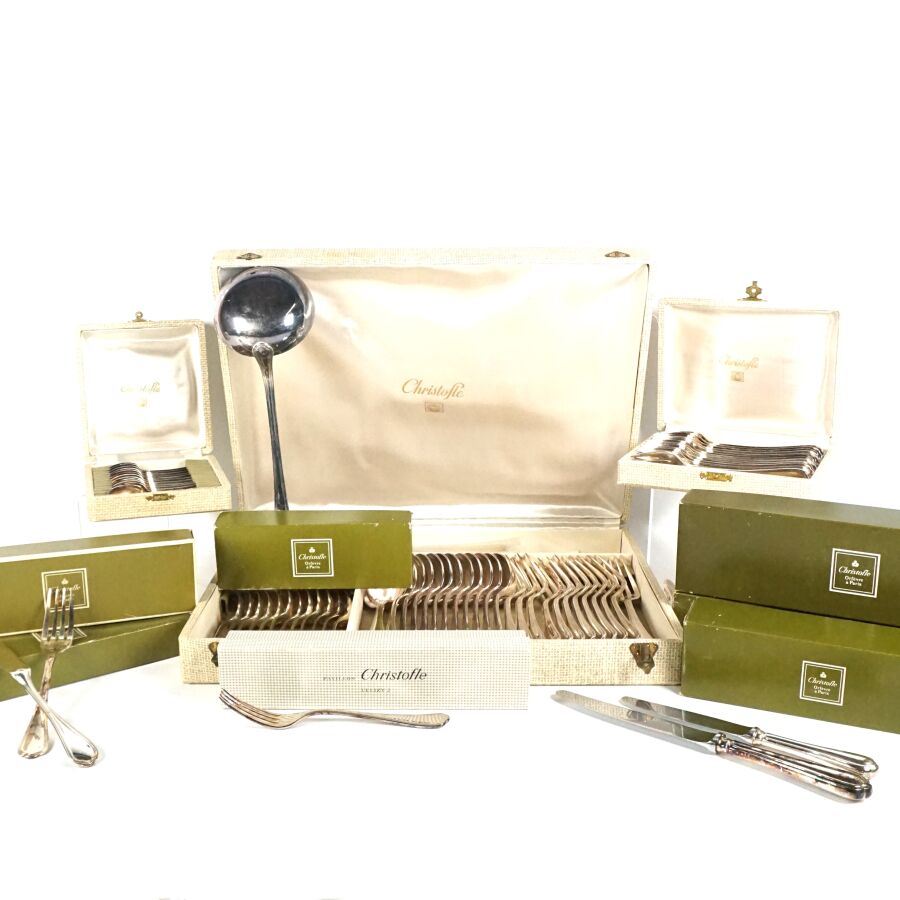 CHRISTOFLE : Ménagère modèle "Spatours" en métal argenté à décor au double filet comprenant 12 couverts, 12 cuillères à café, 1 louche, 12 fourchettes à gâteau, 1 couvert de service, 1 couvert de service à poisson, 12 couteaux à entremets, 12 couverts à poisson, 12 couteaux de table, 12 fourchettes à entremets, 12 cuillères à moka et 12 fourchettes à huîtres, présentée en boîtes et coffrets d'origine.