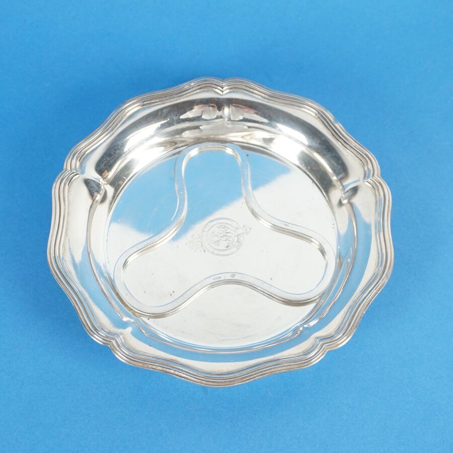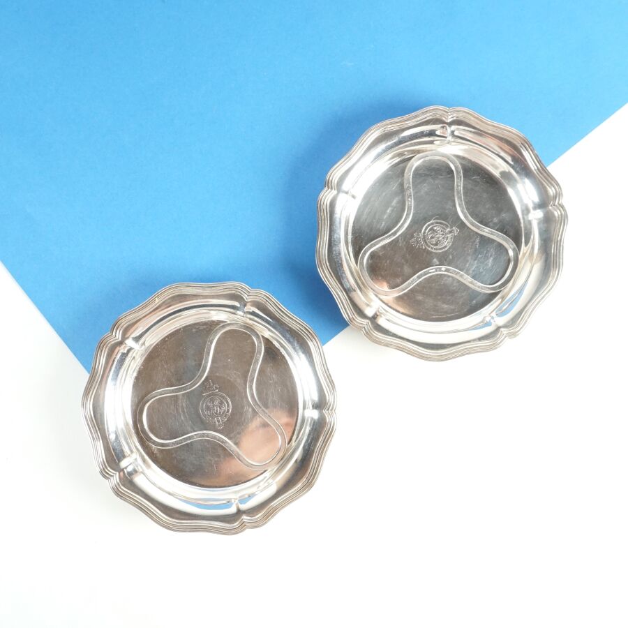 CHRISTOFLE : Paire de dessous de bouteilles, métal argenté à bords polylobés, Diam. 15.3 cm.