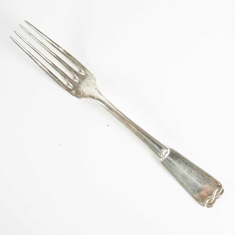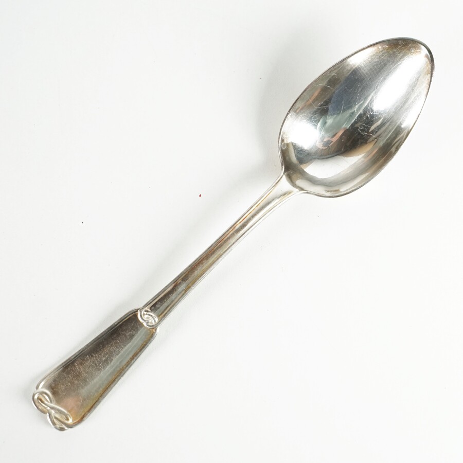 CHRISTOFLE : Partie de ménagère en métal argenté, comprenant douze couverts et une louche, décor chiffré sur le manche, présentée en coffret (usures, désargenté).