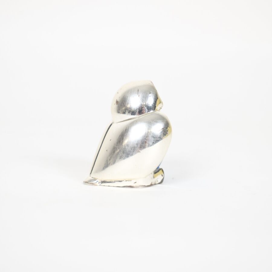 CHRISTOFLE : Petit sujet représentant une chouette en métal argenté ornée de cristal bleu, signé, H. 4 cm