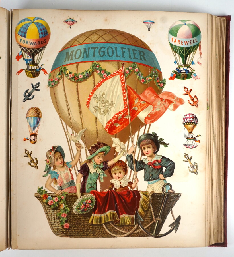 [CHROMOLITHOGRAPHIES] - Album XIXème (daté en chiffre en chromos à la 2nde page de garde : 1889) recueillant 1 belle collection de chromolithographies contrecollées sur 71 pages et classées par thématiques : portraits d'enfants, scènes enfantines, scènes bucoliques, scènes galantes, cirque, fleurs, personnages historiques, Noël, scènes de chasse, Pâques, musique, danse, têtes de bambins, châteaux, chats, chiens, bébés, angelots, navires, mer, Asie, oiseaux, - Toutes montées sur onglet sur papier fort - Reliure de l'époque demi-chagrin bordeaux, plats de velours rouge - Monogramme F. J. en lettres métalliques au 1er plat - Très bel état.